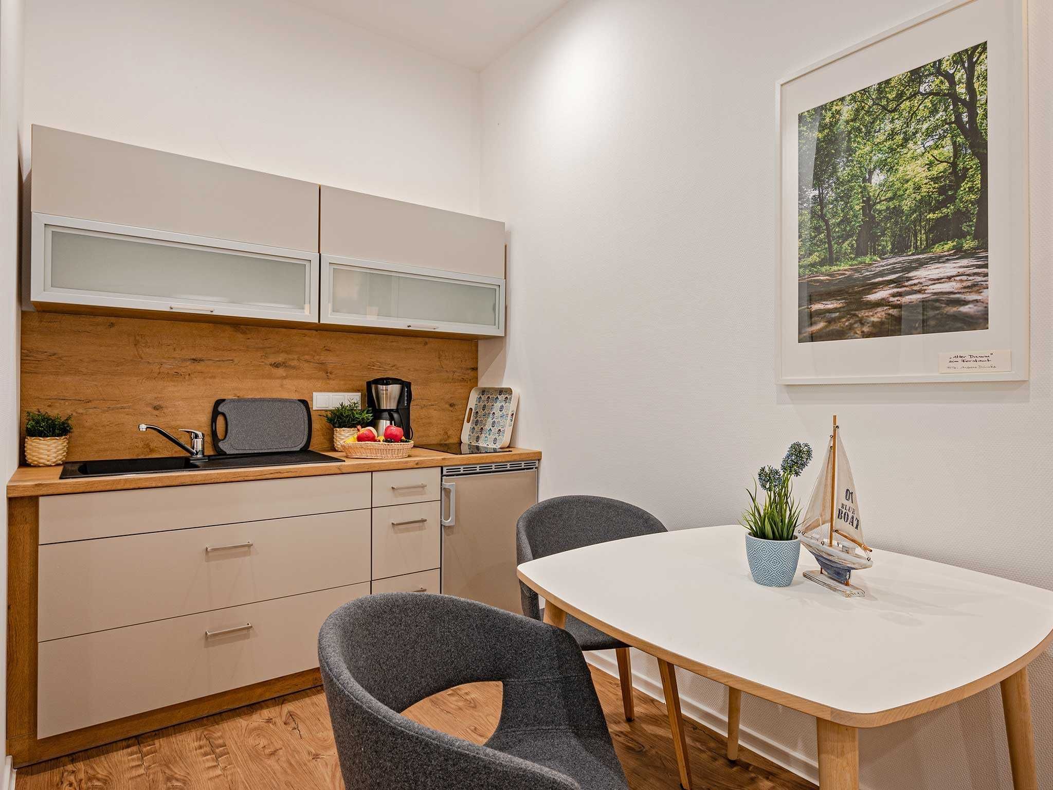 Eine Heizung ist vorhanden. Eine Sitzecke mit Sitzschutz befindet sich direkt vor der Ferienwohnung.