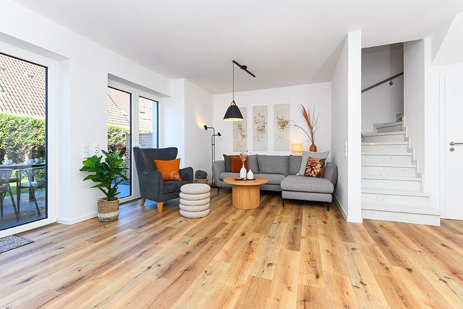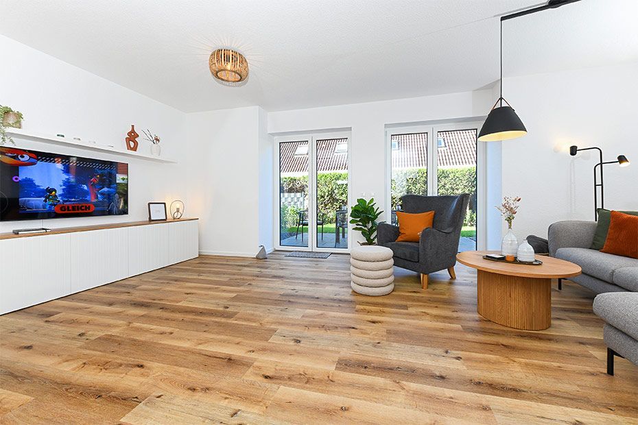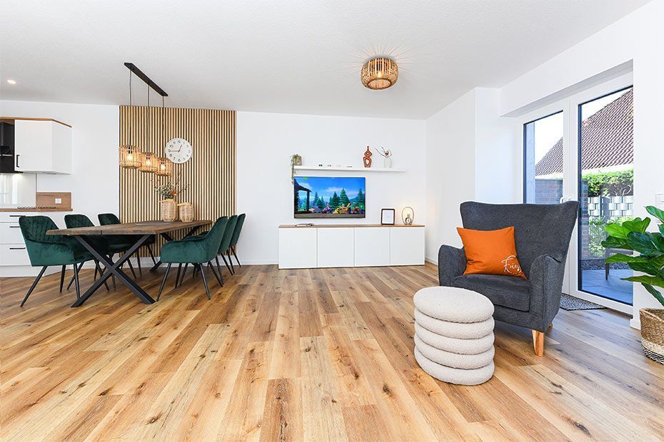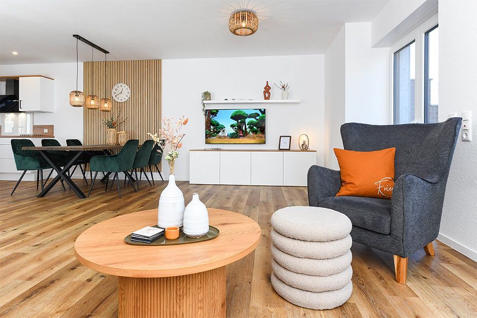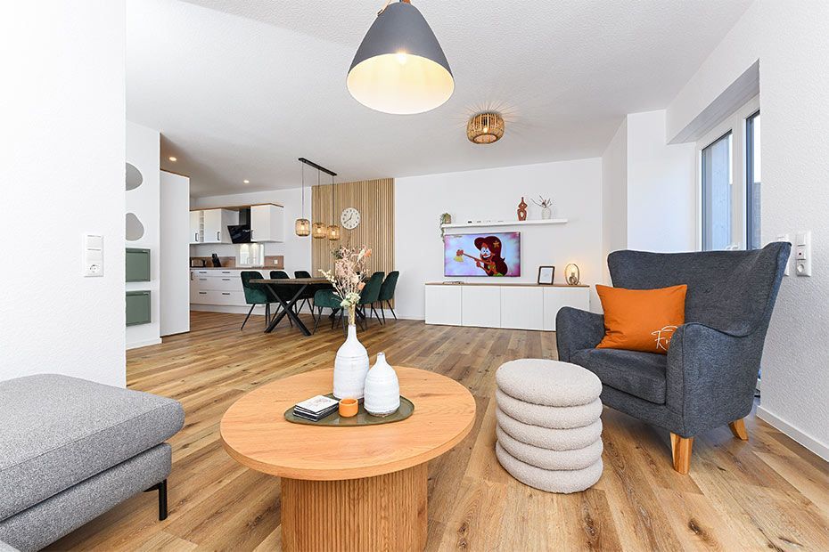 Wohnraum mit separatem Küchenteil bei offener Raumgestaltung
