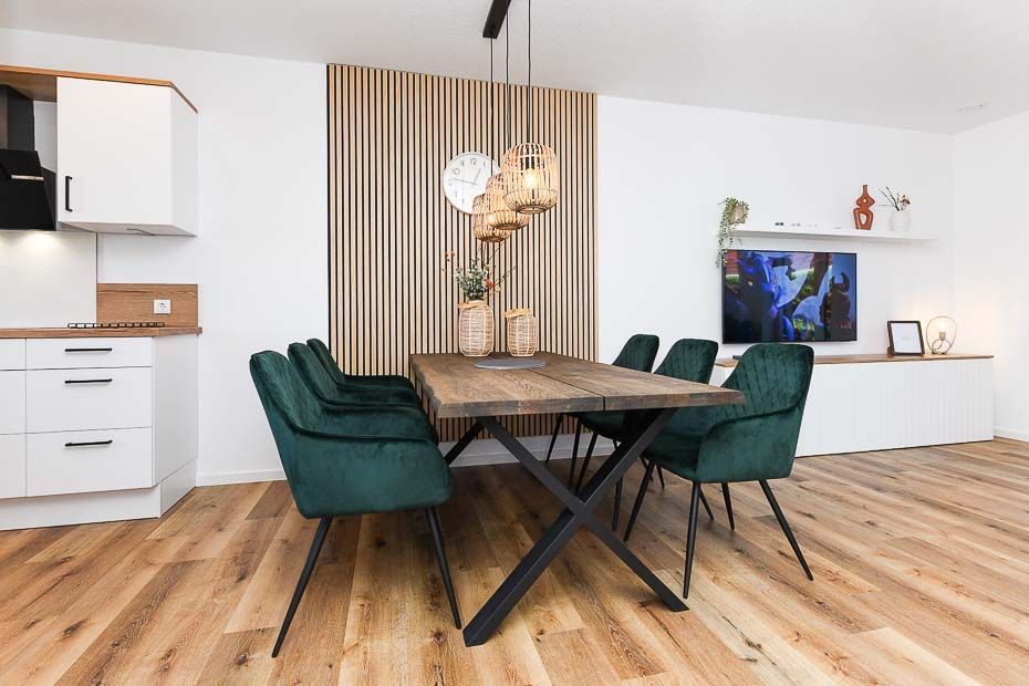 Es handelt sich bei diesem Ferienhaus um ein geräumiges ungefähr 100 Quadratmeter großes Reihenhaus, dass für einen schönen Nordseeurlaub für bis zu 6 Personen bestens vorbereitet ist. Das Ferienhaus ist modern-gemütlich, hell und freundlich gestaltet und eingerichtet sowie äußerst hochwertig mit viel Liebe zum Detail ausgestattet. Es gibt zum Beispiel eine Terrasse und eine top ausgestattete moderne Küche mit Geschirrspülmaschine.