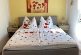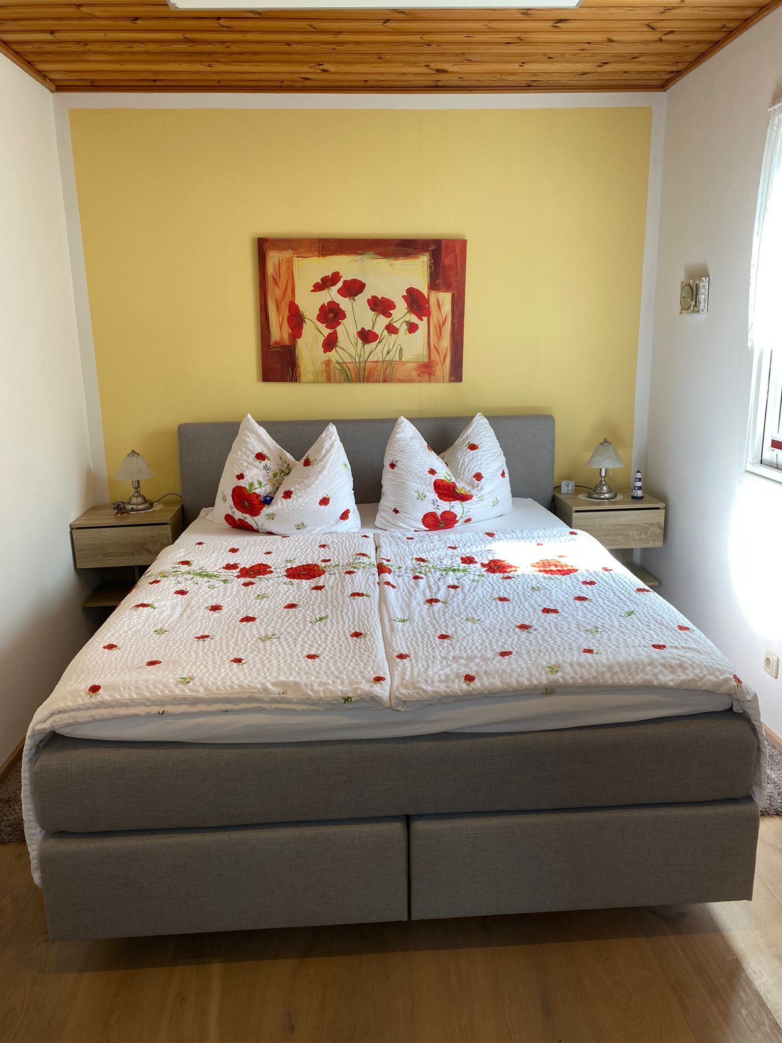 Das Schlafzimmer ist mit einem Boxspringbett (1,60m x 2,00m) ausgestattet.