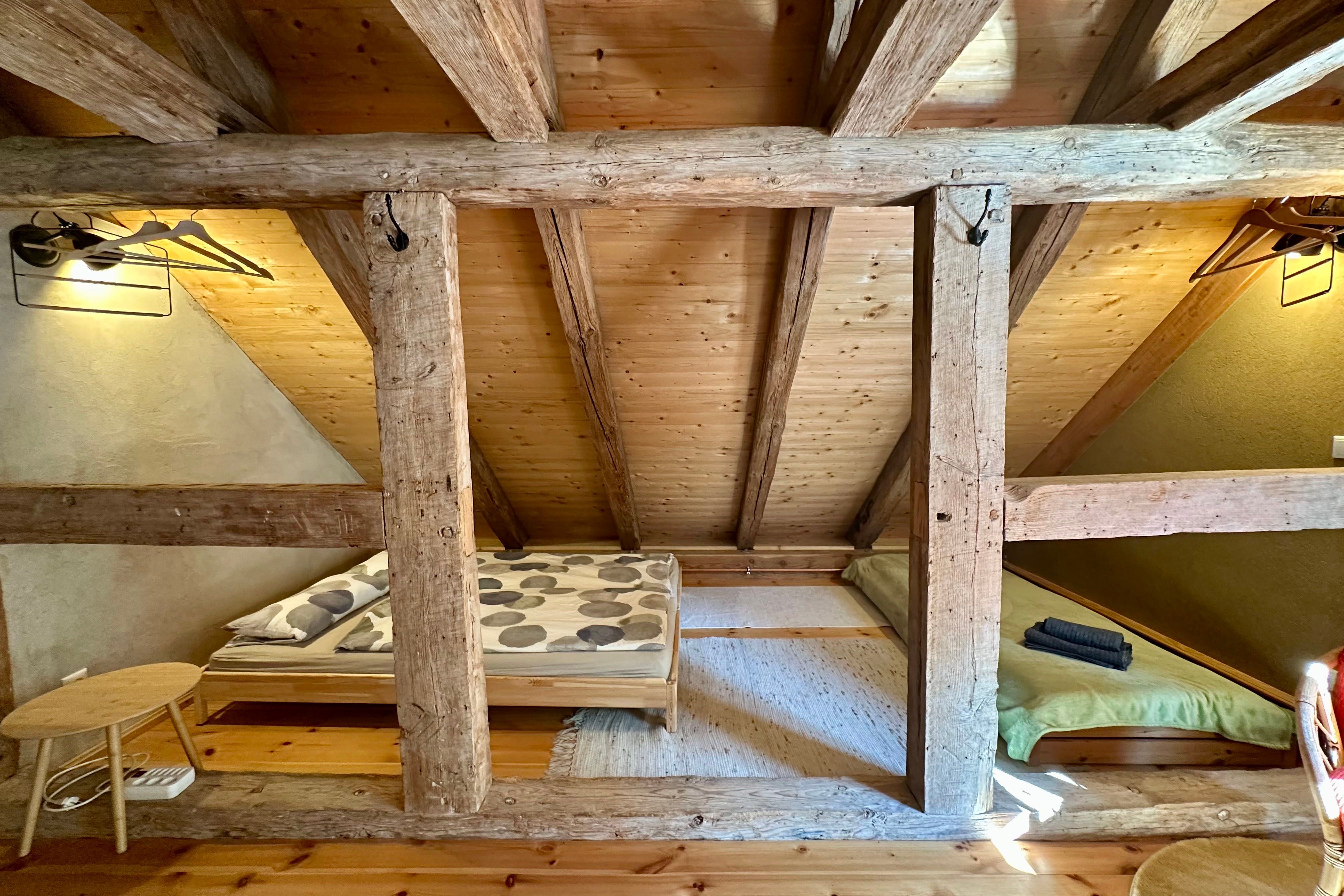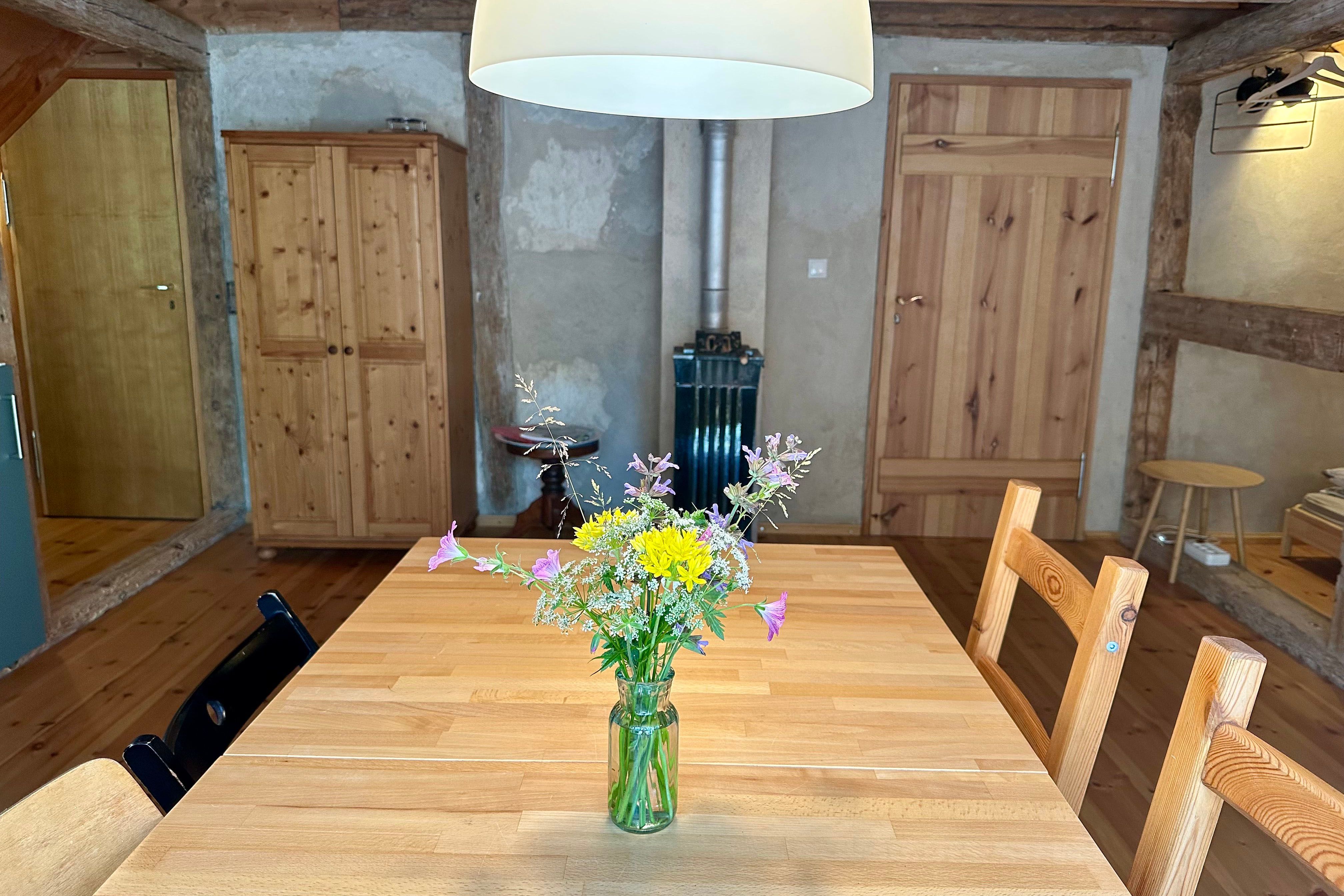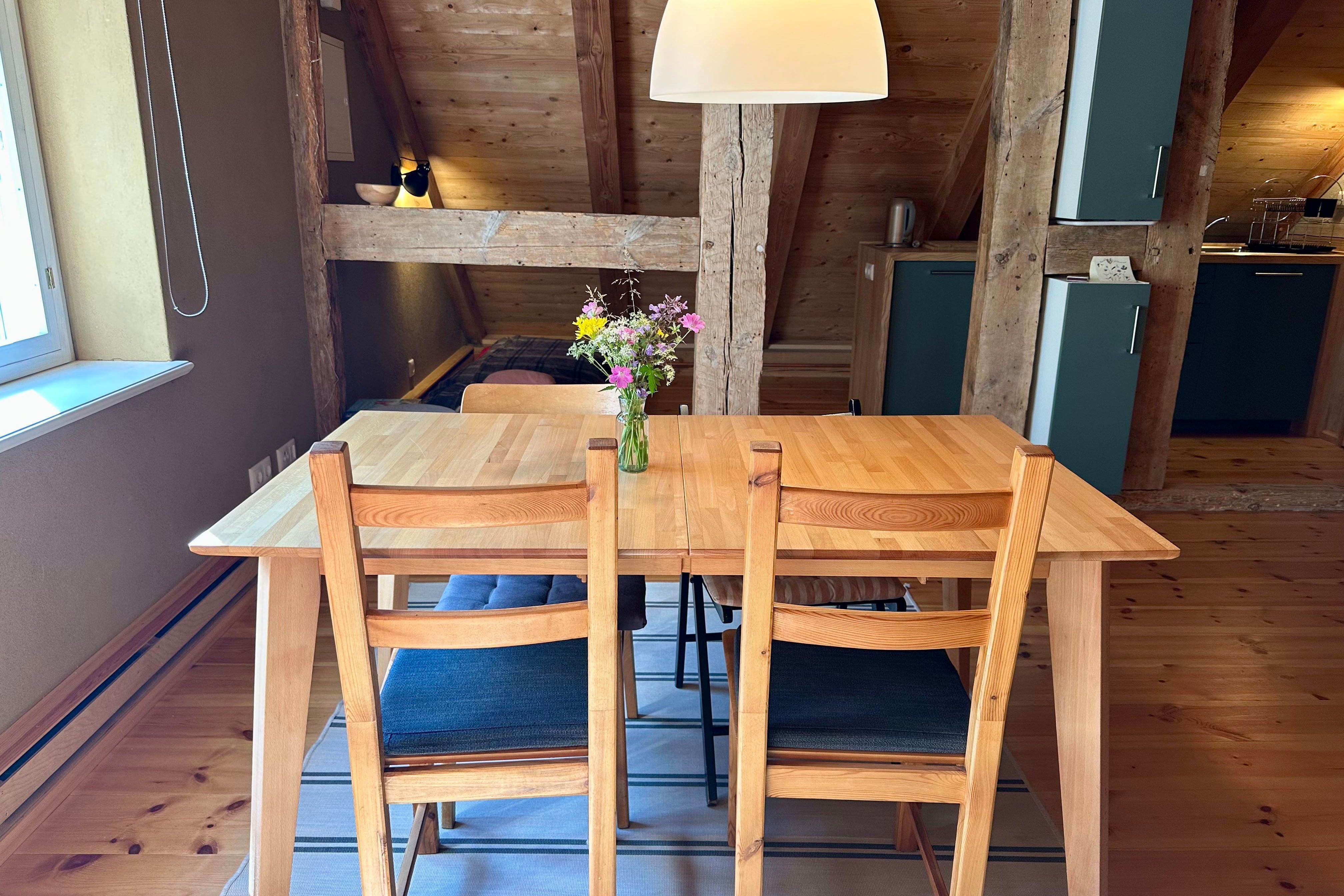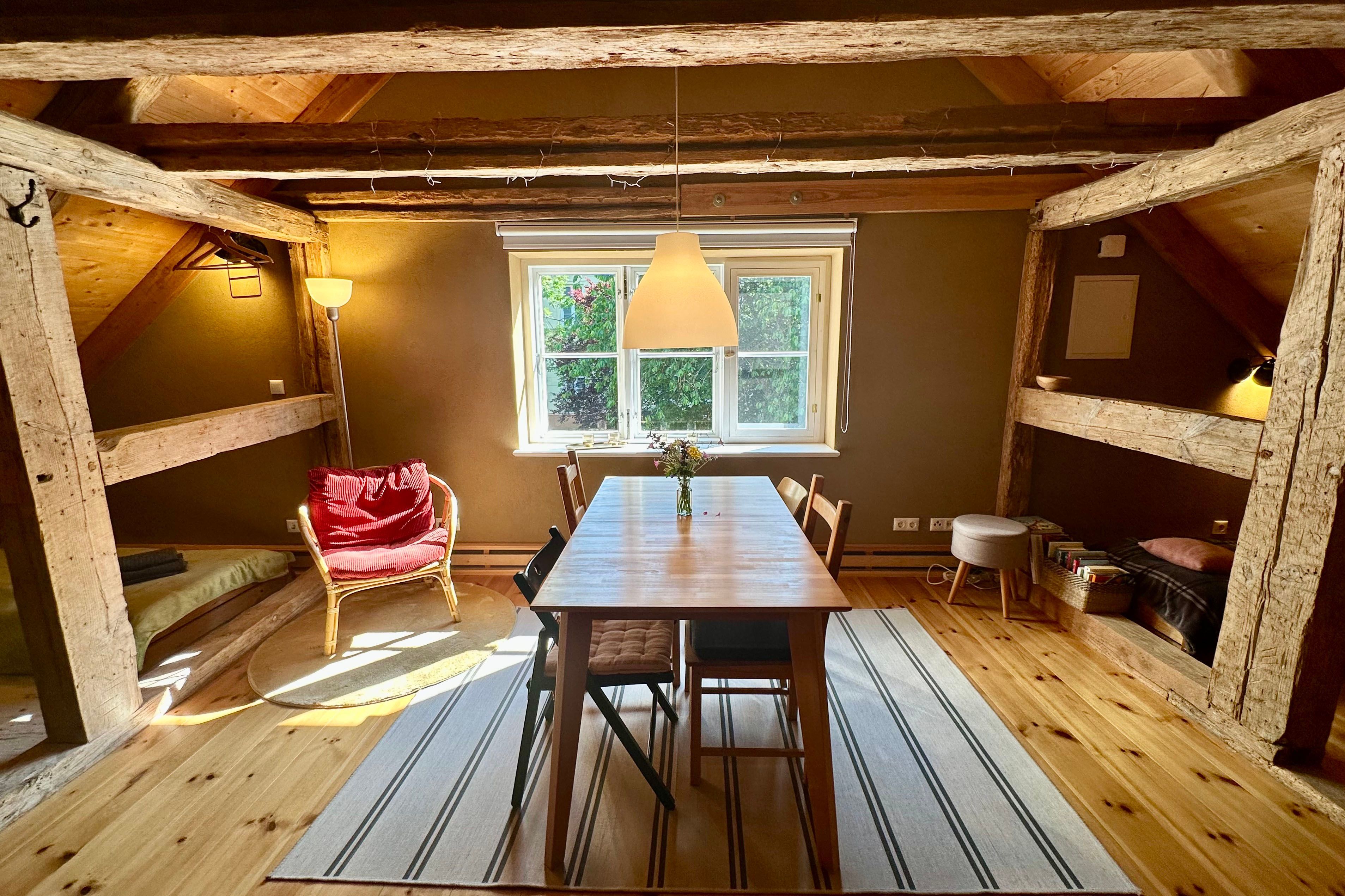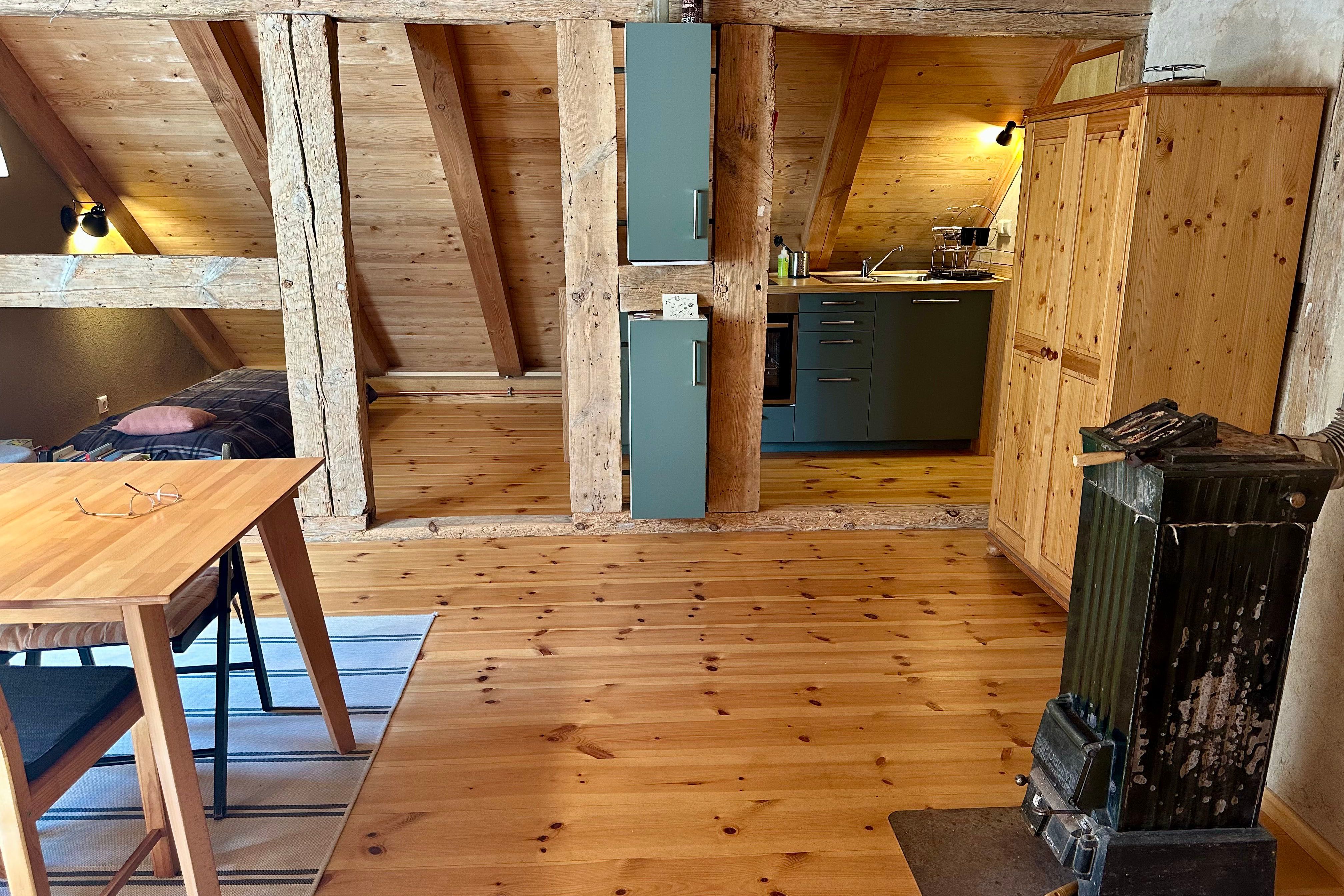Die charmante Dachgeschosswohnung erreichen Sie über eine rustikale Holztreppe. Die Wohnung wurde im Fachwerkstil mit viel Holz und nachhaltigen Materialien liebevoll saniert, wodurch eine gemütliche und einladende Atmosphäre entsteht.