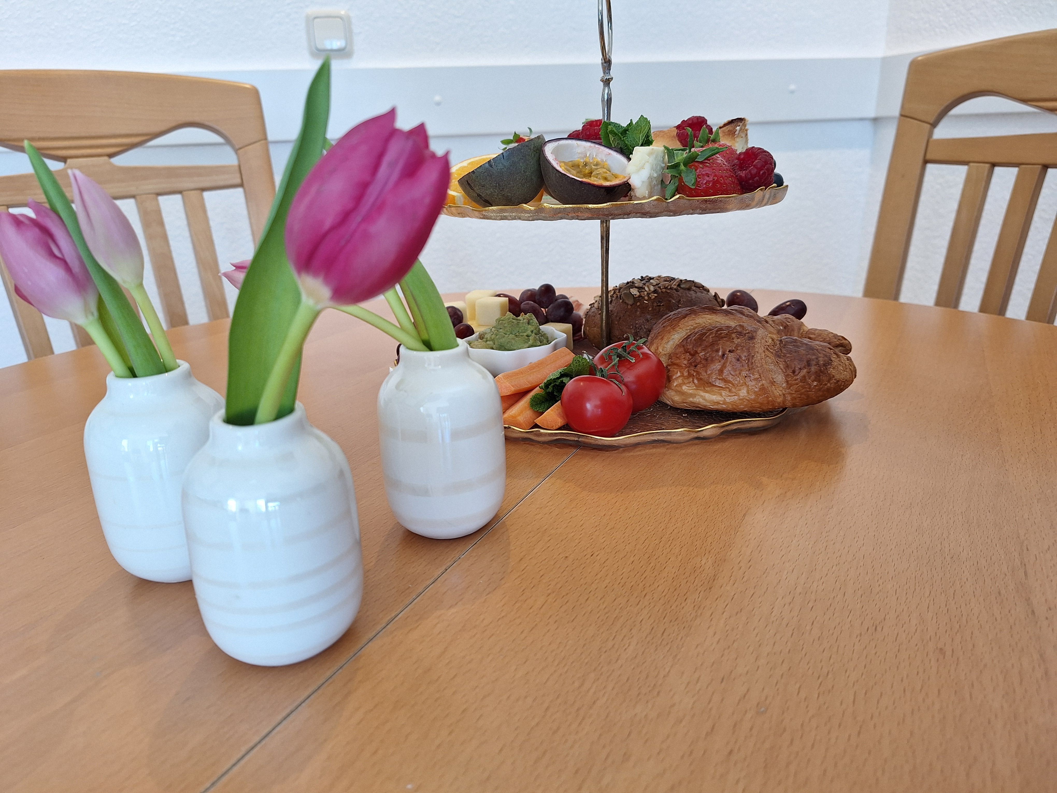 Essplatz mit Tisch und drei Stühlen für gemeinsame Mahlzeiten