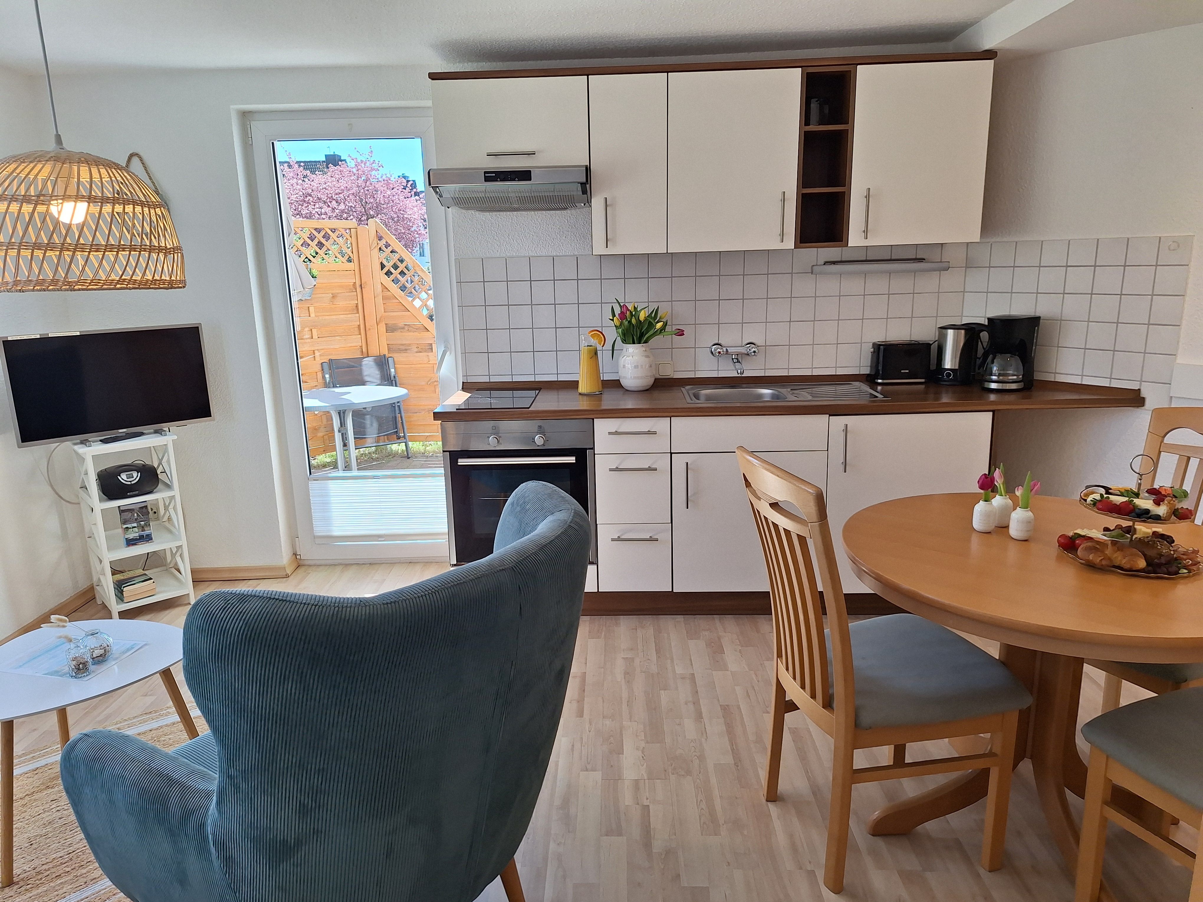 Die im Jahr 2016 neu rekonstruierte und 2021 liebevoll renovierte Ferienwohnung bietet Ihnen ein gemütliches Zuhause im Erdgeschoss eines Einfamilienhauses mit eigenem Eingang. Genießen Sie entspannte Stunden auf der sonnigen Terrasse, die mit bequemen Gartenmöbeln, einem Grill und einem Abstellplatz für Ihre Fahrräder ausgestattet ist.