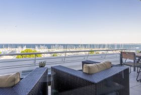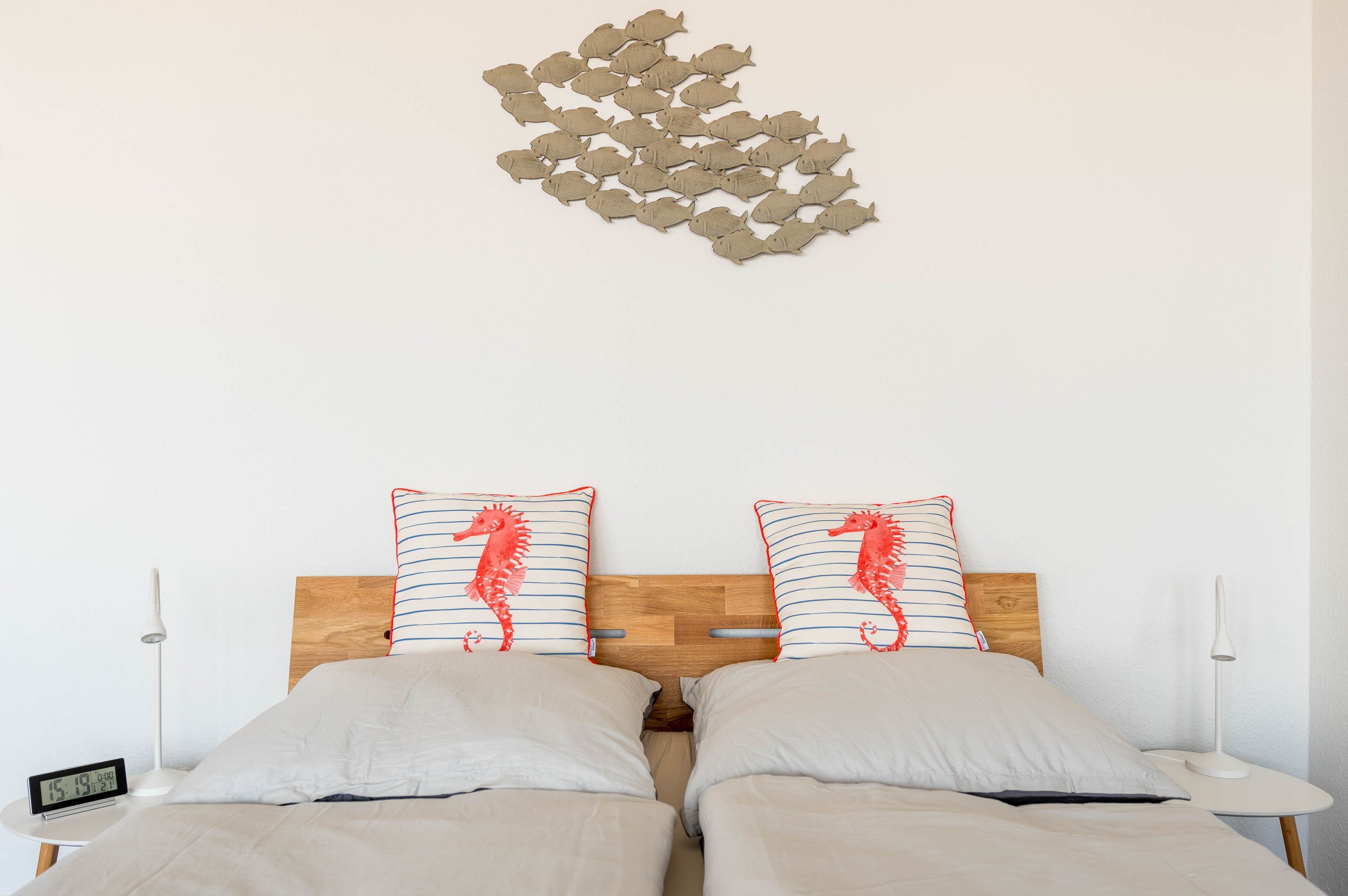Die Unterkunft lässt sich durch Rollos abdunkeln. Mit ein paar Handgriffen lässt sich die Couch in ein Schlafsofa mit der Liegefläche von 135x200cm umbauen. Hier kann eine Person zusätzlich übernachten. Der 12qm² große Balkon verfügt über einen robusten Gartentisch sowie vier Stühle und zwei Loungesesseln. Von hier lässt sich wunderbar der Hafen und das Treiben auf der Ostsee beobachten. Vor der Morgen- und Mittagssonne schützt eine ausfahrbare Markise.