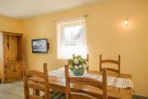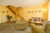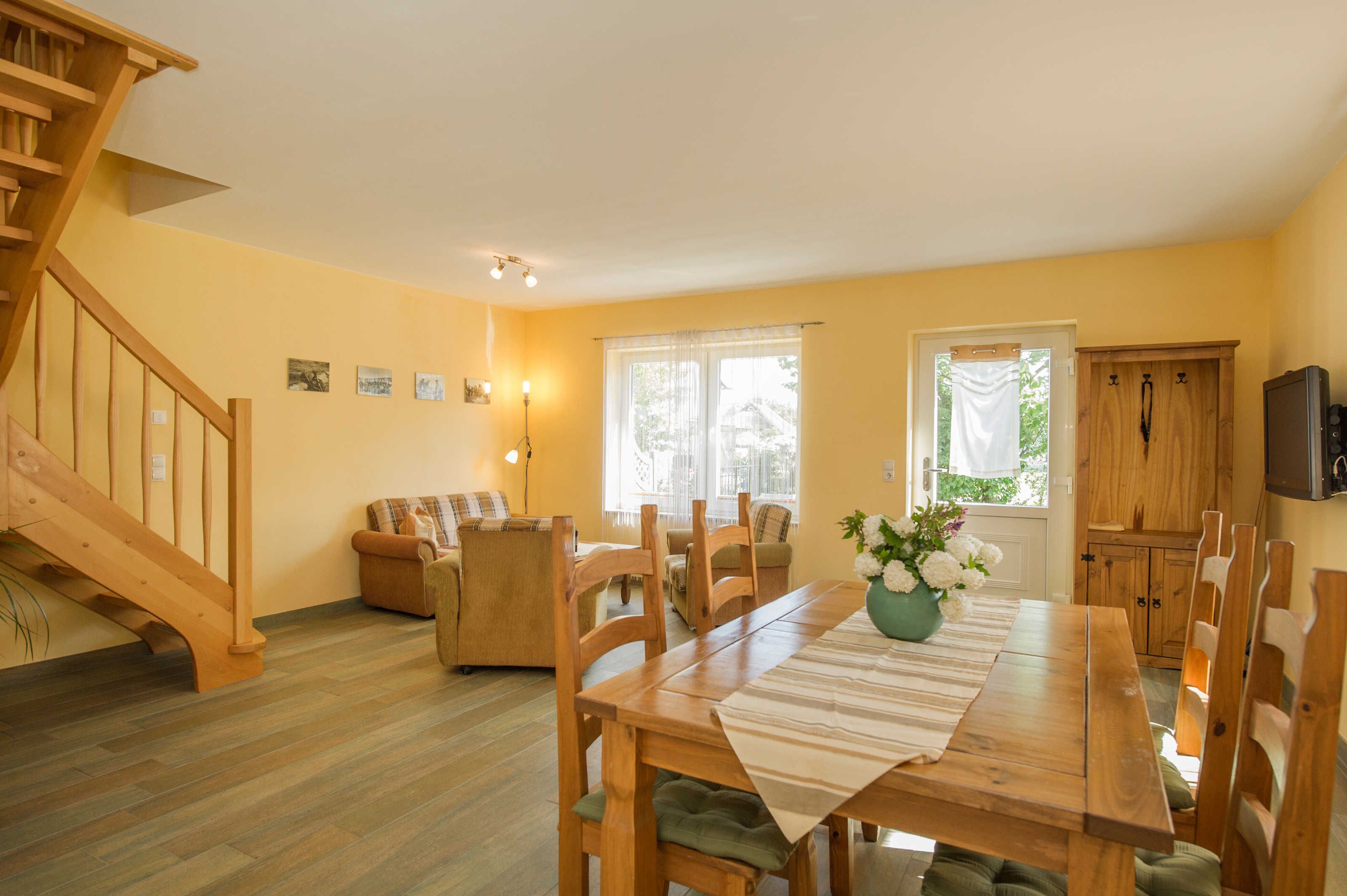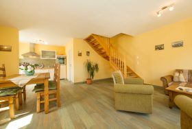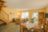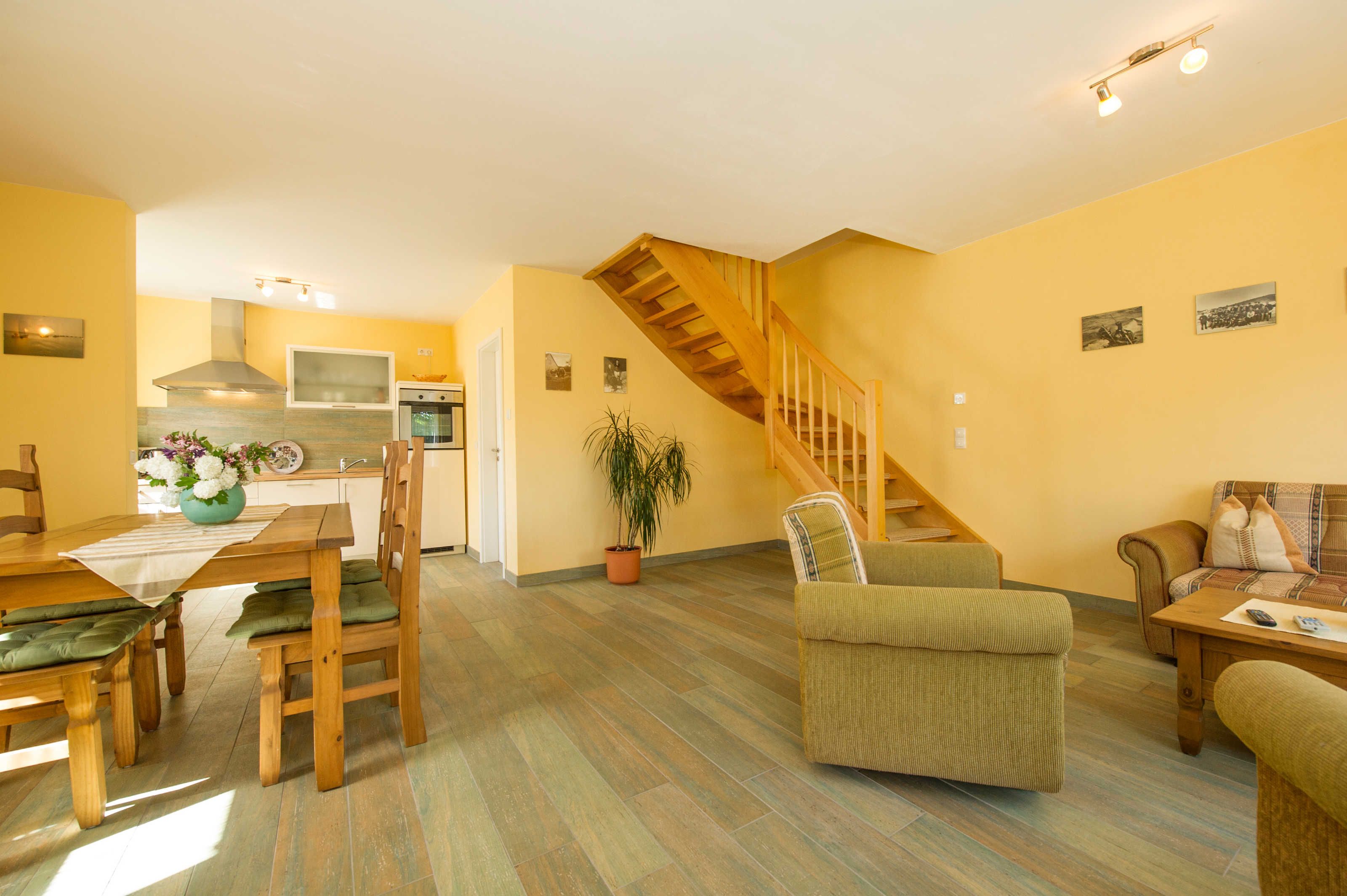 Im Erdgeschoss befindet sich ein großzügigen Wohnraum. Hier befindet sich eine Sitzcouch mit Tisch und Sessel und ein Flachbild-TV-Gerät sowie die Küchenzeile mit Esstisch und Stühlen. Die Küchenzeile ist mit einem Herd, Backofen, Geschirrspüler, Abzugshaube, Wasserkocher, Kaffeemaschine, Toaster, Spüle und Kühlschrank ausgestattet.