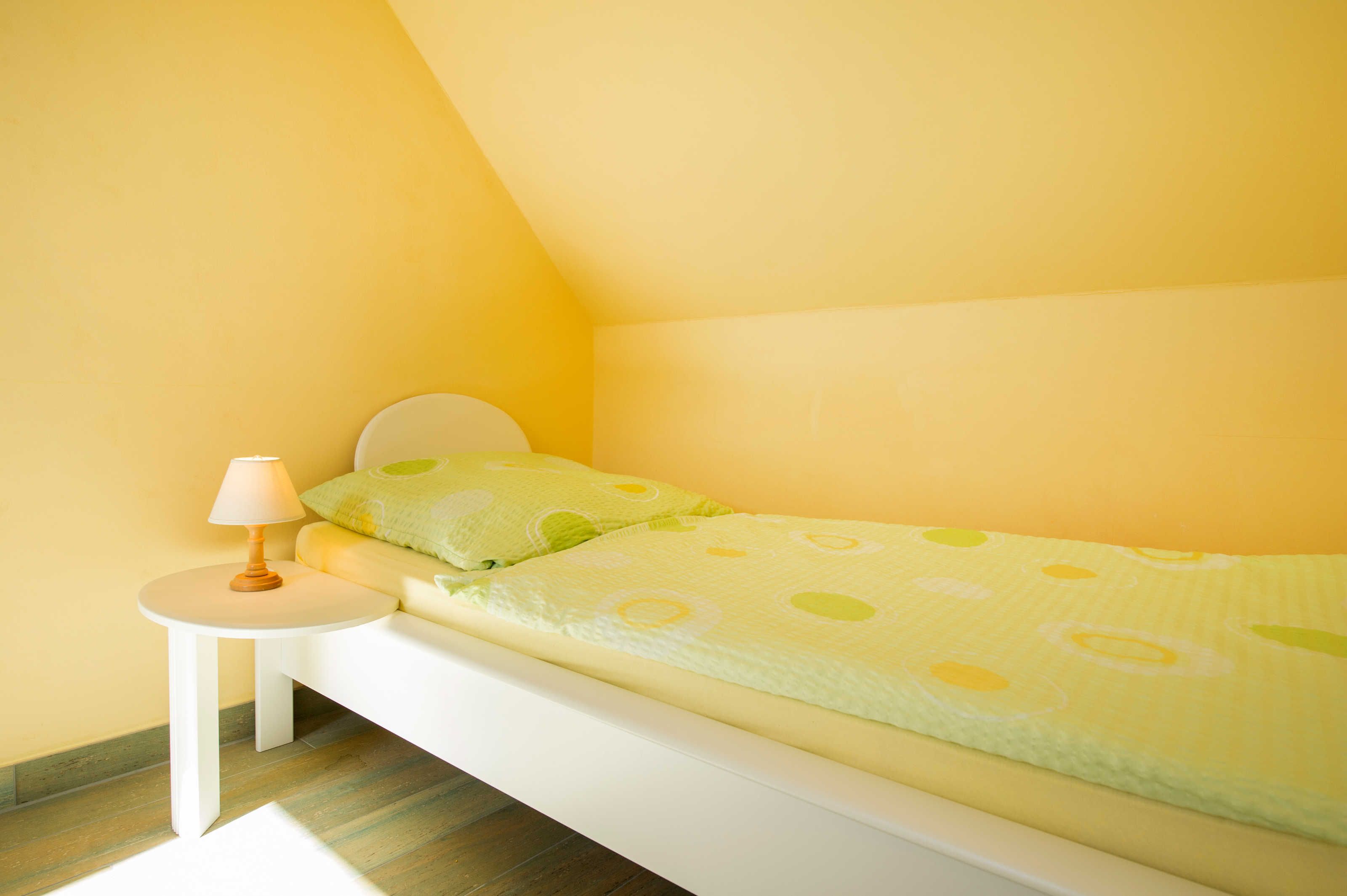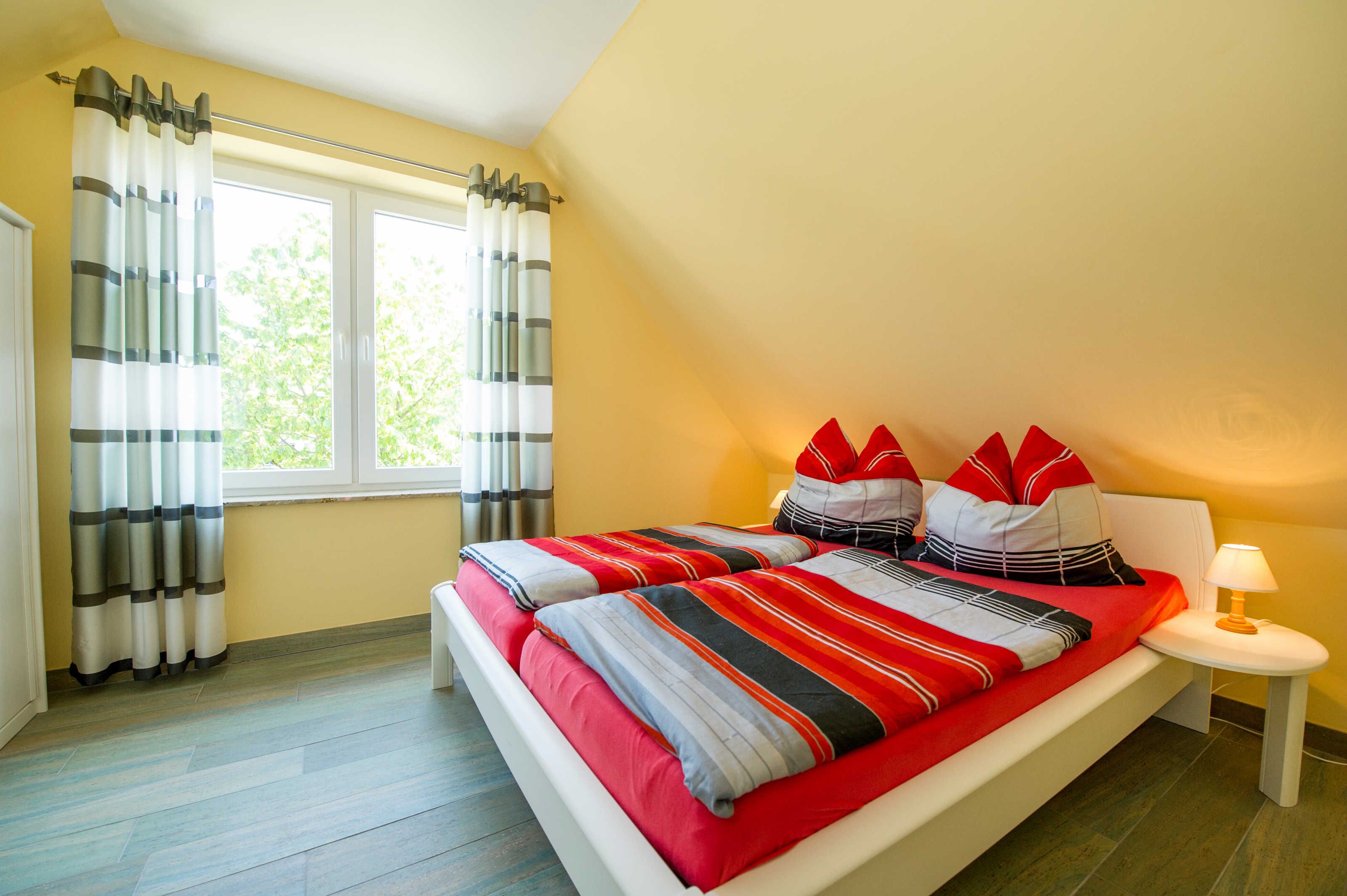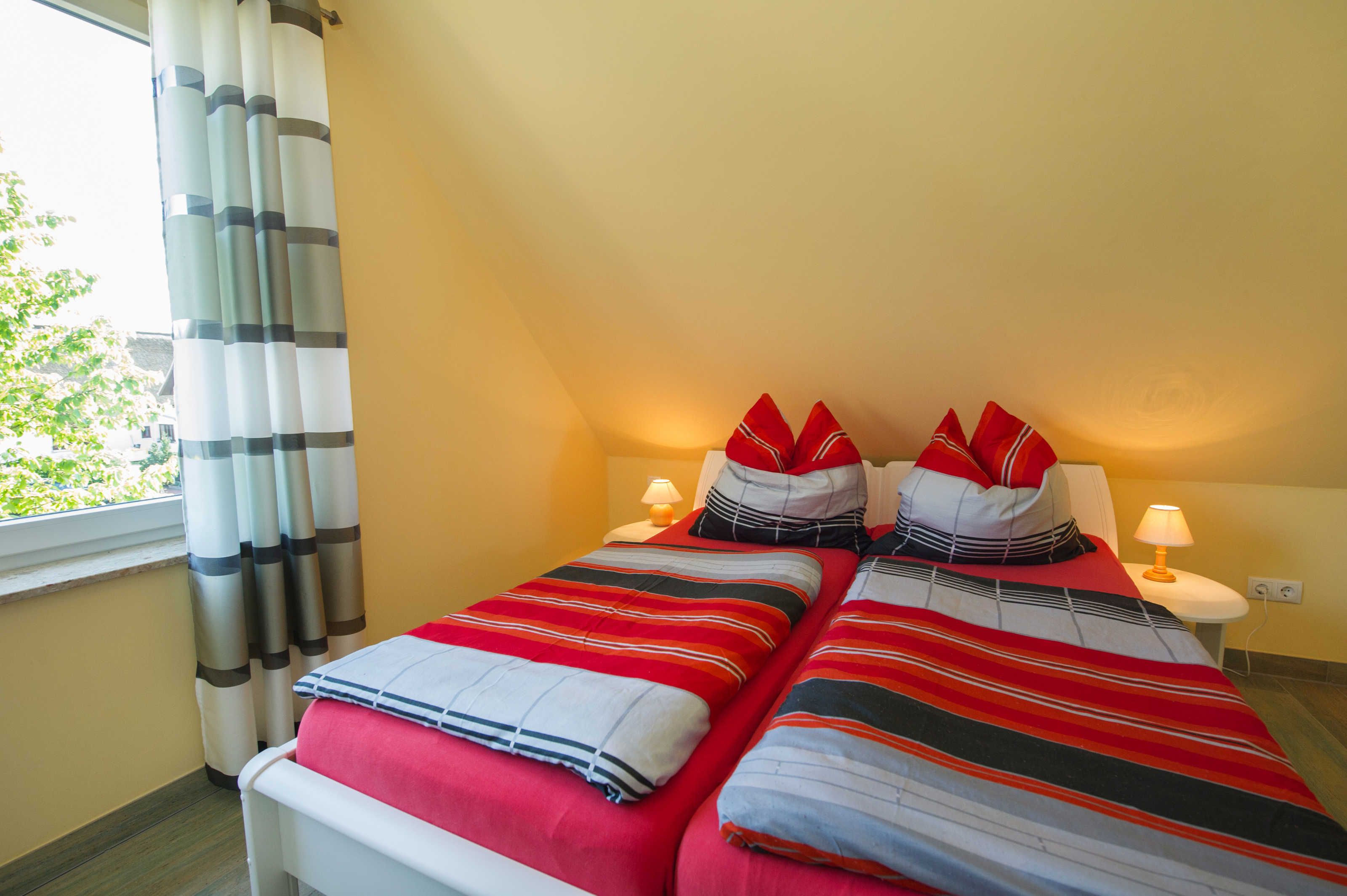 Über eine Treppe gelangt man in das Obergeschoss, in dem sich die beiden Schlafzimmer befinden. Das 1. Schlafzimmer bietet ein bequemes Doppelbett mit Nachttisch und Leselampen und einen Kleiderschrank. Das 2. Schlafzimmer ist mit einem Einzeletten, Nachttisch und Leselampe sowie Kleiderschrank ausgestattet.