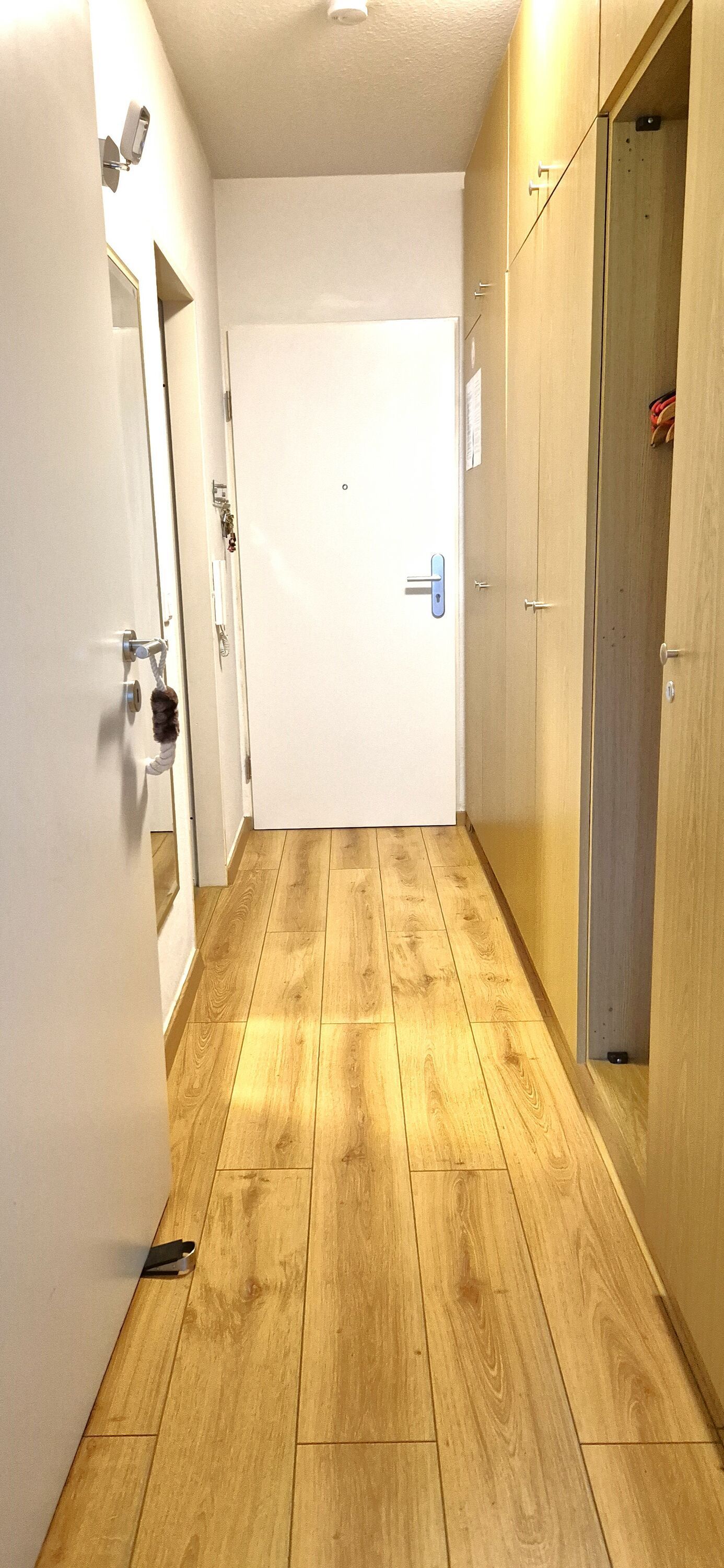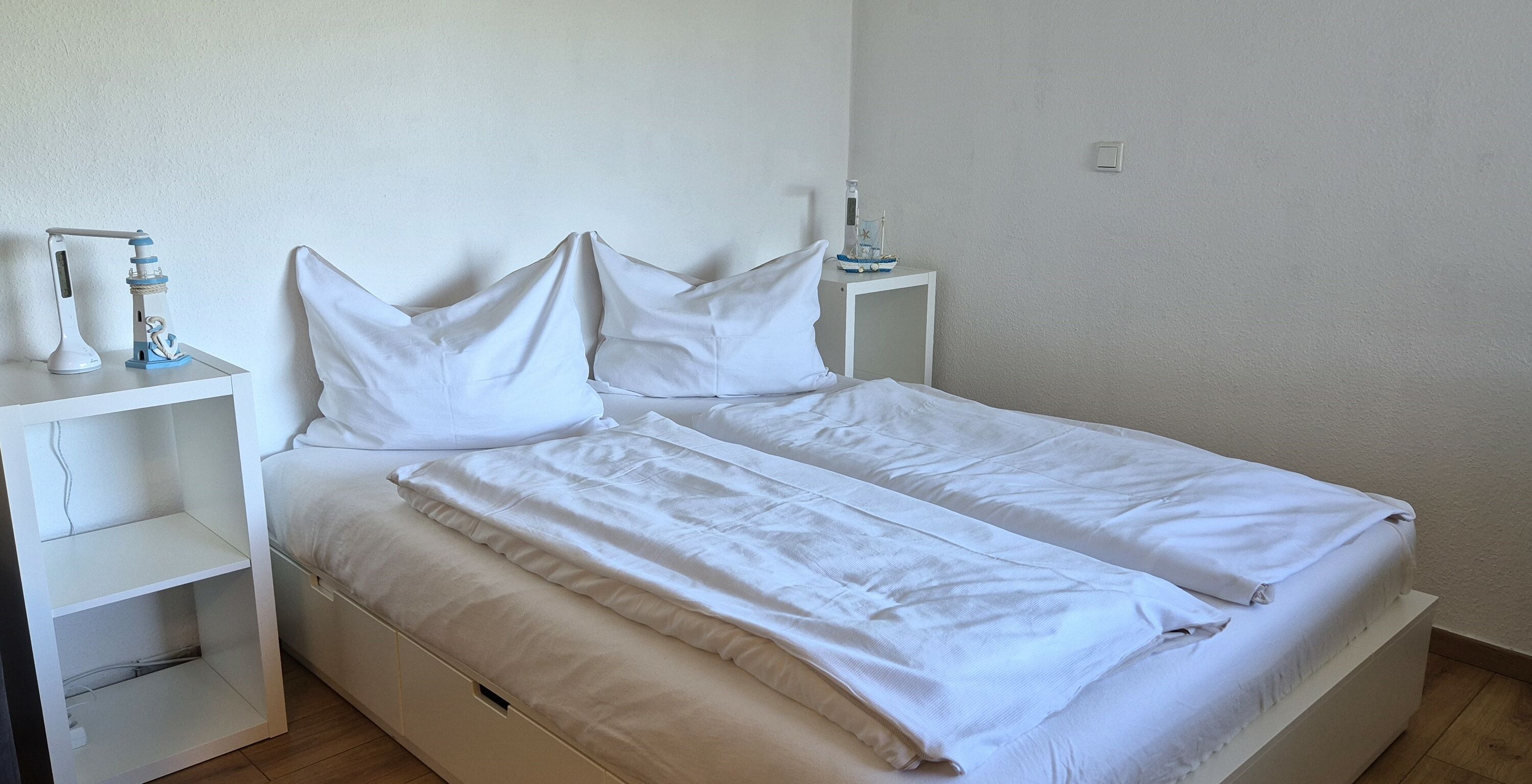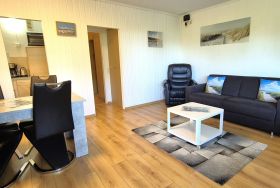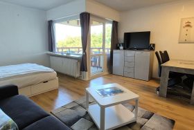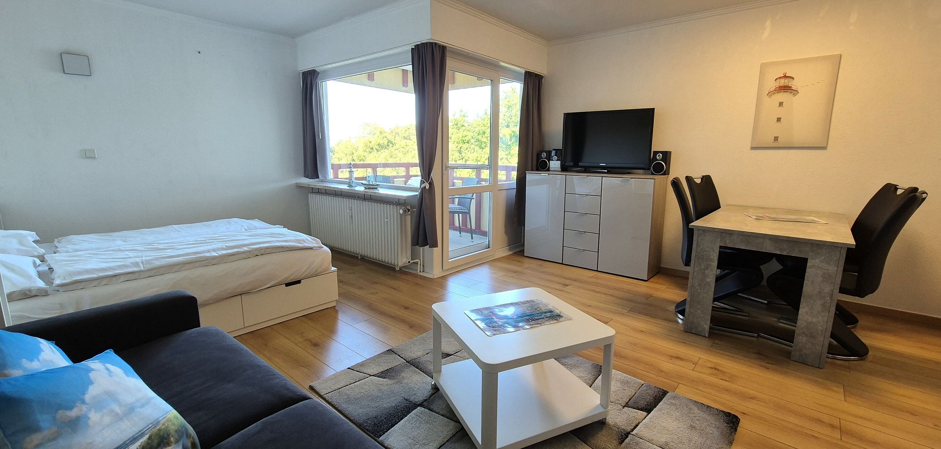 Das Appartement 46 ist ein 1-Raum-Apartment im 4. Obergeschoss für bis zu 4 Personen mit 38 qm. Der möblierte Westbalkon bietet morgens Schatten und nachmittags Sonne.