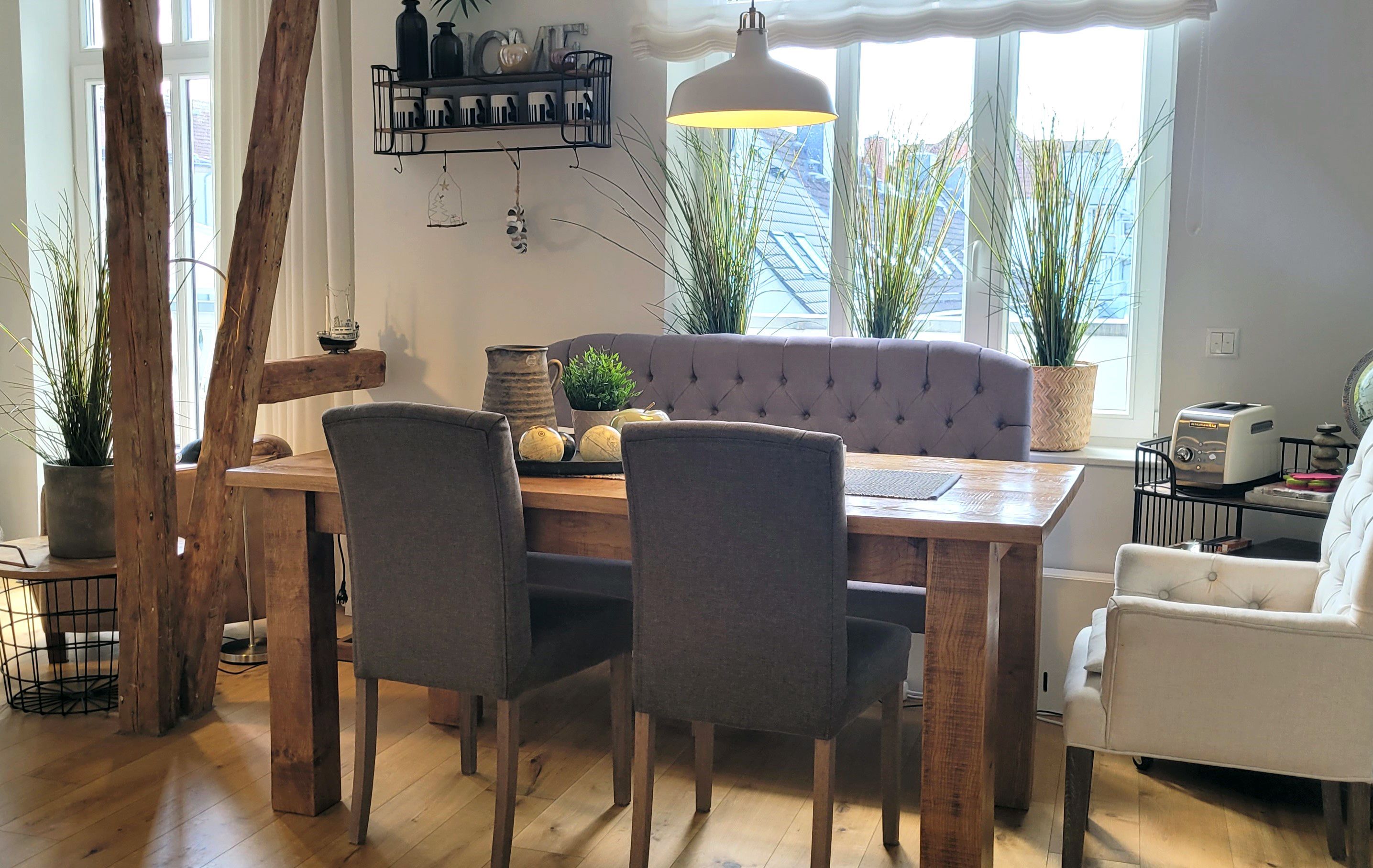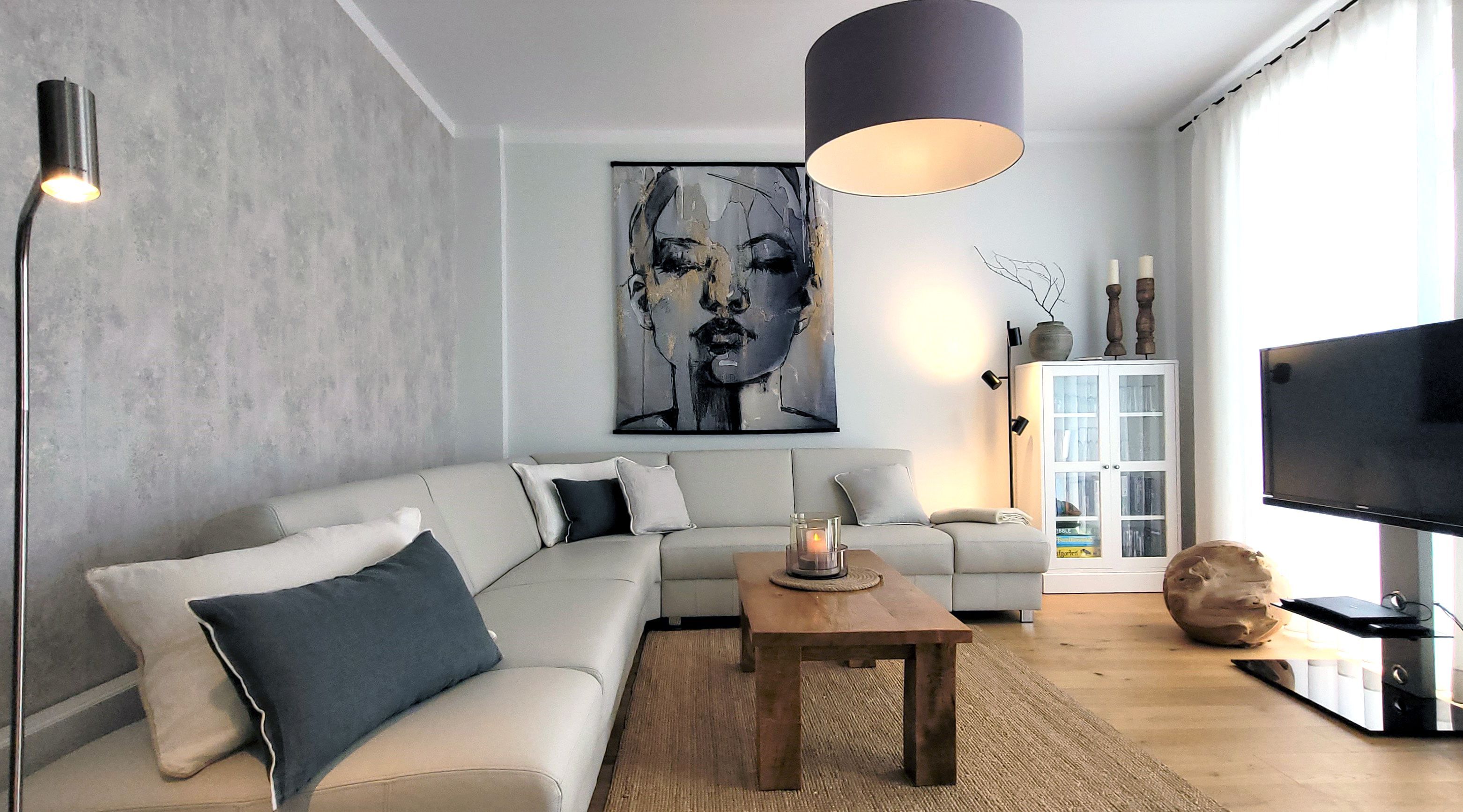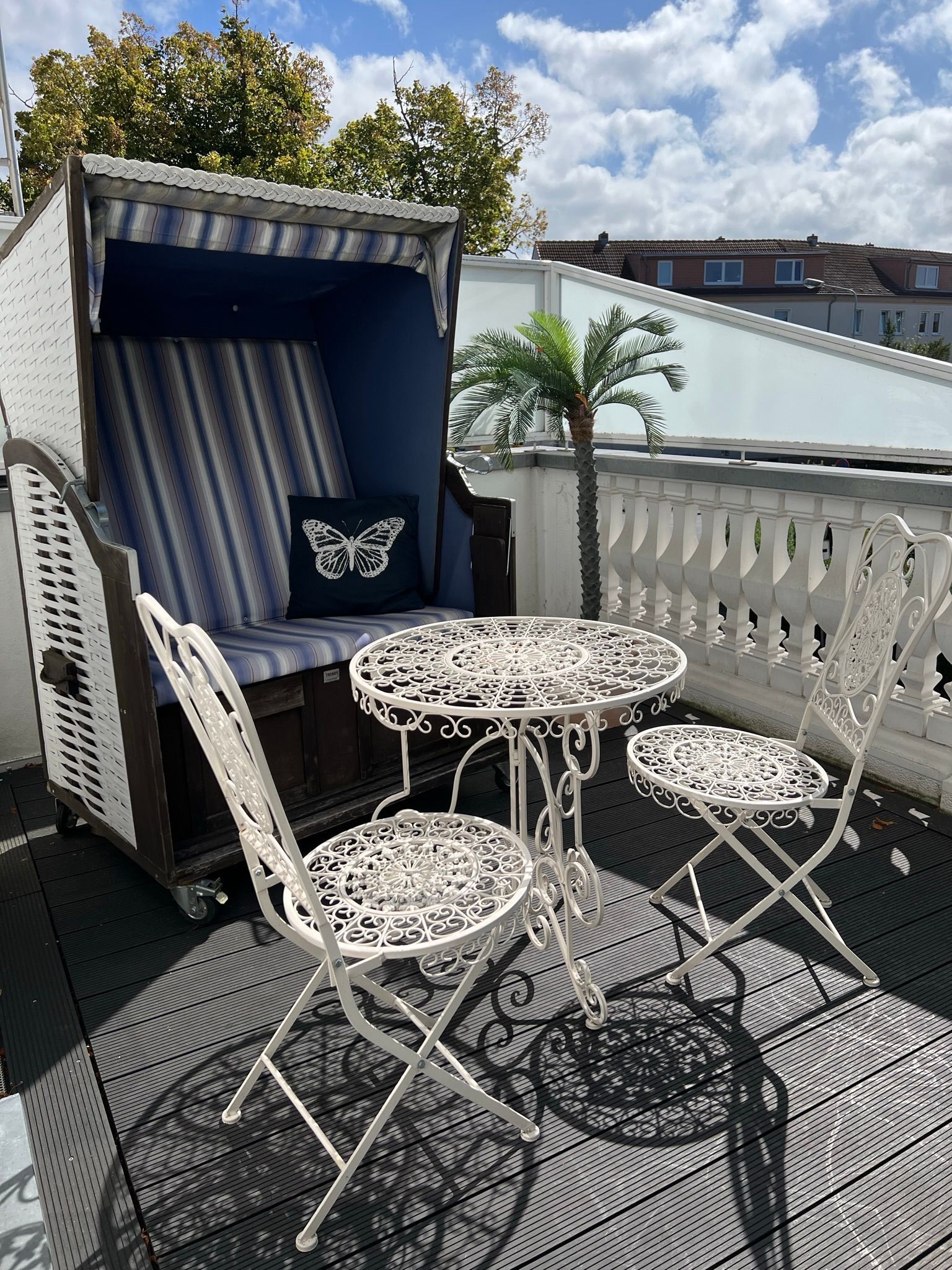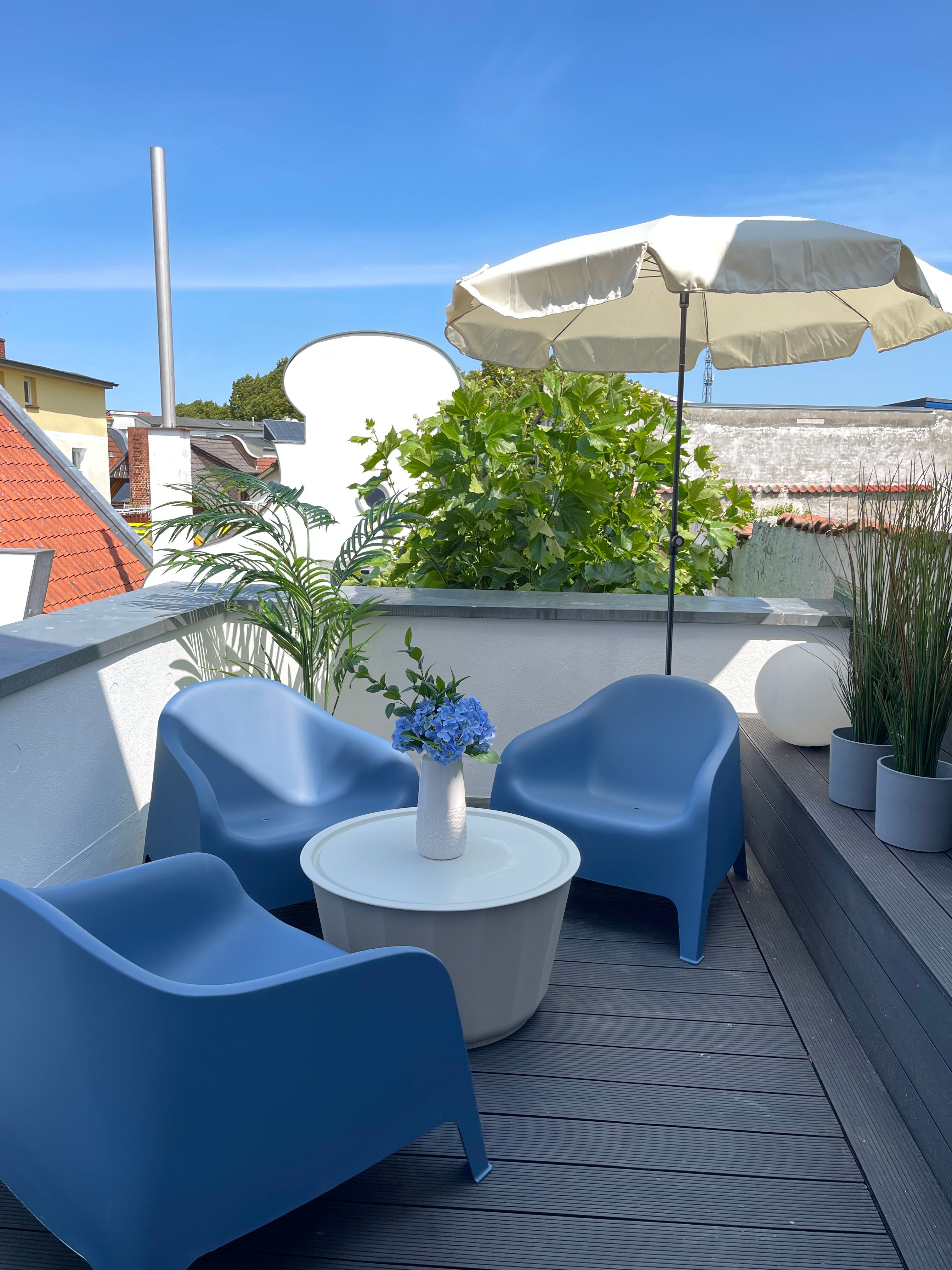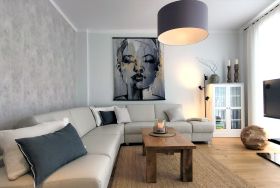 Wunderschöne helle traumhaft eingerichtete Wohnung mit 120 Quadratmetern Wohnfläche und 2 großen Dachterrassen. Eine davon ist 30 Quadratmeter groß ist und ein besonderes Highlight. Hier gibt es einen großen Essplatz und Liegen. Es gibt die Möglichkeit, die Sonne den ganzen Tag über zu genießen und entspannt zu bleiben. Durch den überdachten Bereich ist es auch an einem regnerischen Tag möglich, draußen zu sitzen und die frische Luft zu genießen.