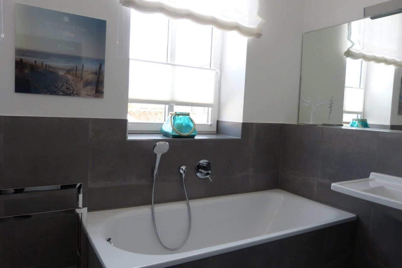 Das Badezimmer ist modern gefliest und verfügt über zwei Fenster, eine Dusche und eine Badewanne. Hier könnt ihr euch nach einem erlebnisreichen Tag am Strand zurückziehen und einen persönlichen Wellness-Tag in eurer eigenen Badewanne genießen.