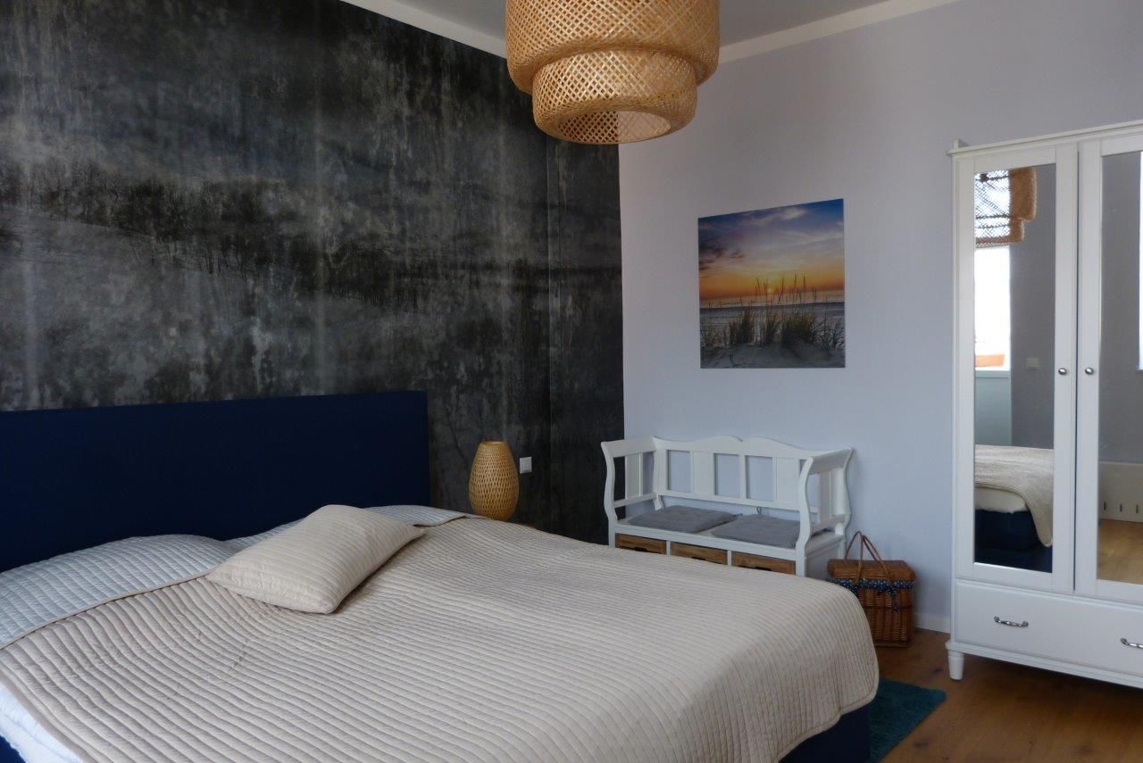 Das Wohnzimmer ist mit einem komfortablen Schlafsofa ausgestattet, das sich mit einem Lattenrost und einer druckentlastenden Gelmatratze in ein vollwertiges Bett mit einer Liegefläche von 1,60 x 2,00 Metern verwandeln lässt. Somit bietet die Wohnung ausreichend Platz für Familien oder Gruppen von Freunden.