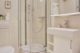 Nur wenige Stufen über die erhaltungswürdige steinerne Haupteingangstreppe und schon erreichen sie die in 2019 teilrenovierte Wohnung Gorch Fock. Sie befindet sich im Hochparterre und ist geeignet für bis zu zwei Personen. Auch hier genießen sie auf dem großzügigen Balkon die ersten Sonnenstrahlen des Tages. Sie erreichen den Balkon vom 2019 neu gestalteten Wohnraum aus, desweiteren befindet sich hier der Esstisch und die Küchenzeile aus 2019 (Geschirrspüler, 2er-Ceranfeld, Mirkowelle). Das gemütliche Doppelbett (160x 200 cm) aus 2019 steht Wand längs in einem separaten Schlafraum ruhig zum Innenhof gelegen, lässt sich aber auch zu zwei Einzelbetten 80×200 cm trennen. Das innenliegende Duschbad mit WC erreichen Sie ebenfalls über den Flureingangsbereich mit Garderobe; rundum eine beliebte Unterkunft die bereits einige Stammgäste für sich gewinnen konnte.