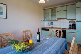 Die offene Küche bietet alles, was Sie für die Zubereitung Ihrer Lieblingsgerichte benötigen: ausreichend Geschirr, eine Spülmaschine, einen Kühlschrank mit Gefrierfach, einen Backofen mit Herd sowie eine Kaffeemaschine und viele weitere praktische Küchenutensilien. Am Esstisch finden bis zu sechs Personen bequem Platz, ideal für gesellige Mahlzeiten.