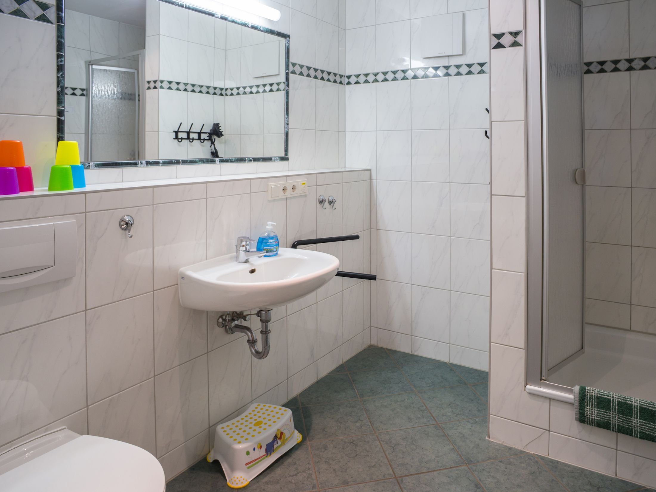 • Bad mit Dusche, Waschtisch und WC