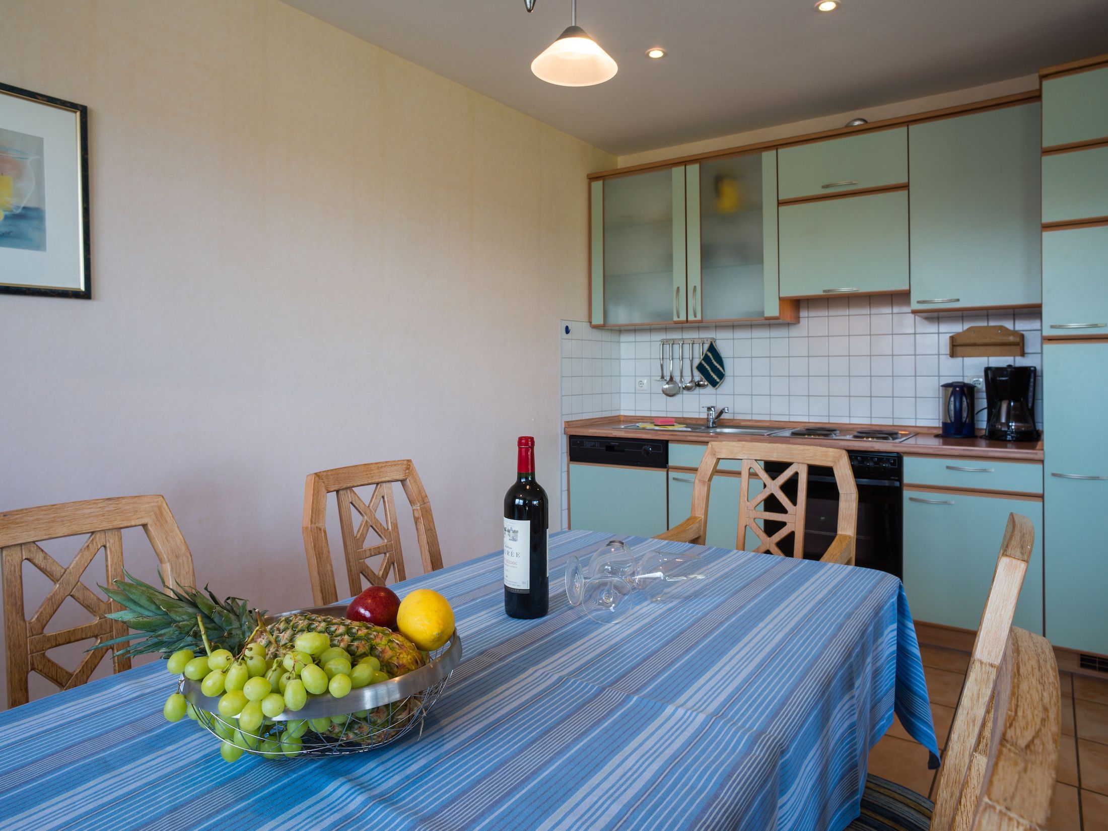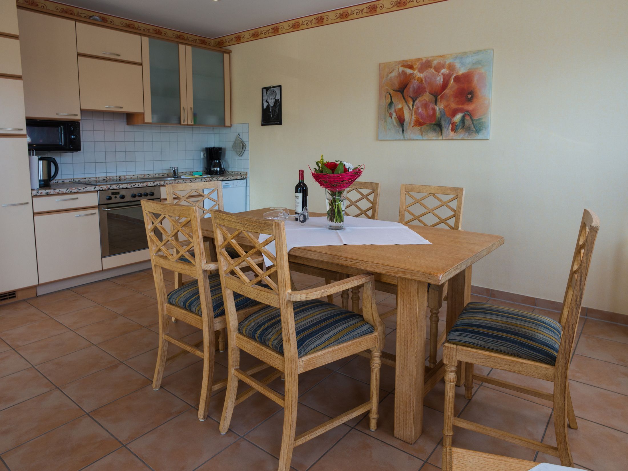 Die offene Küche bietet alles, was Sie für die Zubereitung Ihrer Lieblingsgerichte benötigen: ausreichend Geschirr, eine Spülmaschine, einen Kühlschrank mit Gefrierfach, einen Backofen mit Herd sowie eine Kaffeemaschine und viele weitere praktische Küchenutensilien. Am Esstisch finden bis zu sechs Personen bequem Platz, ideal für gesellige Mahlzeiten.