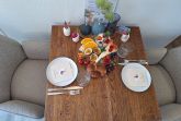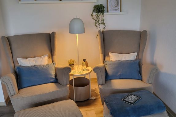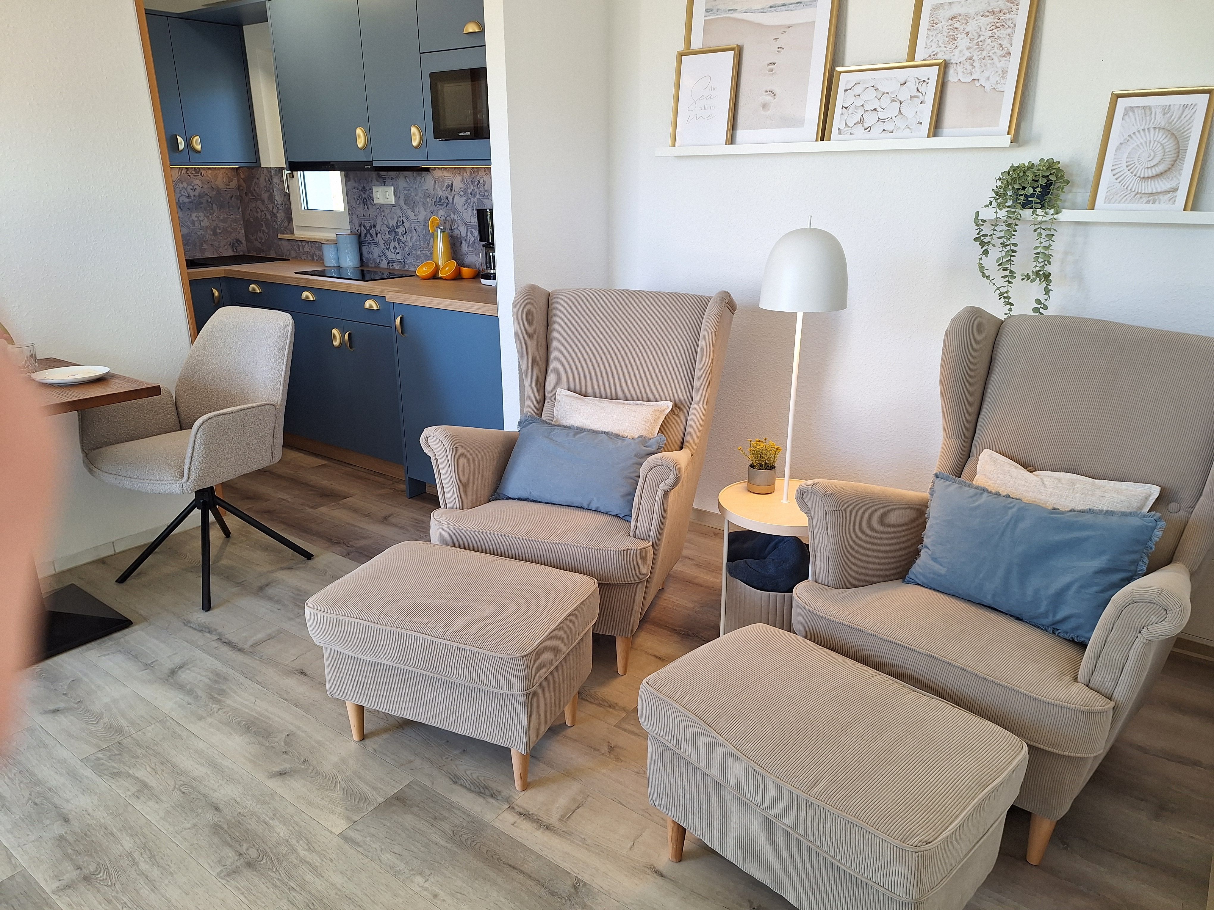 Das gemütliche Ferienhaus bietet auf 28 m² eine komfortable Unterkunft für bis zu zwei Personen. Der Wohnbereich ist ausgestattet mit einer bequemen Couch, einem TV und einer integrierten Küchenzeile. Diese verfügt über ein Ceran-Kochfeld (kein Backofen), einen Kühlschrank, eine Kaffeemaschine, einen Toaster sowie Geschirr und Besteck. Ein Essplatz für zwei Personen lädt zu gemeinsamen Mahlzeiten ein.