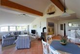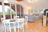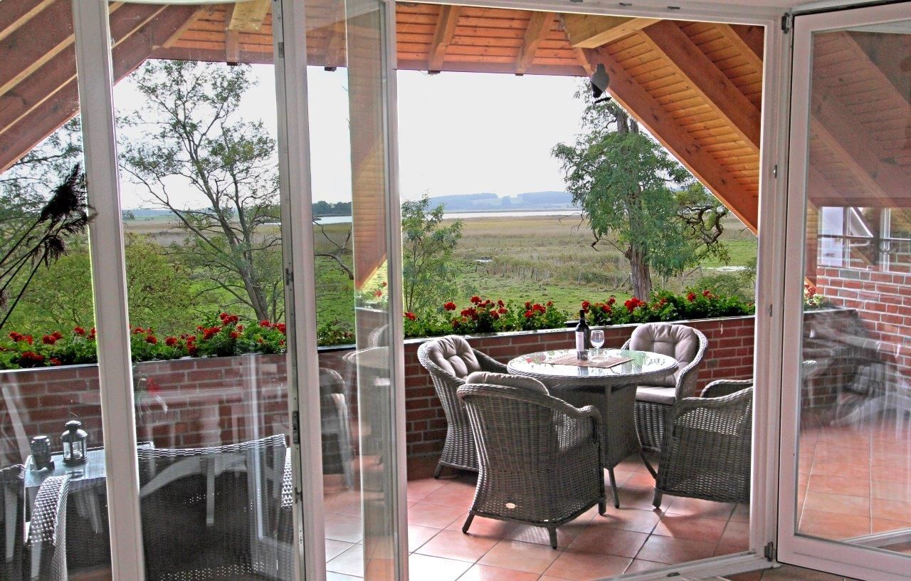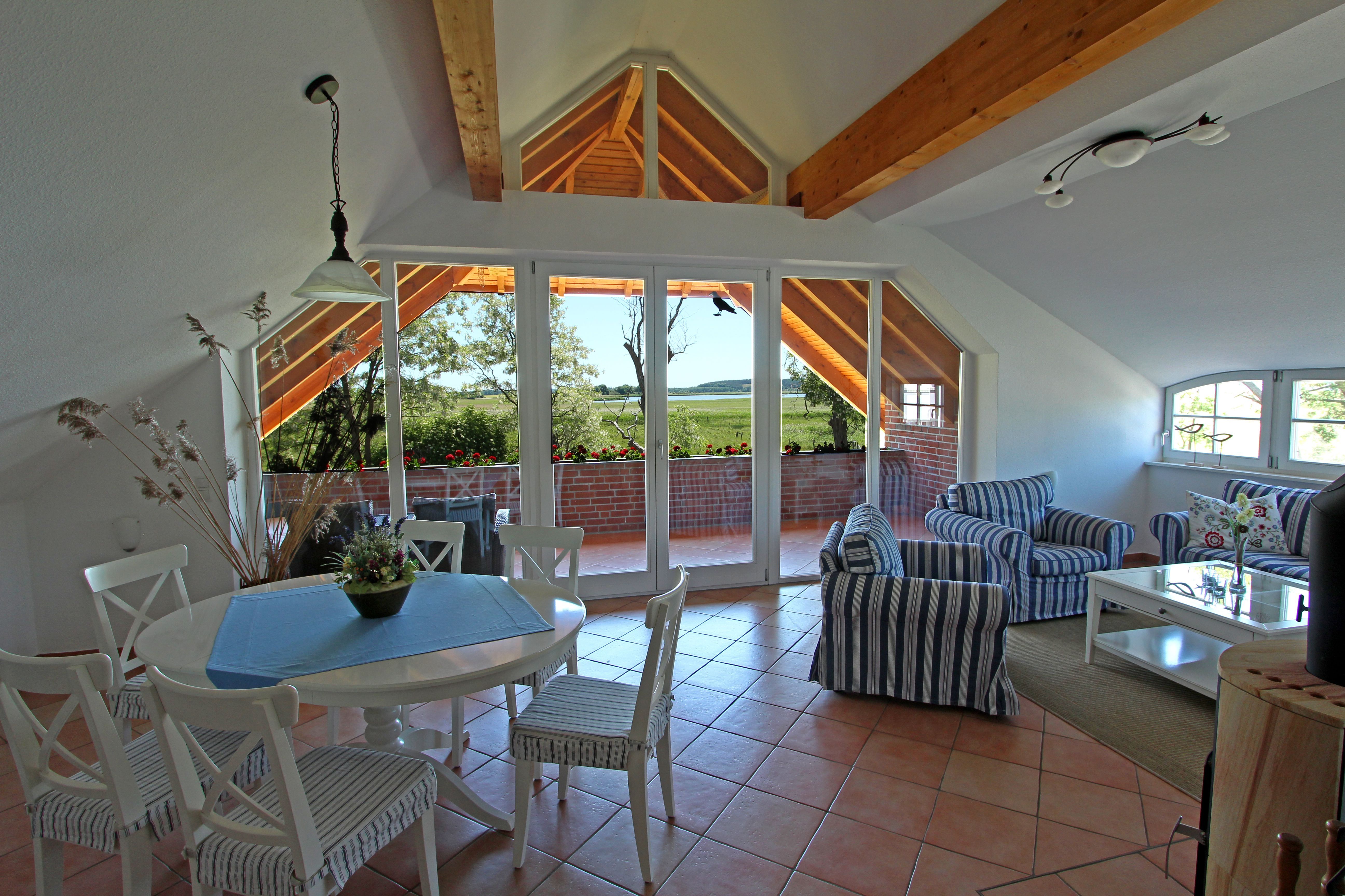 Das großzügige Wohnzimmer mit einer Panoramafensterfront und Kamin lädt zum Verweilen ein. Lassen Sie sich von dem wundervollen Blick auf die idyllische Boddenlandschaft verzaubern. Direkt an das Wohnzimmer grenzt die überdachte und sonnige Südveranda (20m²) mit bequemer Sitzgruppe.