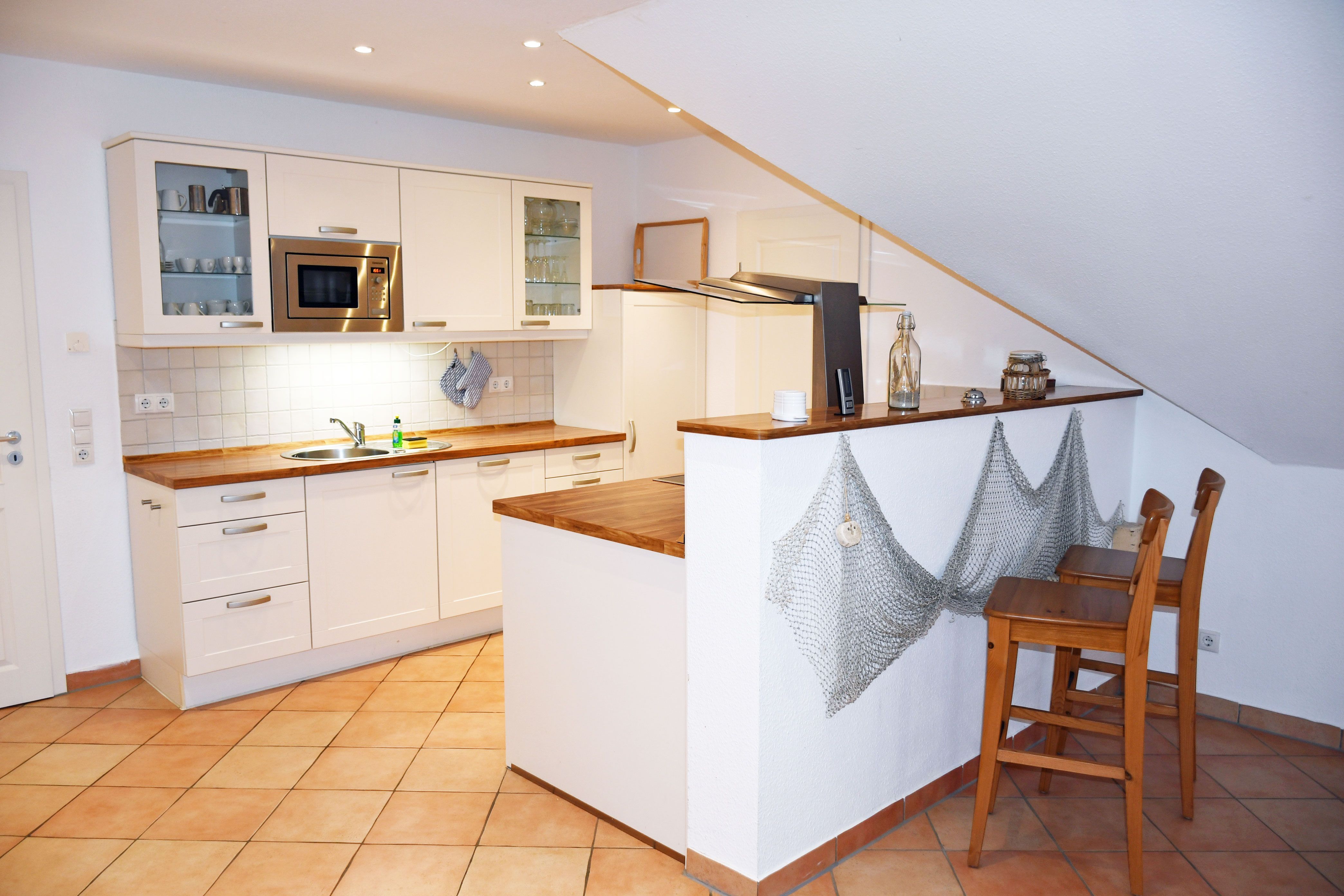 - Küchenzeile mit Ceranfeldherd, Backofen, Abzugshaube, Mikrowelle, Geschirrspüler, Wasserkocher, Kaffeemaschine, Toaster, Kühlschrank mit Gefrierfach