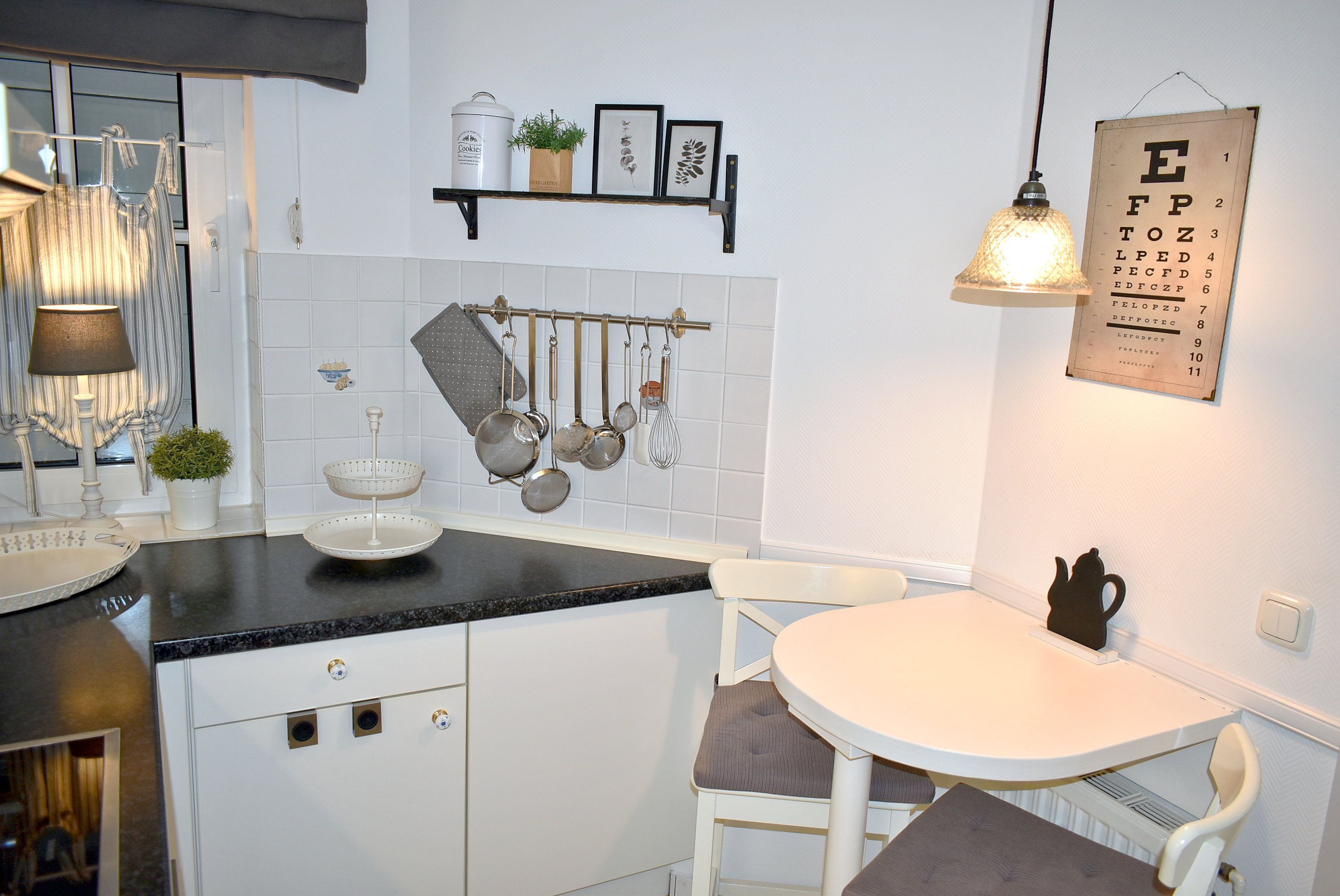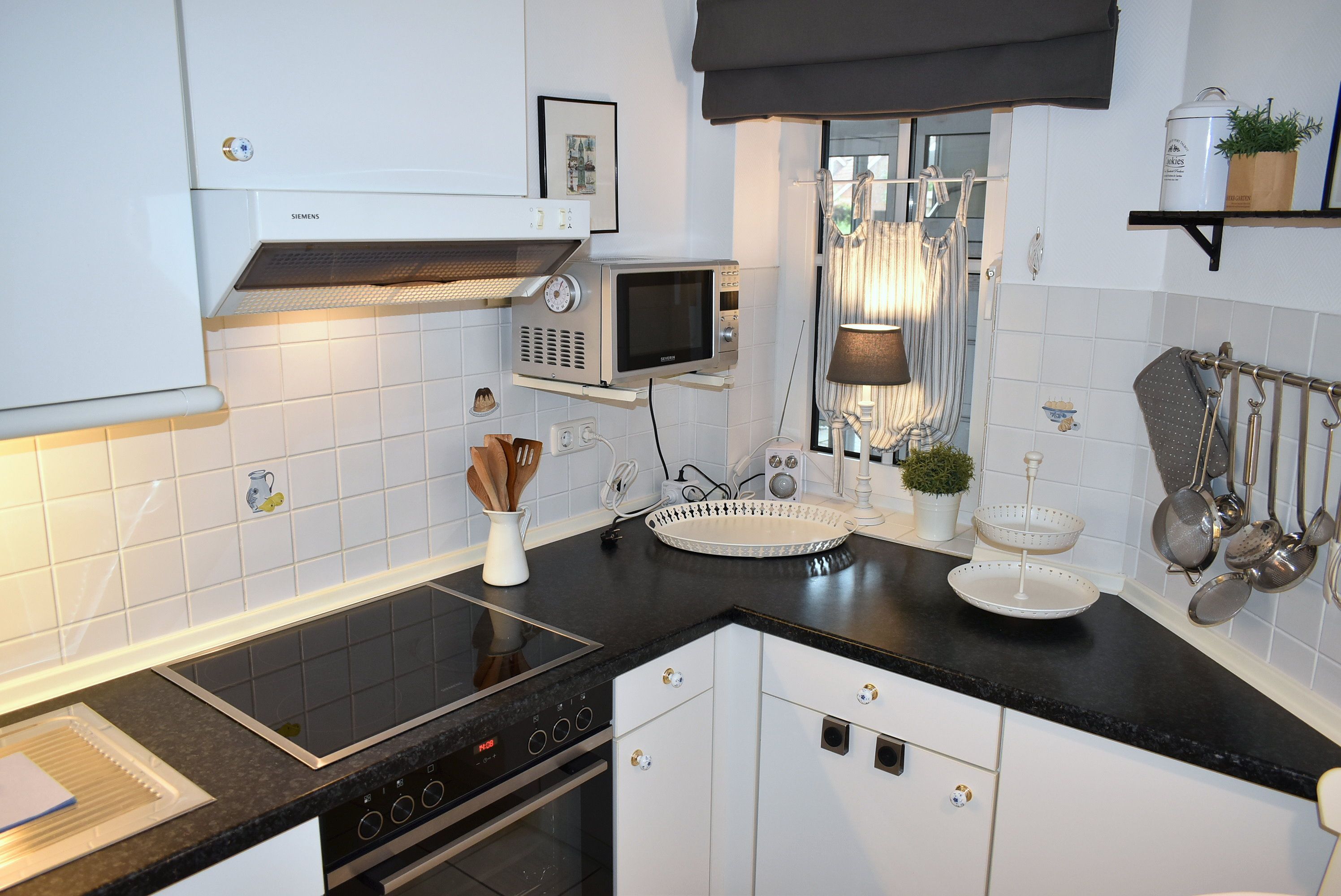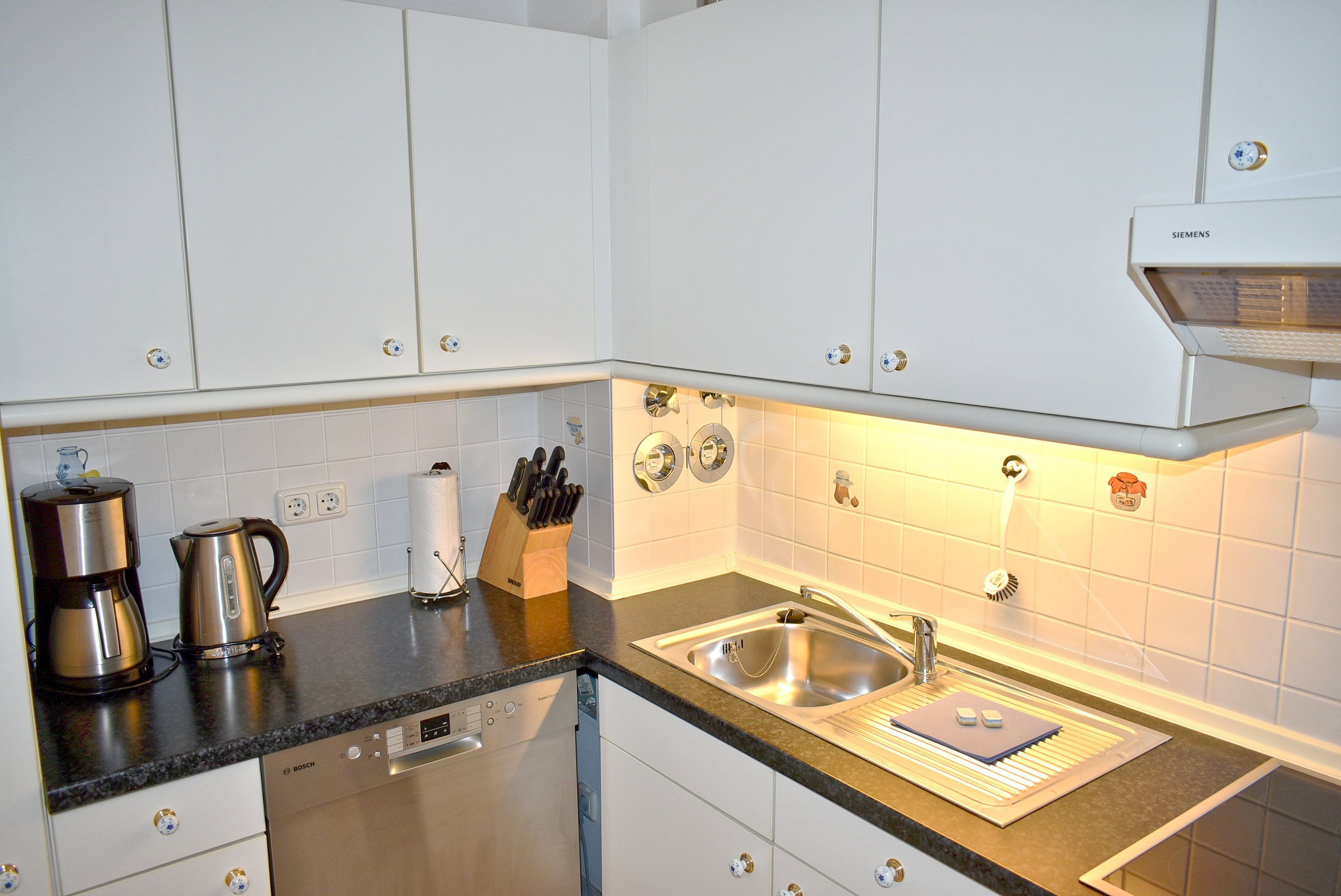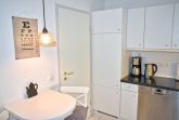 Küche: 2 Stühle, 4 Plattenherd mit Ceranfeld und Backofen, Einbauküche, Geschirr, Handmixer, Kaffeemaschine, Klapptisch, Kochtöpfe, Kühlschrank mit 3* Gefrierfach, Mikrowelle, Radio, Spülmaschine, Toaster, Wasserkocher