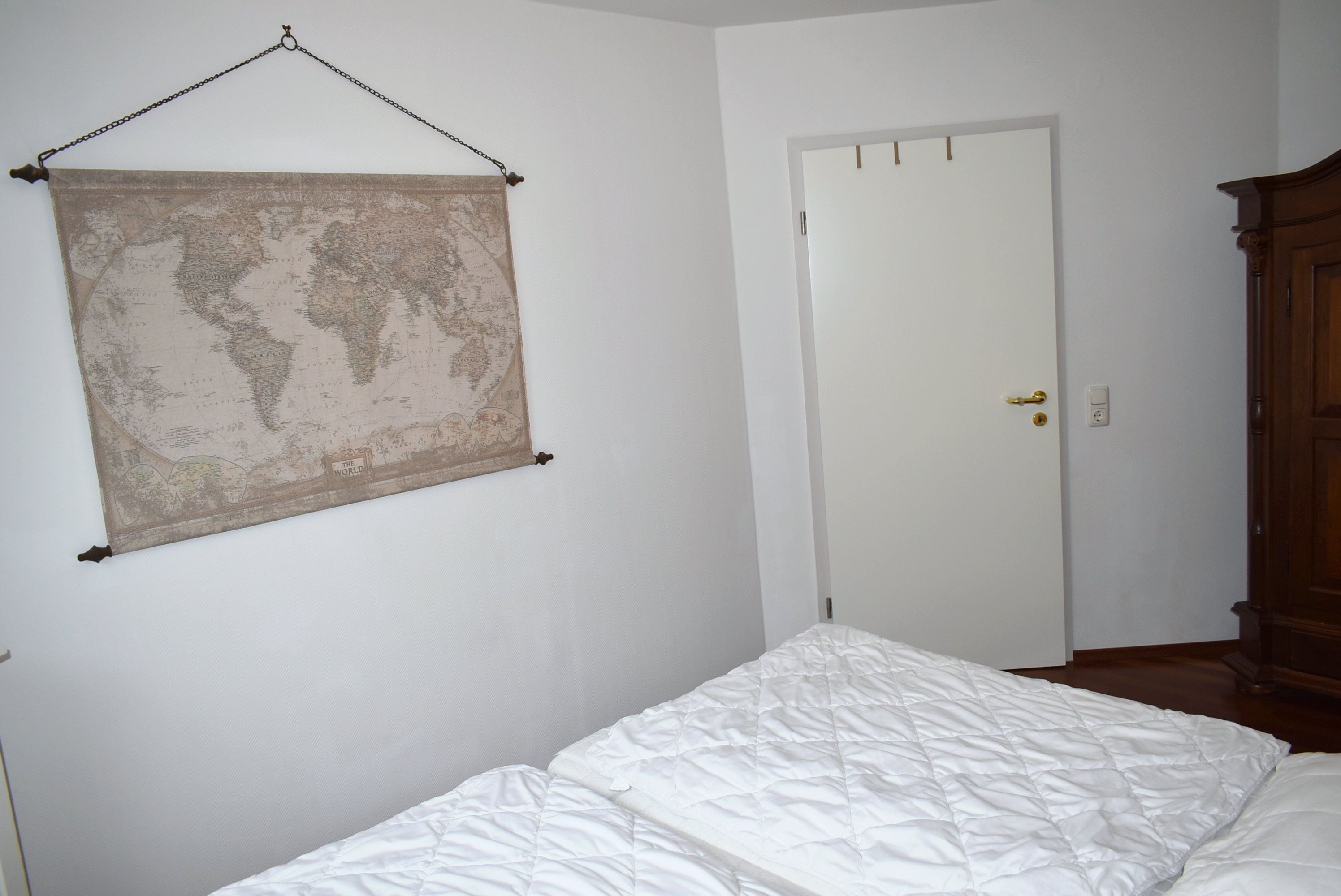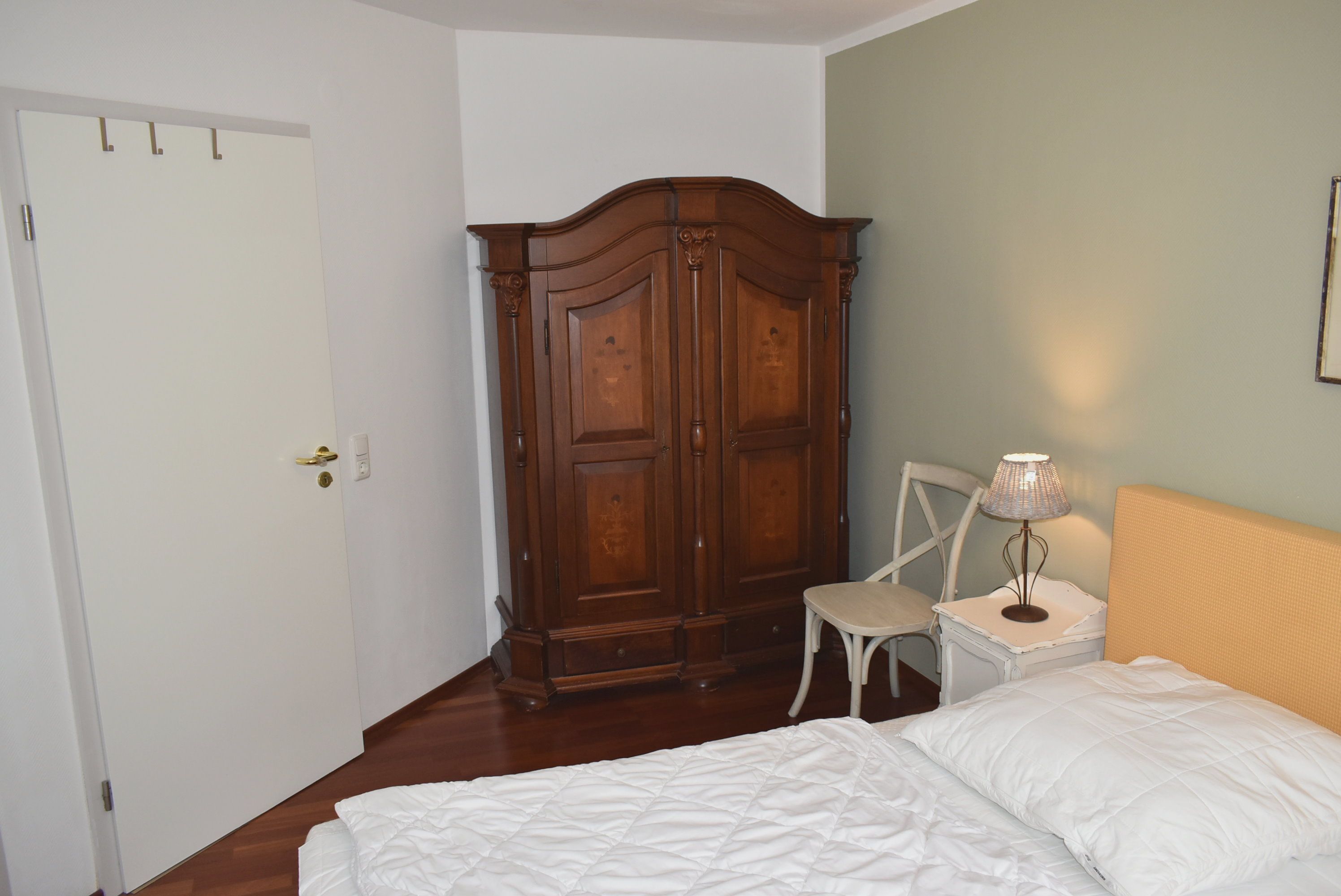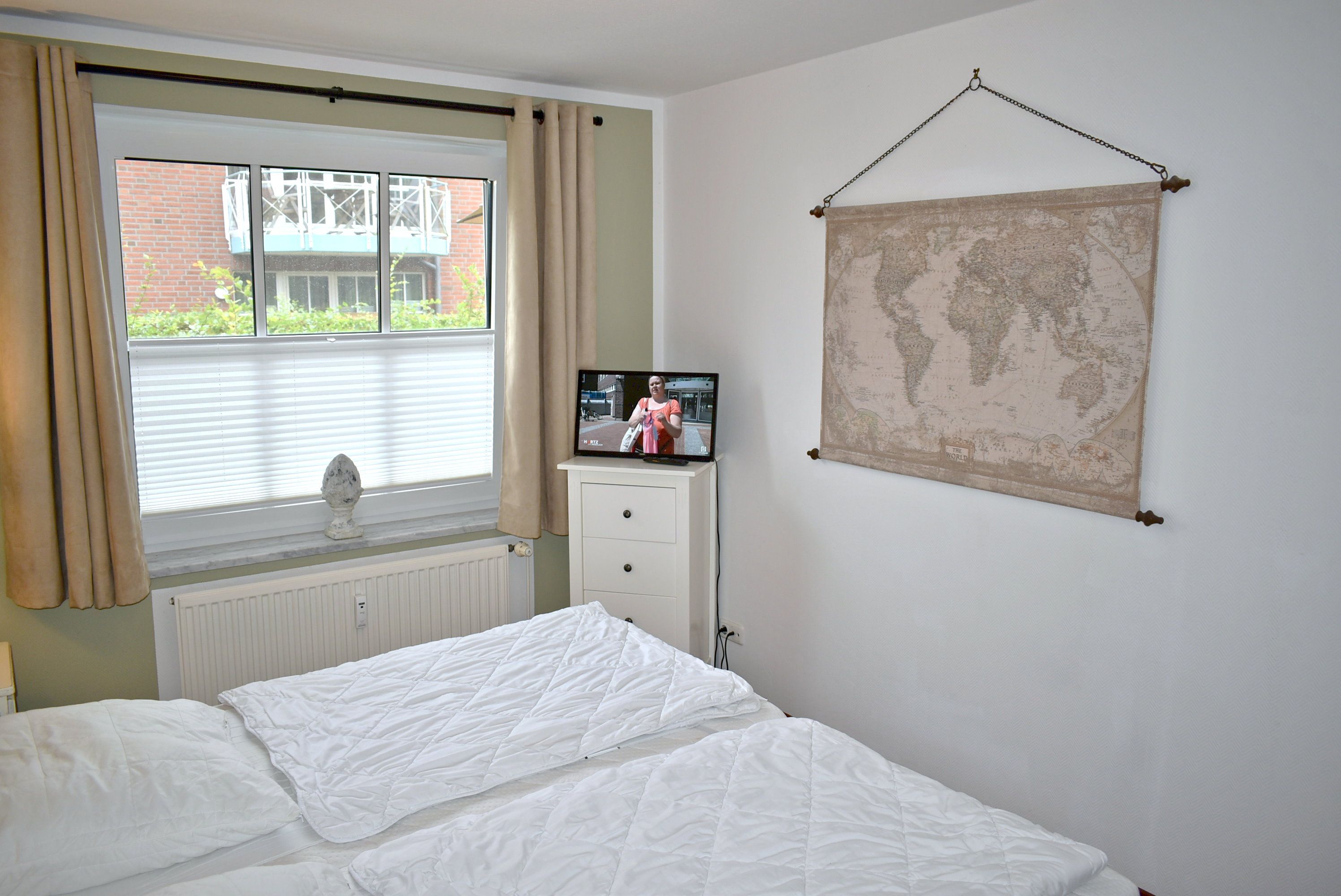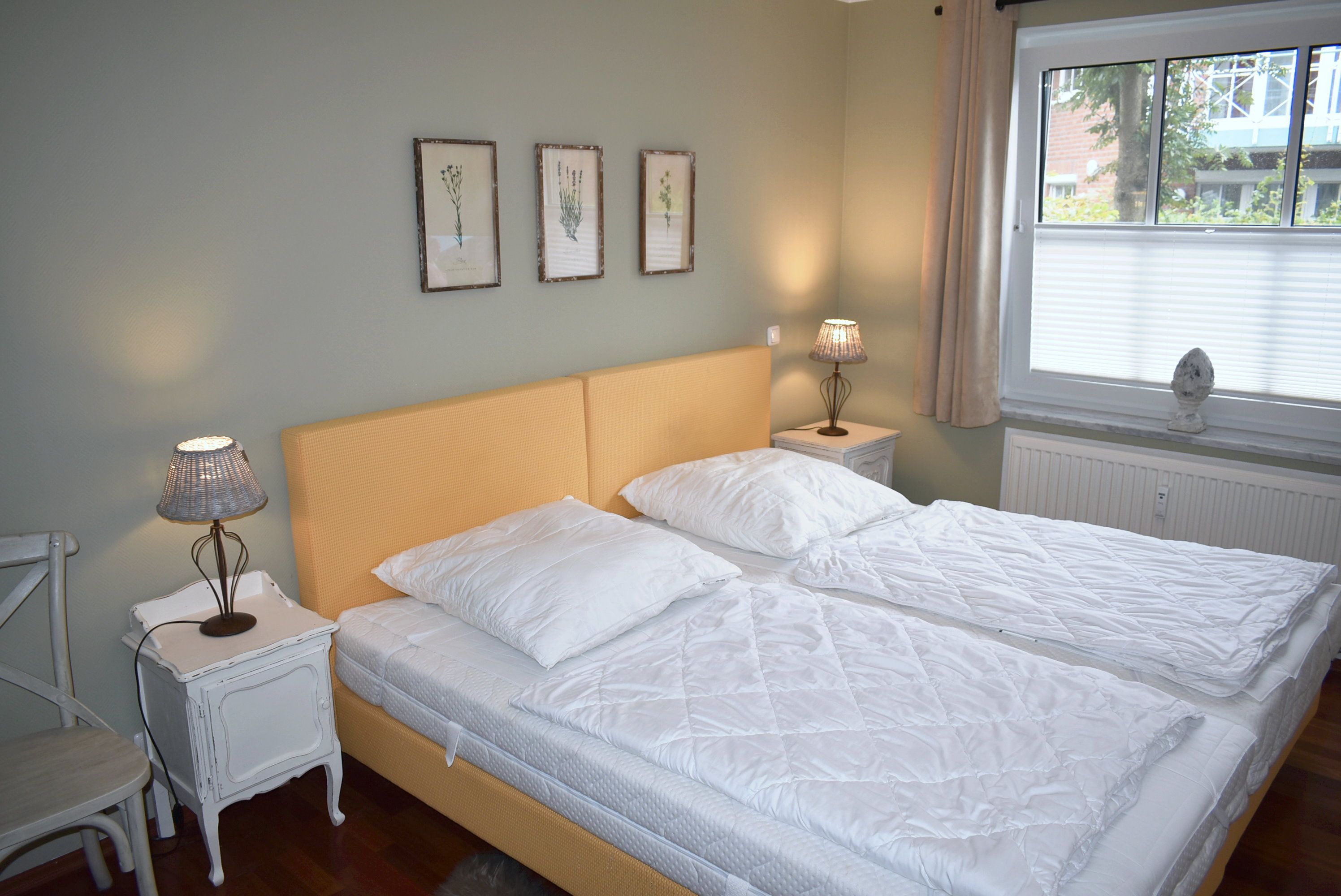 Schlafzimmer 1: 2 Matratzen, 2 Nachttische, Boxspringbett 2,00 x 2,00 m, Flachbildschirm, Kabel-TV, Kleiderschrank, Regal, Stuhl