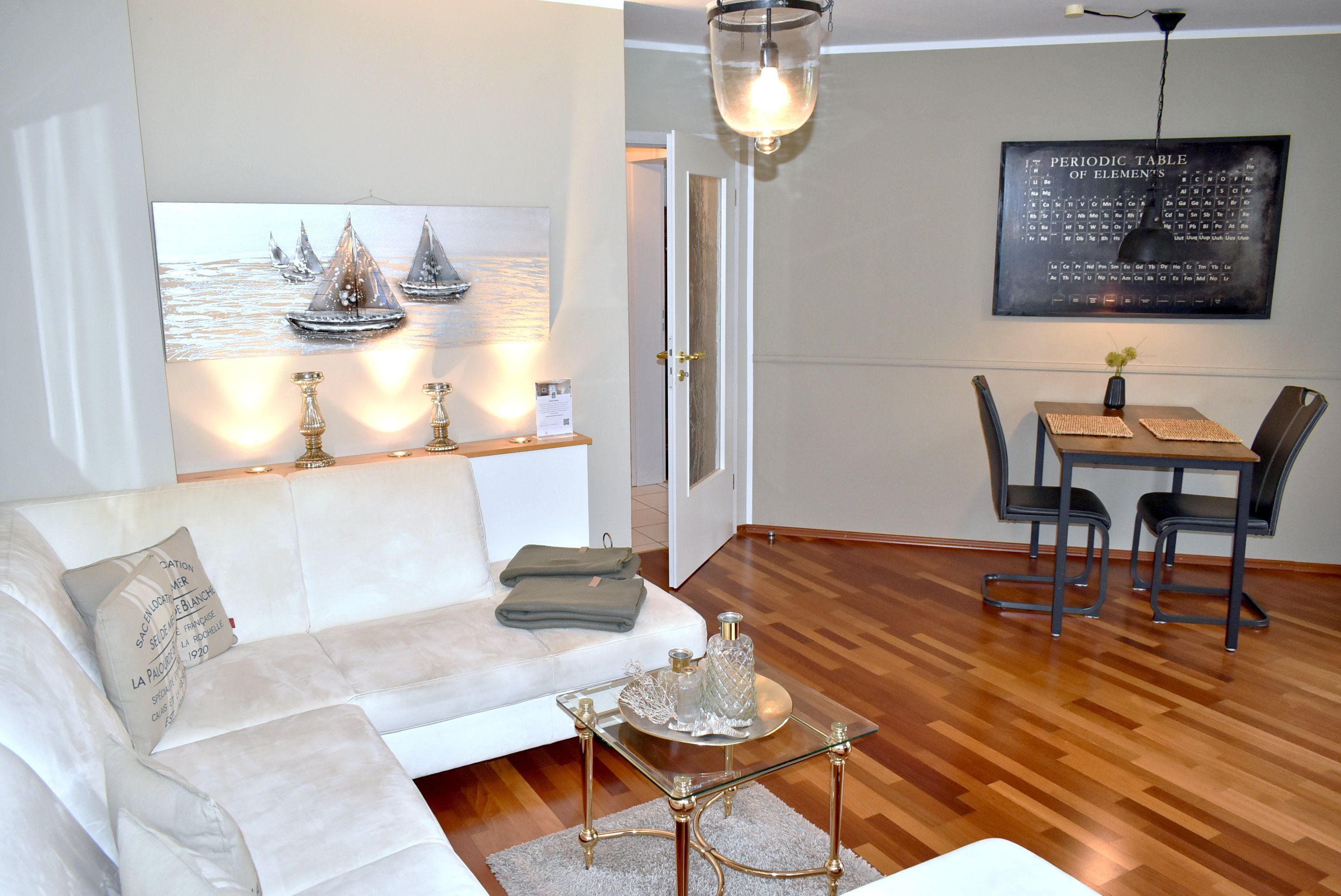 Wohnzimmer: 2 Anrichten, 2 Stühle, Couchtisch, Eckcouch, Esstisch, Flachbildschirm, Hocker, Kabel-TV, Tischlampe