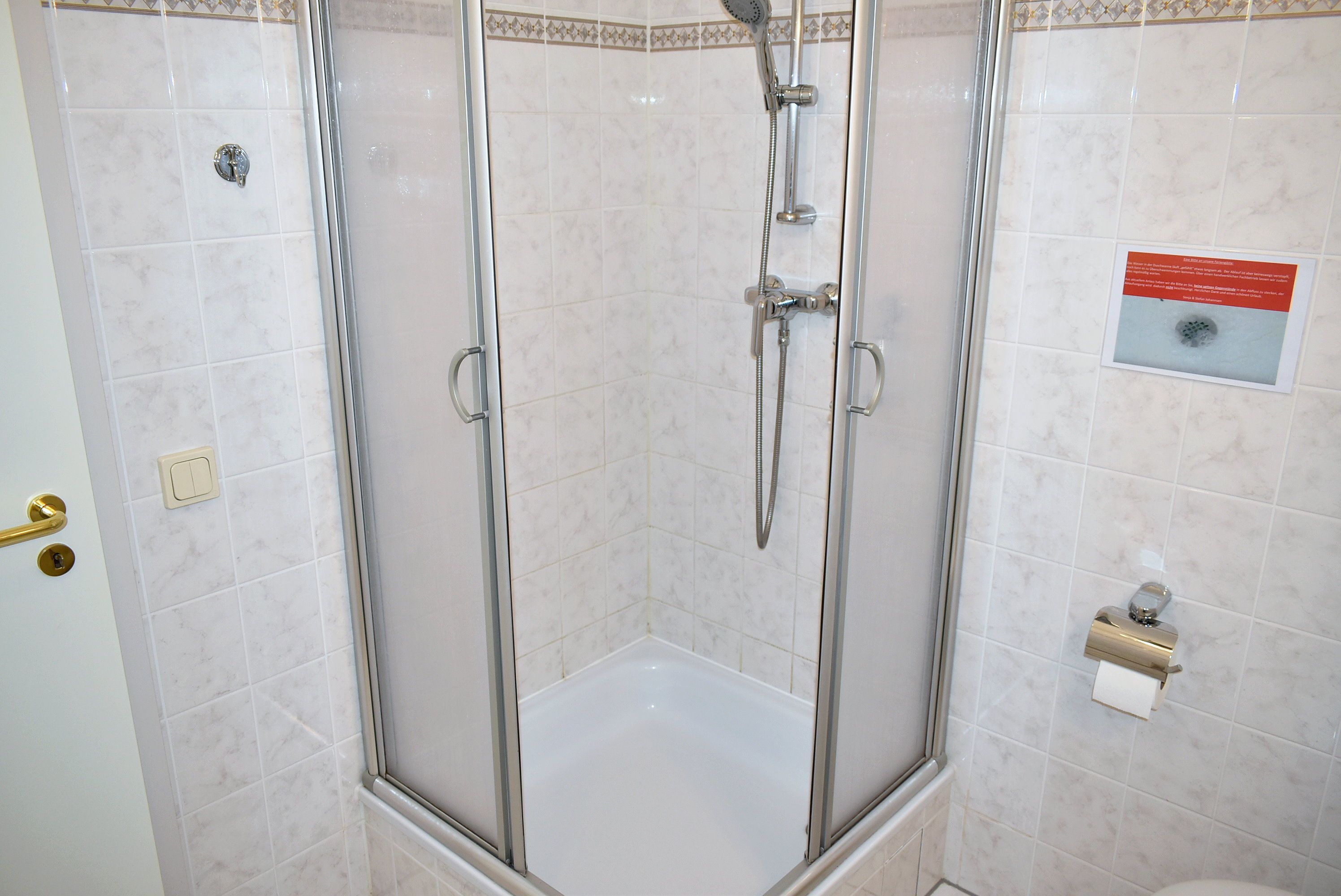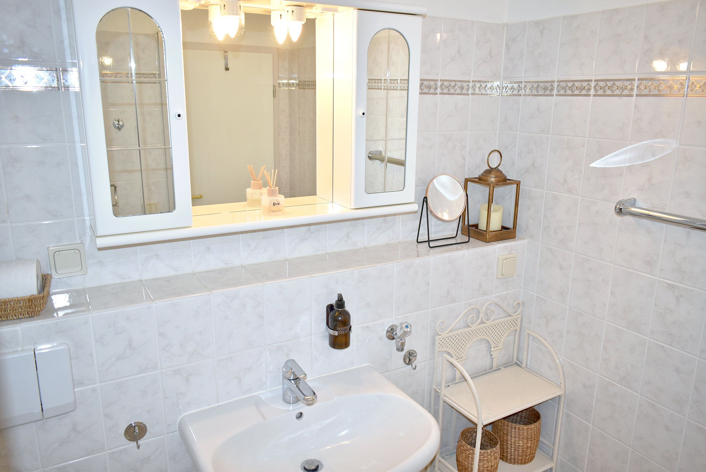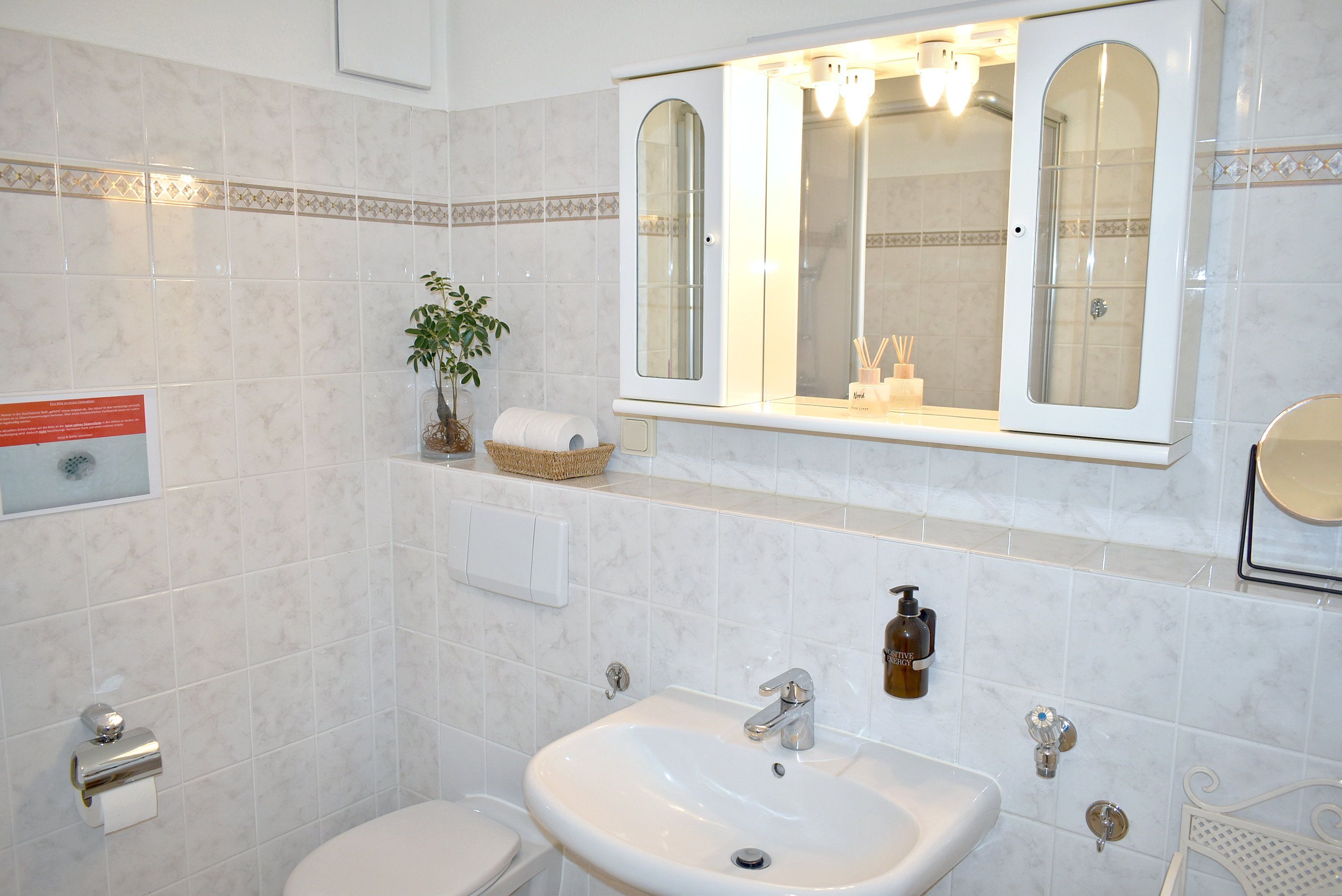 Bad 1: Dusche, Duschkabine, Fön, Kosmetikspiegel, Regal, Spiegelschrank, Waschbecken, WC
