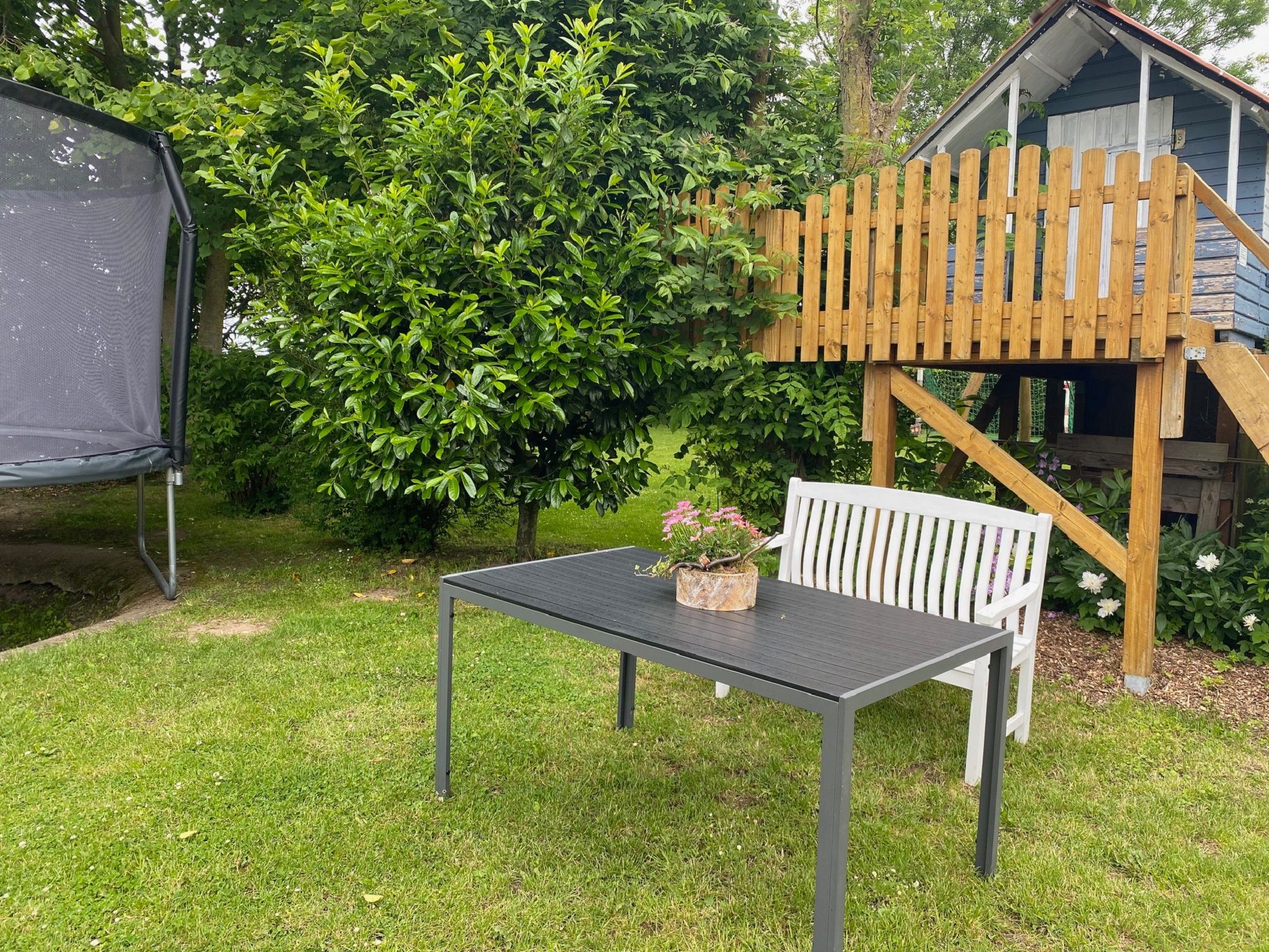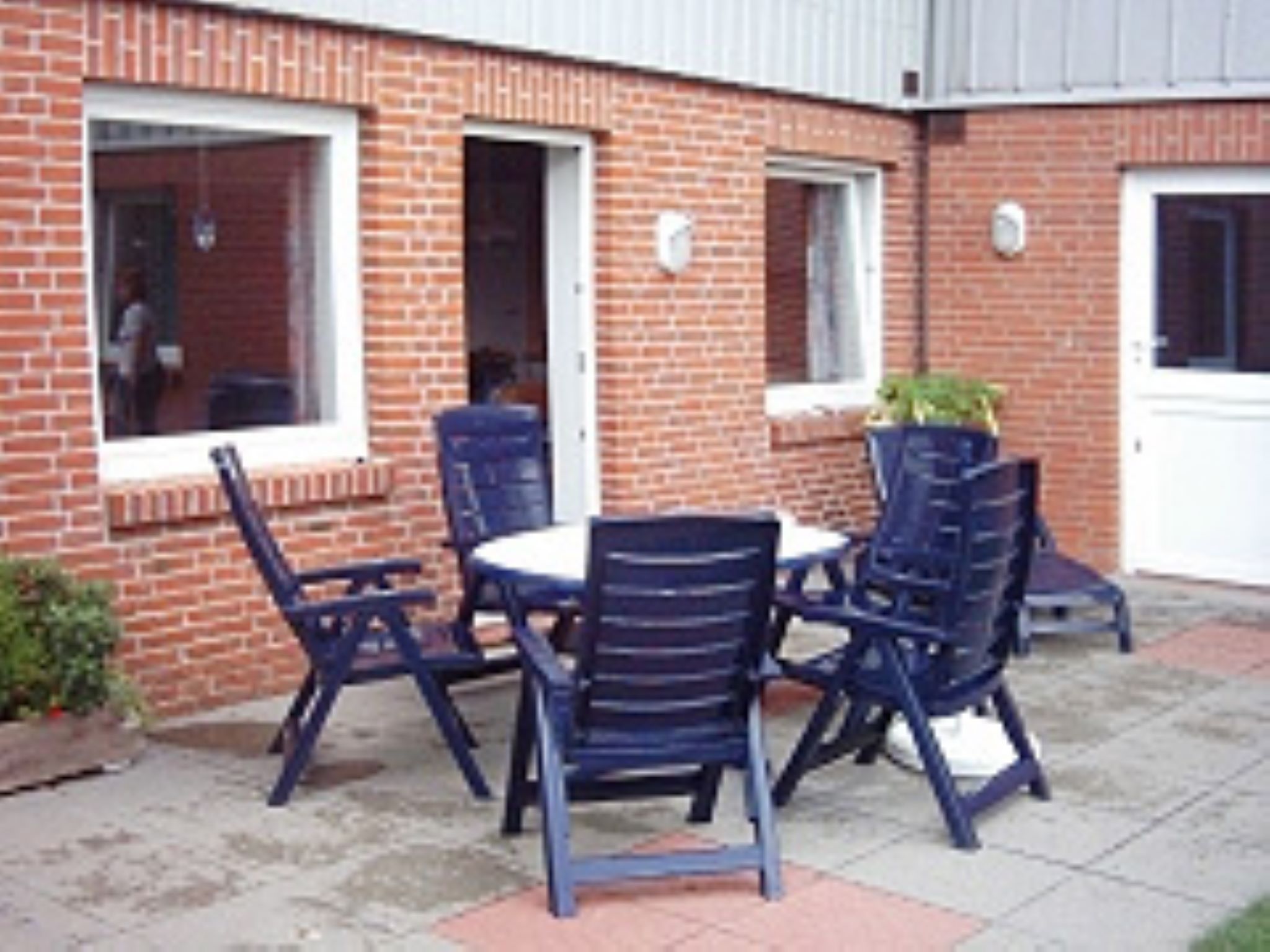 Die zur Ferienwohnung gehörende Terrasse mit Tisch und Stühlen sowie Gartenliege bietet erholsame Stunden in unserer ruhigen Hofumgebung.