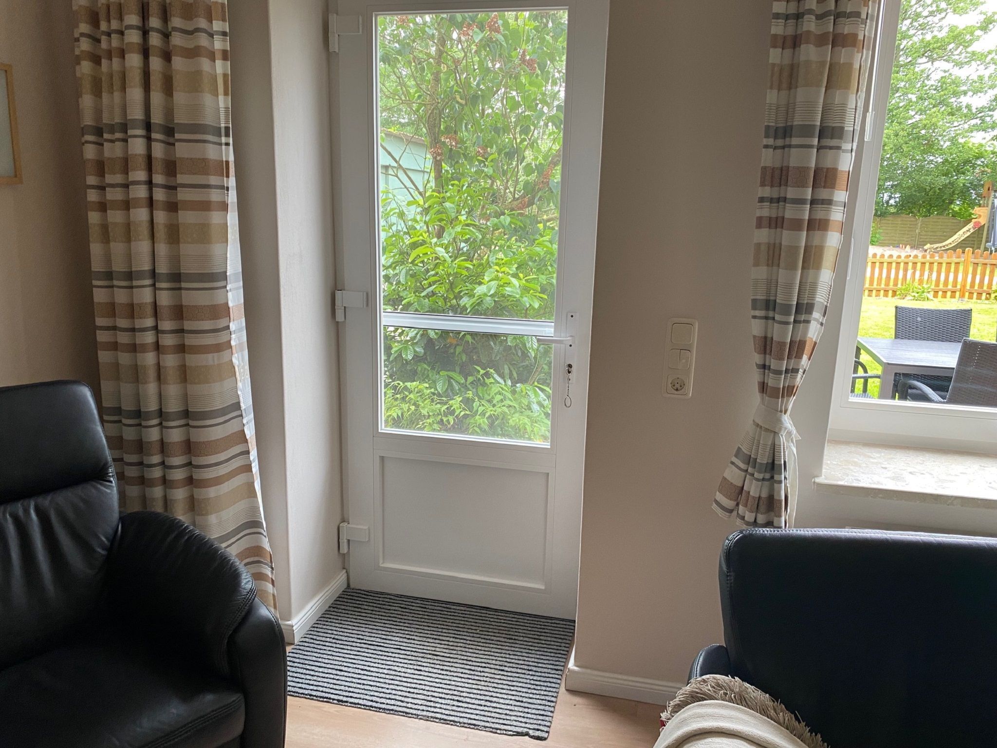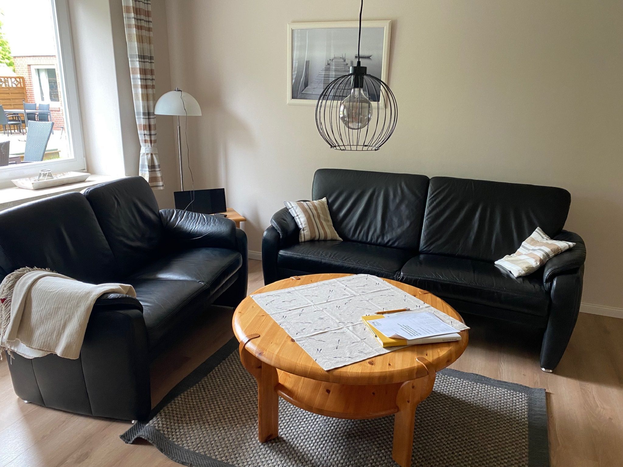 Im gemütlichen Wohnzimmer steht die für fünf Personen nutzbare Sitzgruppe. Fernseher, DVD-Player und Stereo-Anlage gehören zur Ausstattung.