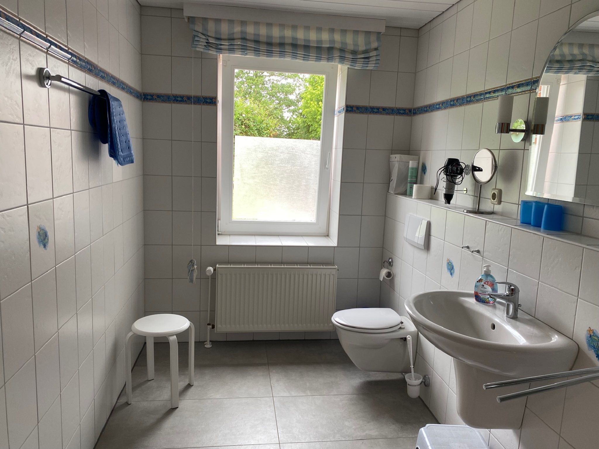 Das große und moderne Badezimmer mit WC ist mit einer geräumigen Duschkabine ausgestattet.