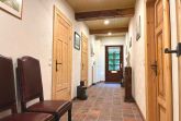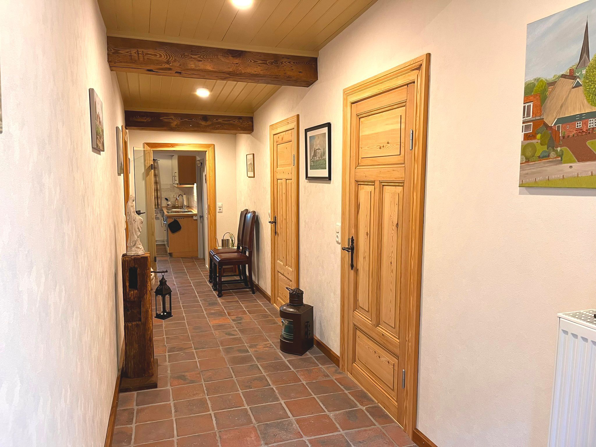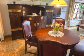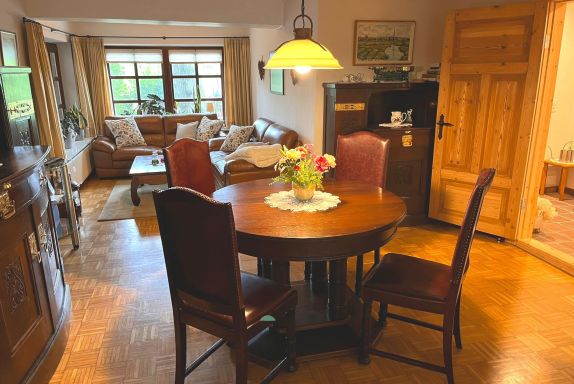 Der Wohnbereich besteht aus einer Couchecke und einem Essbereich. Im Esszimmer stehen liebevoll restaurierte Jugendstilmöbel. Der große Tisch bietet reichlich Platz zum Speisen, Klönen und Spielen.