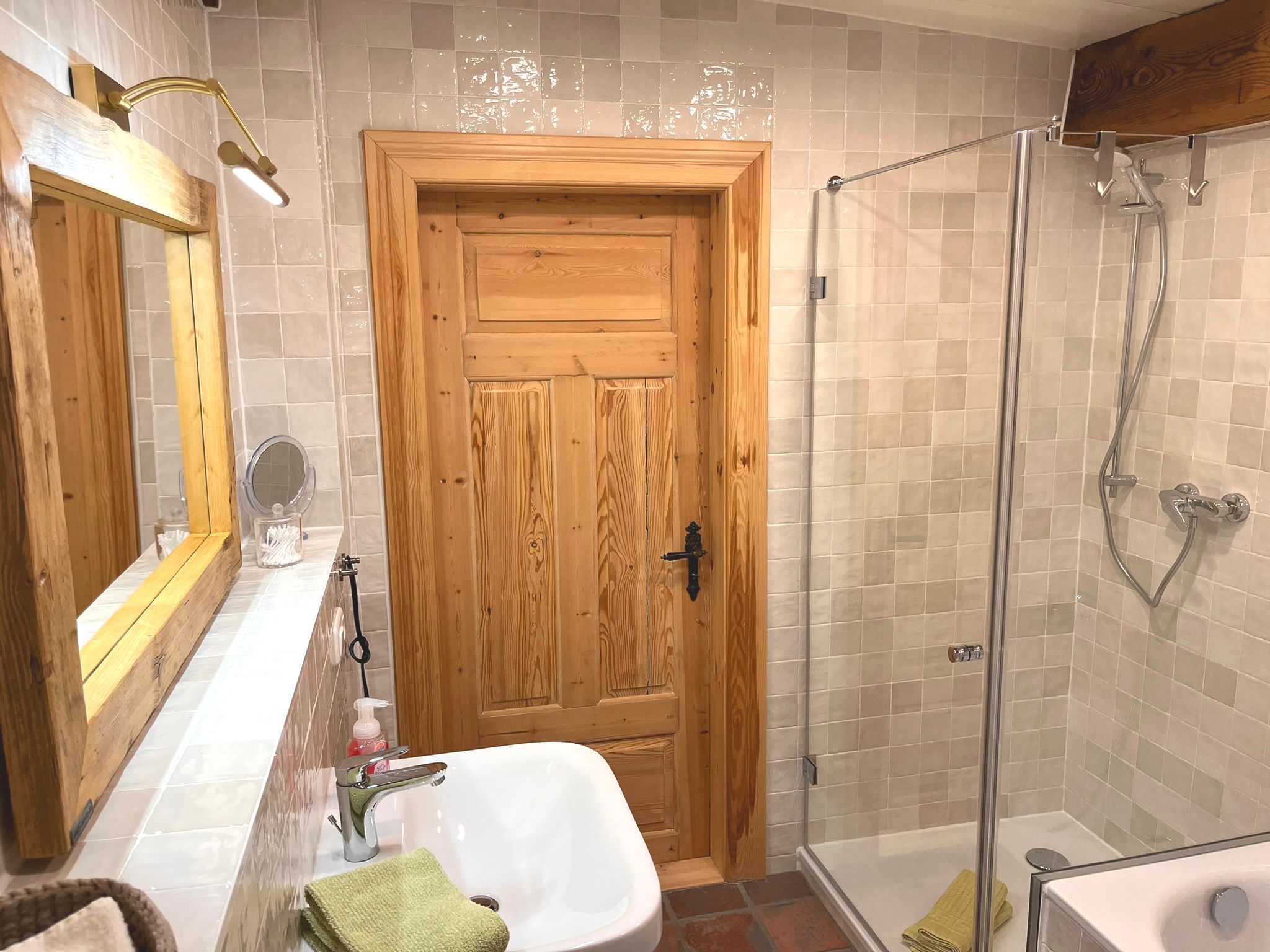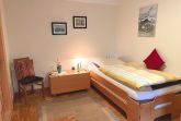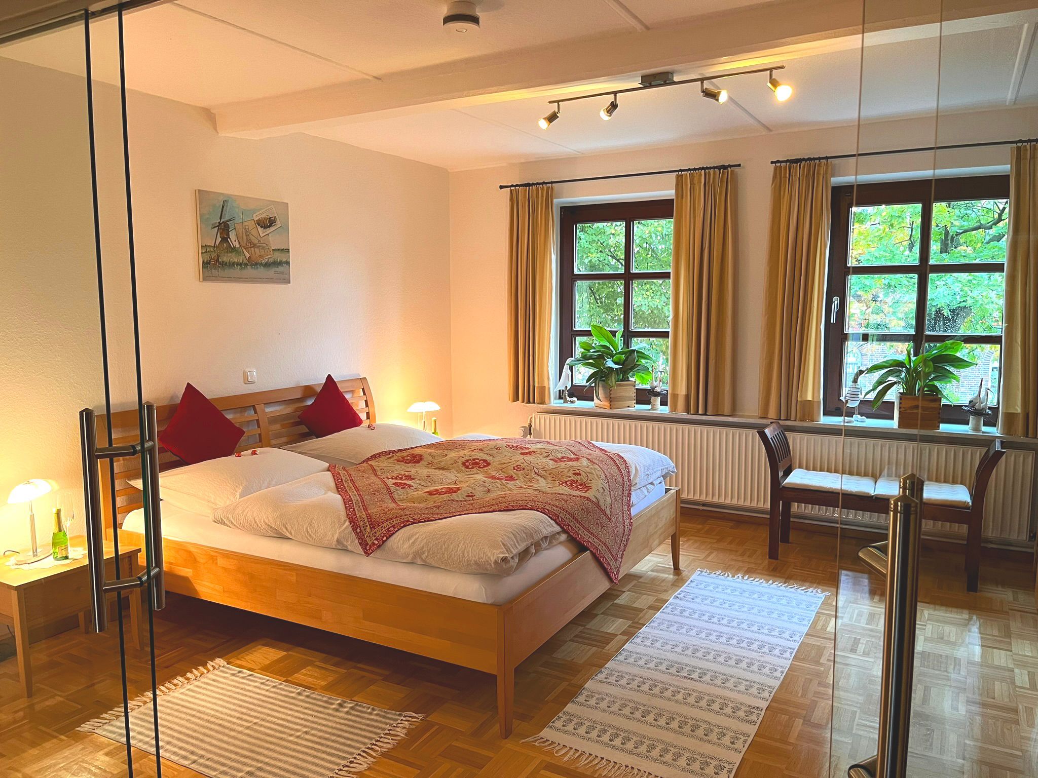 Schlafzimmer: Durch eine Glaswand ist das Schlafzimmer vom Wohnraum abgetrennt. Licht durchflutet tagsüber Schlaf- und Wohnraum. Durch einen blickdichten Vorhang lässt sich das Schlafzimmer auch visuell vom Wohnraum trennen. Die Vollholzmöbel (Buche) bestehen aus einem Doppelbett (2x 90x200, Bettwäsche bereits bezogen), zwei Nachttischen mit Leselampen, einem sehr geräumigen Kleiderschrank und einer Ablage- bzw. Sitzbank.