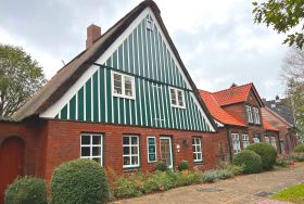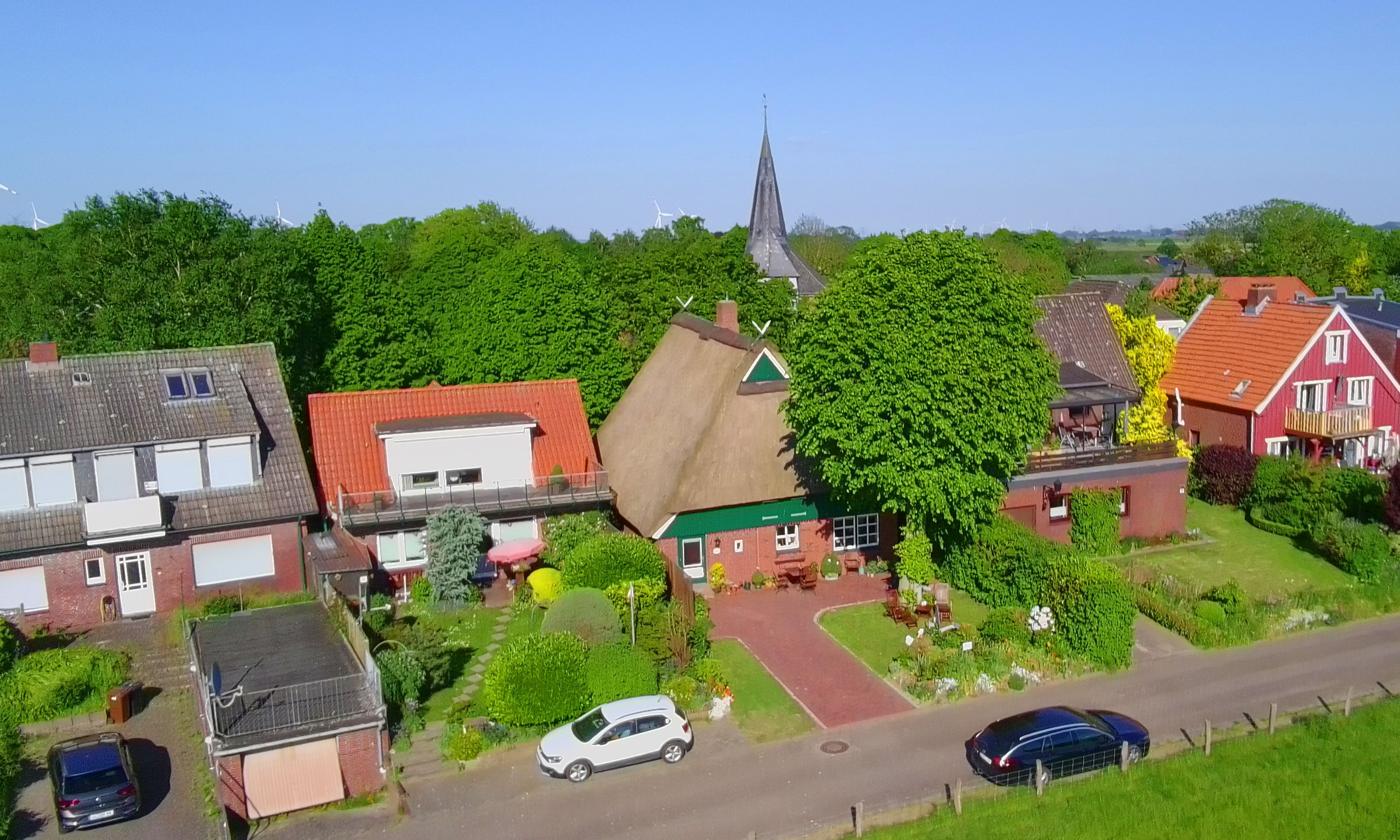 Hoch über der Wilstermarsch, dem „Land unterm Meer“ krönen die Häuser der Deichreihe den alten Elbdeich, in ihrer Mitte das charakteristische Reetdachhaus an der Stöpe.