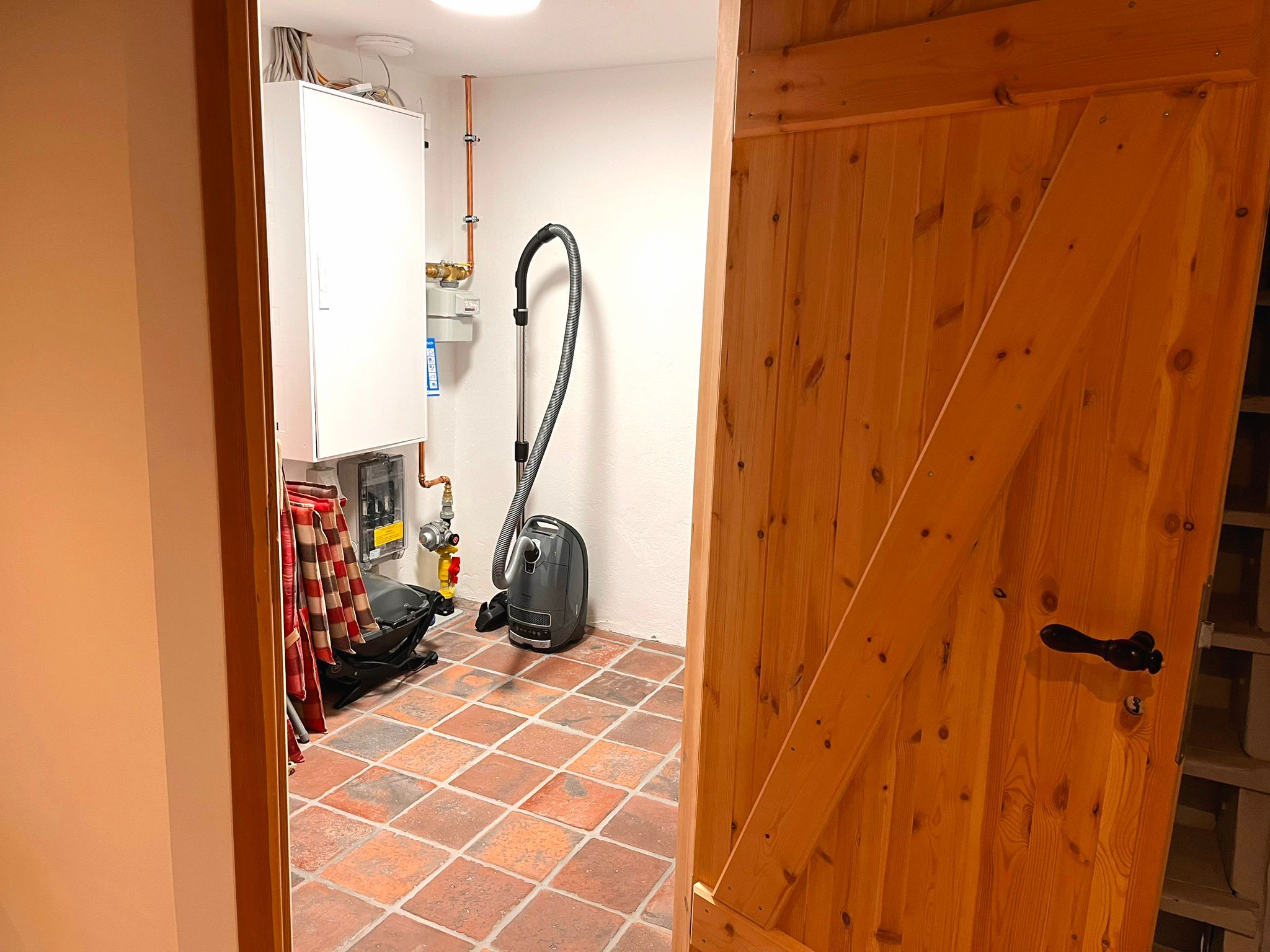 Küche: Herd mit Glaskeramik-Kochfeld (4 Kochzonen) und Backofen, Kühlschrank mit Eisfach, Mikrowelle, Spüle, Ess-Service, Koch- und Essbesteck, Töpfe, Pfannen, Toaster, Kaffeemaschine, Eierkocher, Wasserkocher, elektr. Rührgerät sowie Geschirrhandtücher.