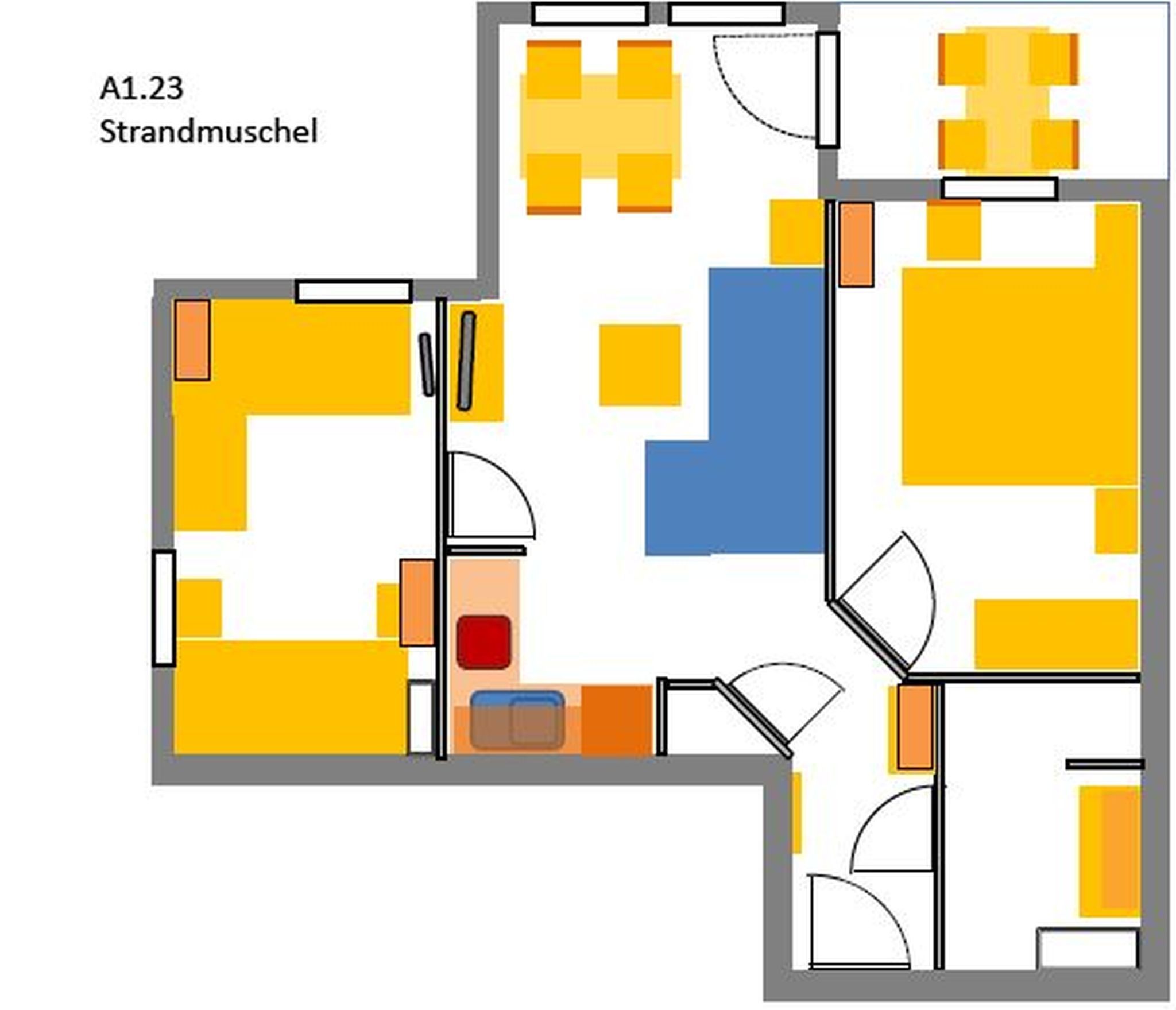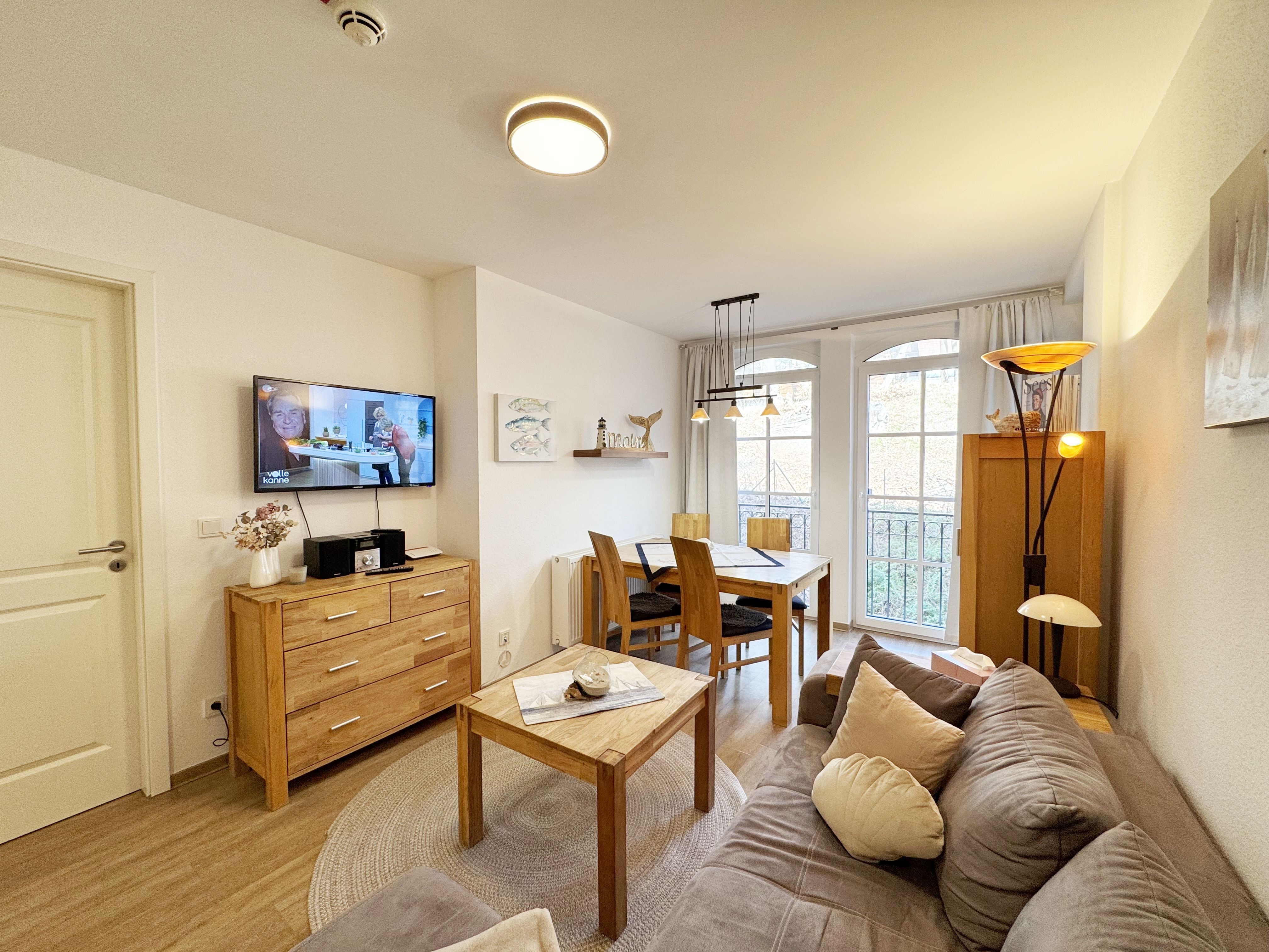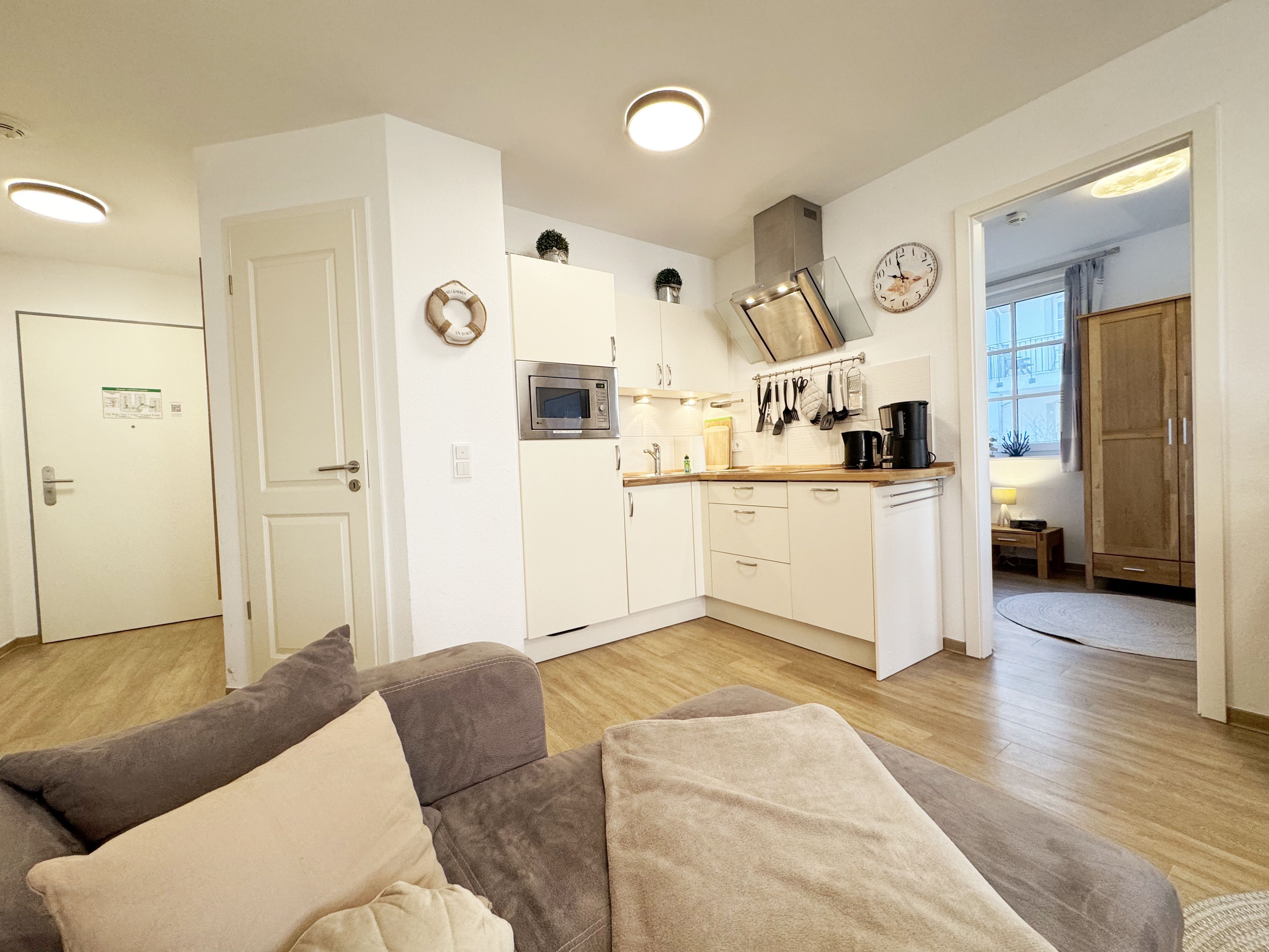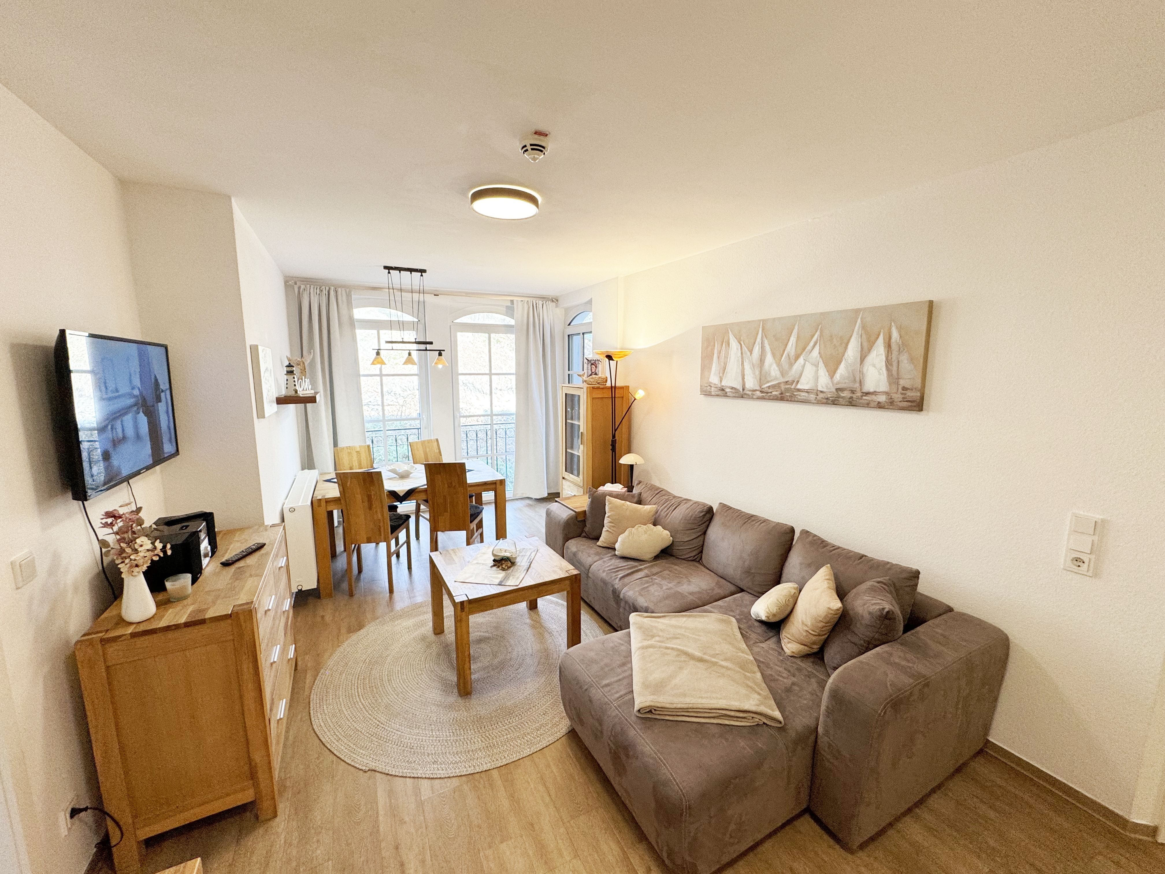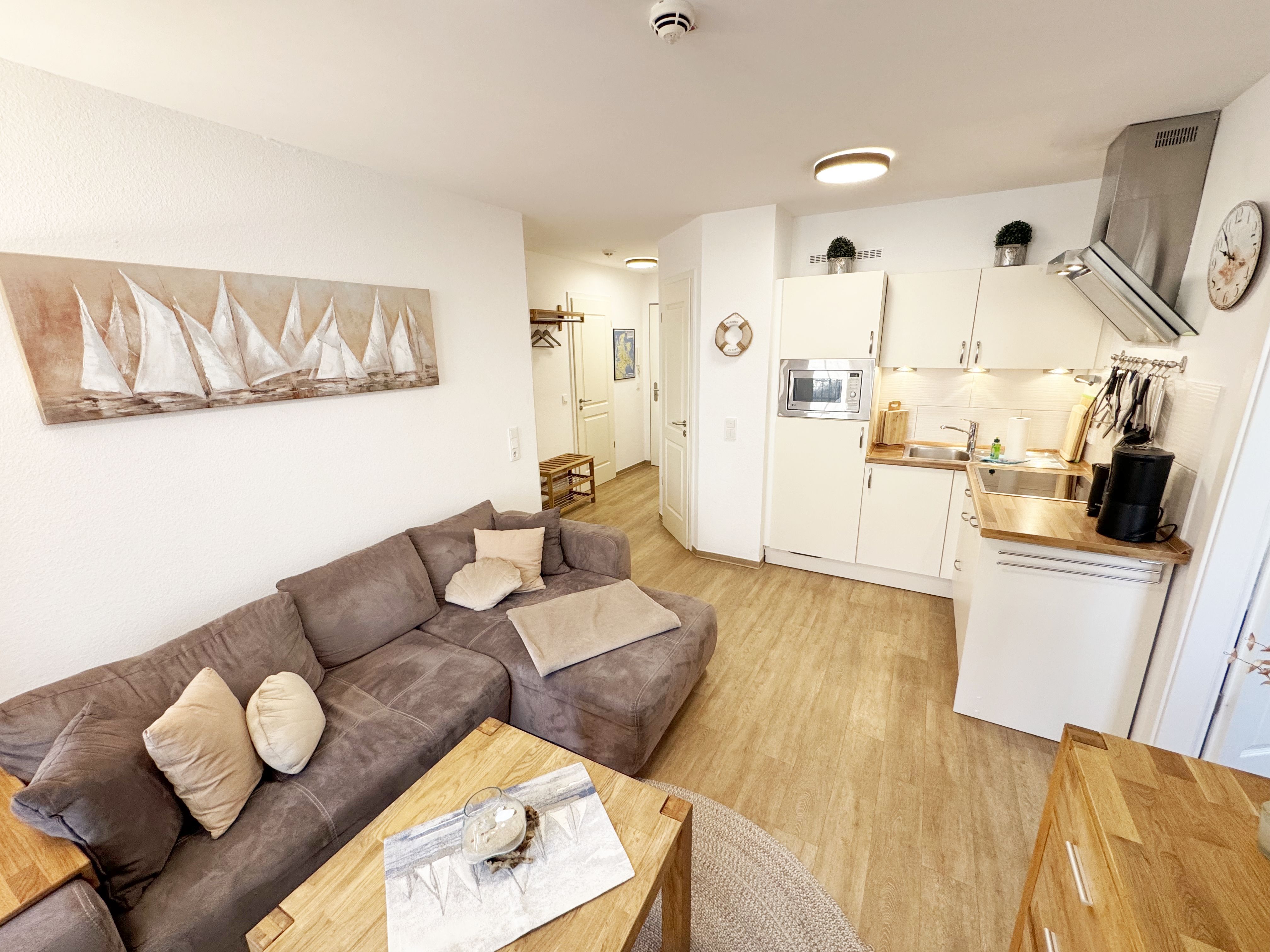 Ihre Nichtraucher/Ferienwohnung ist mit viel Liebe zum Detail ausgestattet und eingerichtet worden. Sie wohnen in einer ca. 50 qm Dreizimmerwohnung, die für 2 bis 4 Personen ausgelegt ist. Ein Kleinkind bis 3 Jahre kann zusätzlich im mitgebrachten bzw. dazu gebuchten Kinderreisebett untergebracht werden. Die Wohnung A 1.23 befindet sich in der 1. Etage und ist per Fahrstuhl bequem zu erreichen. In der Wohnung finden Sie einen kombinierten Wohn-/Koch- und Essbereich. Die integrierte moderne Küchenzeile lässt mit einer eingebauten Mikrowelle mit Grillfunktion, Ceran-Kochfeld, Dunstabzugshaube, Geschirrspüler, Kühlschrank mit Eisfach, Kaffeemaschine und anderen praktischen Helfern keine kulinarischen Wünsche offen. Der offene Wohnbereich ist geschmackvoll mit Massivholzmöbeln, Leder-Ecksofa, Stehlampe und einer Vitrine eingerichtet. Abgerundet wird der Wohnbereich mit einer Musikanlage mit CD und DVD sowie einem Smart-TV. Auch auf einen Internetanschluss (WLAN) müssen Sie im Urlaub nicht verzichten. Dieser ist für Sie inklusive! Direkt vor den großen Balkonfenstern finden Sie einen Esstisch mit 4 Stühlen, der Ihnen genügend Platz bietet. Der Balkon (mit eingeschränktem Meerblick) verfügt über einen Massivholzesstisch und vier Stühle. Begehbar ist der Balkon von dem Wohn-/Essbereich. Das 1. Schlafzimmer ist mit einem Doppelbett (1,80 m x 2,00 m), Nachttischkonsolen und Kleiderschrank ausgestattet. Das 2. Schlafzimmer verfügt über 2 Einzelbetten (0,90 m x 2,00 m), Kleiderschrank und einem 23 Zoll LCD-TV mit integrierten DVD-Player. Verdunkelungsgardinen schützen in der Wohnung vor fremden Blicken von außerhalb. Insektenschutzgitter sorgen zusätzlich für einen ruhigen Schlaf. In der Abstellkammer der Wohnung finden Sie einen Staubsauger, Wäschetrockner für den Balkon und ein wenig Abstellfläche. Das hochwertige Bad ist mit einer ebenerdigen Echtglasdusche, Waschtischkombination mit integriertem Waschbecken, beleuchtetem Spiegelschrank, Kosmetikspiegel, Fön, WC und einem Handtuchheizkörper versehen. Ein eigener PKW-Stellplatz (Nr. 106, Einfahrtshöhe 2,00m) befindet sich in der Tiefgarage des Hauses. 1 Hund (klein bis mittel) kann gegen eine Gebühr mitgebracht werden. Im Keller des Hauses haben Sie die Möglichkeit eine Waschmaschine/Trockner gegen Gebühr zu nutzen. Mit dem Fahrstuhl des Hauses A gelangen sie in das Untergeschoss der Meeresblickanlage, wo Sie ein großzügiger und heller Wellnessbereich erwartet. Hier können sie in einem Pool kleine Bahnen schwimmen, in 2 Saunen Ihren Kreislauf in Schwung bringen, in einem dazugehörigen Ruheraum Ihren Körper wieder beruhigen, in einer Schneckendusche sowie weiteren Duschen das kühle Nass genießen und auf einer Außenterrasse mit Außendusche die frische Luft einatmen. Die Erstausstattung eines Wäschepaketes (komplette Bettwäsche, 1 Duschhandtuch, 2 kleine Handtücher) können Sie bis 14 Tage vor Anreise gegen einen Aufpreis dazu buchen oder durch eigene ergänzen. Ab 2 gebuchten Paketen erhalten Sie einmalig 1 Geschirrhandtuch und 1 Duschvorleger hinzu.