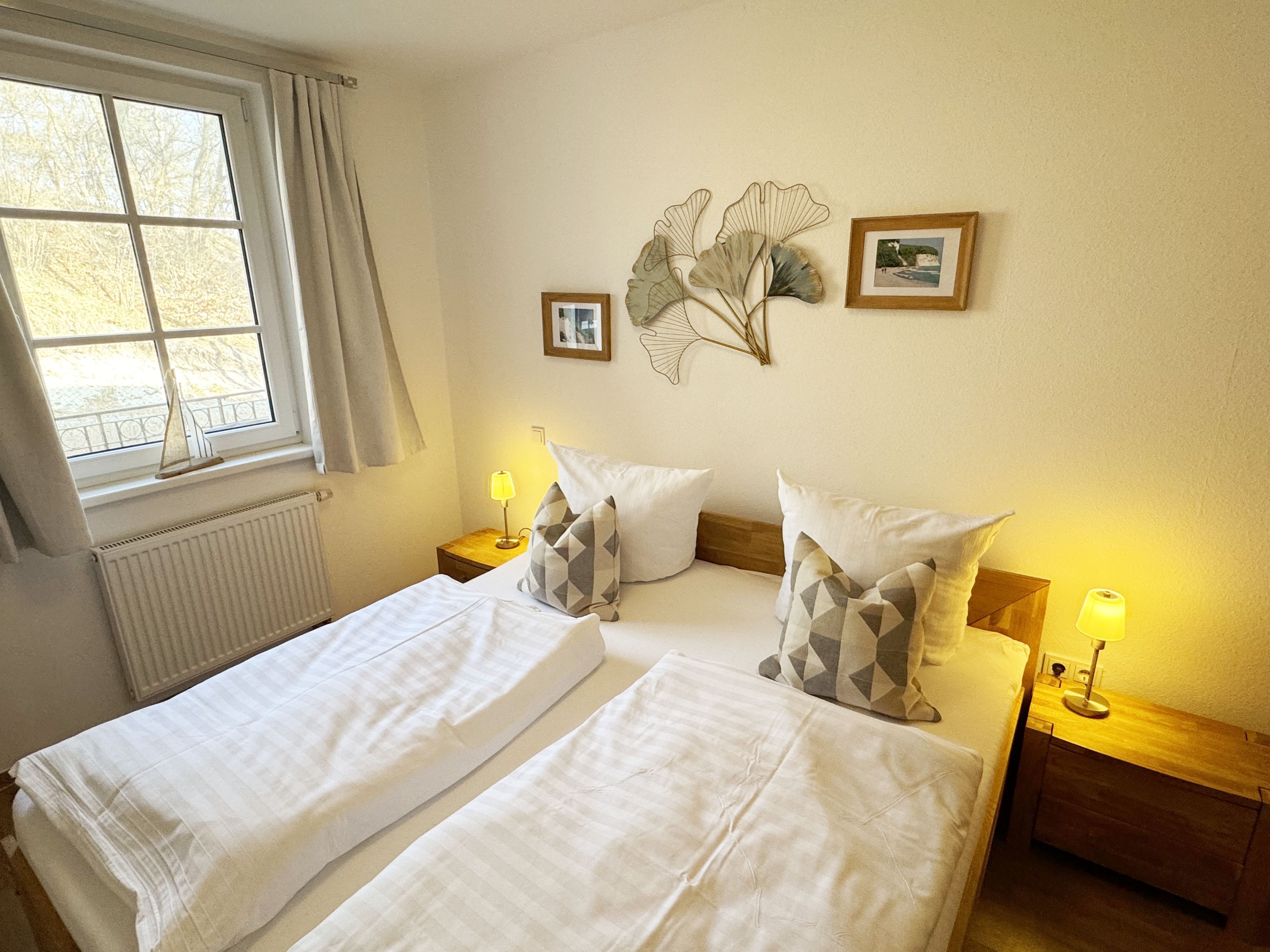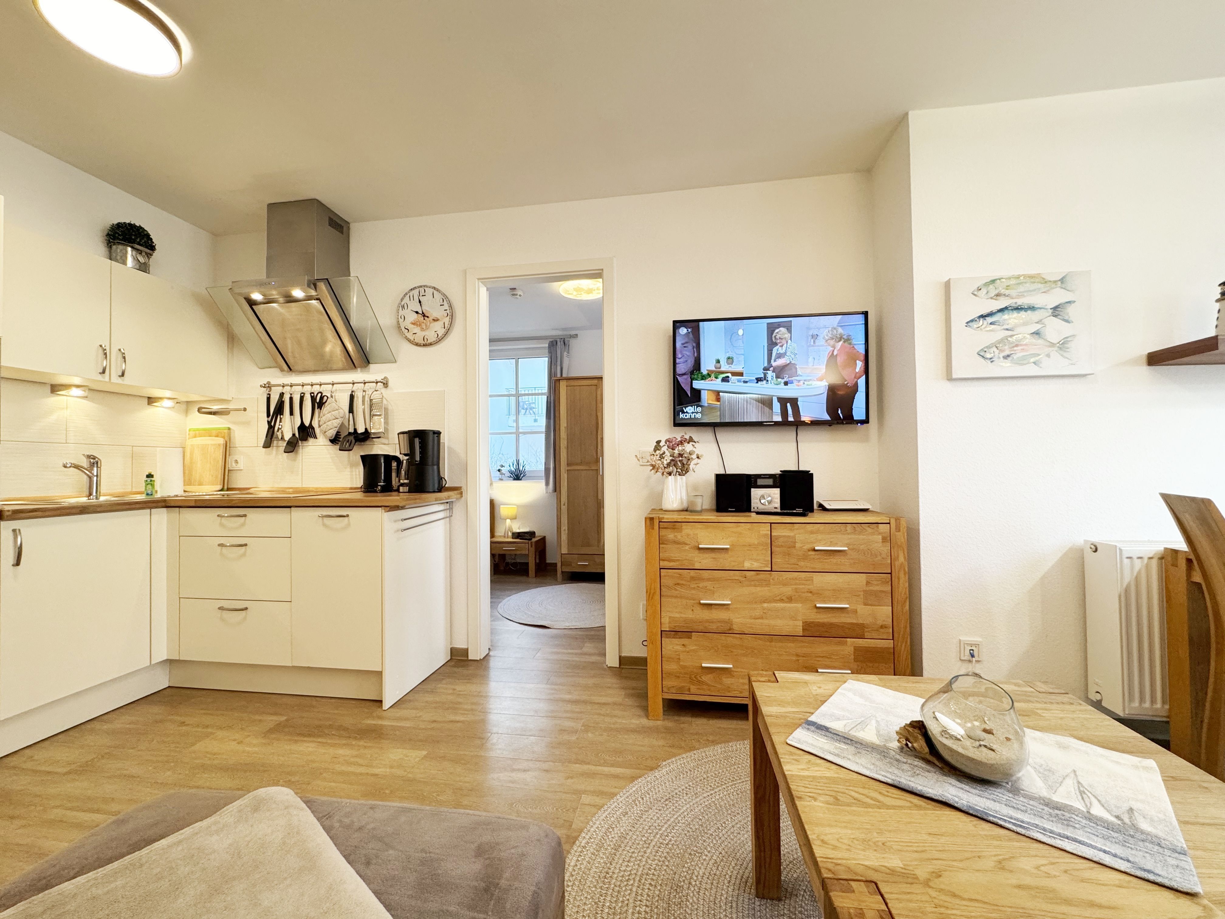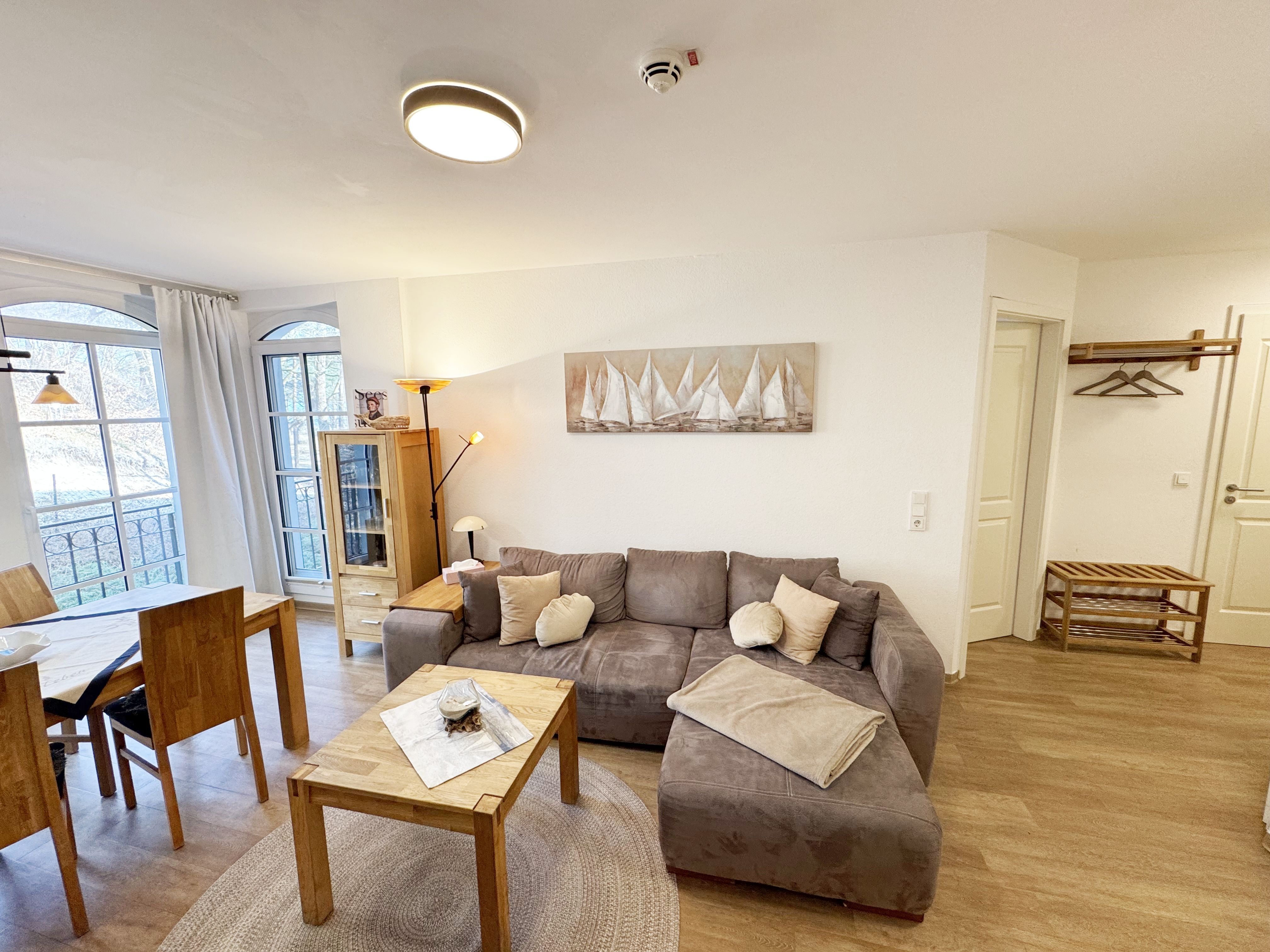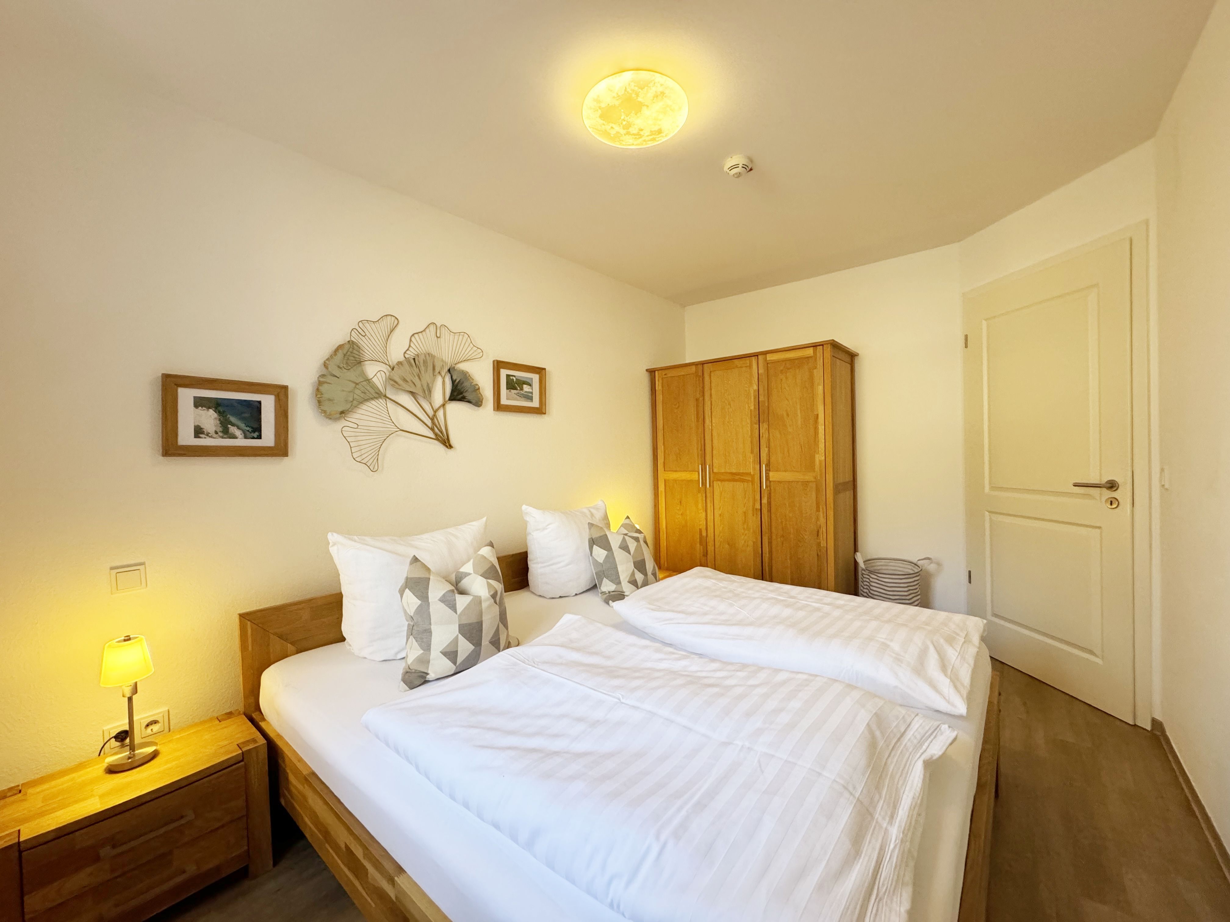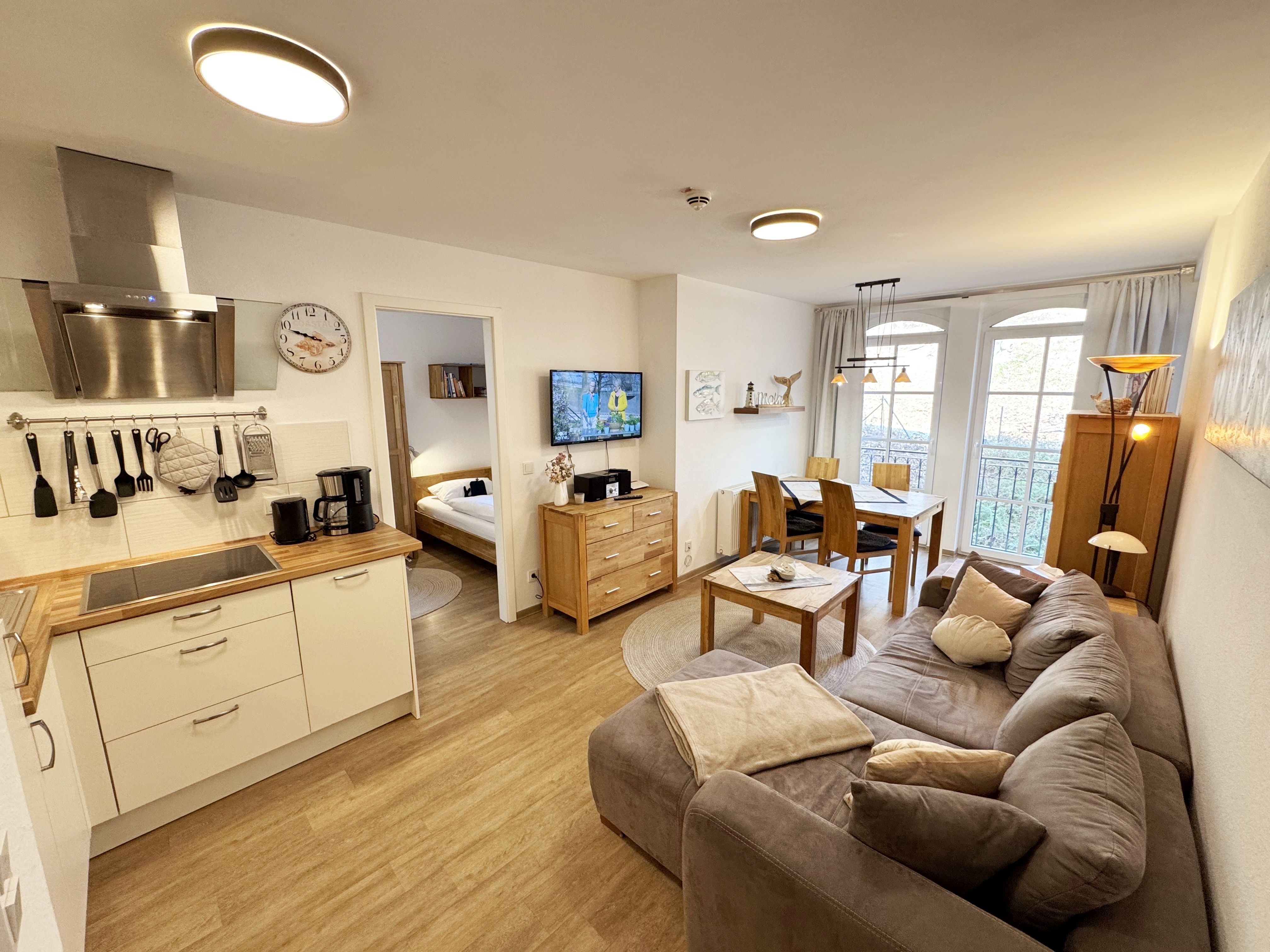 Ihre Nichtraucher/Ferienwohnung ist mit viel Liebe zum Detail ausgestattet und eingerichtet worden. Sie wohnen in einer ca. 50 qm Dreizimmerwohnung, die für 2 bis 4 Personen ausgelegt ist. Ein Kleinkind bis 3 Jahre kann zusätzlich im mitgebrachten bzw. dazu gebuchten Kinderreisebett untergebracht werden. Die Wohnung A 1.23 befindet sich in der 1. Etage und ist per Fahrstuhl bequem zu erreichen. In der Wohnung finden Sie einen kombinierten Wohn-/Koch- und Essbereich. Die integrierte moderne Küchenzeile lässt mit einer eingebauten Mikrowelle mit Grillfunktion, Ceran-Kochfeld, Dunstabzugshaube, Geschirrspüler, Kühlschrank mit Eisfach, Kaffeemaschine und anderen praktischen Helfern keine kulinarischen Wünsche offen. Der offene Wohnbereich ist geschmackvoll mit Massivholzmöbeln, Leder-Ecksofa, Stehlampe und einer Vitrine eingerichtet. Abgerundet wird der Wohnbereich mit einer Musikanlage mit CD und DVD sowie einem Smart-TV. Auch auf einen Internetanschluss (WLAN) müssen Sie im Urlaub nicht verzichten. Dieser ist für Sie inklusive! Direkt vor den großen Balkonfenstern finden Sie einen Esstisch mit 4 Stühlen, der Ihnen genügend Platz bietet. Der Balkon (mit eingeschränktem Meerblick) verfügt über einen Massivholzesstisch und vier Stühle. Begehbar ist der Balkon von dem Wohn-/Essbereich. Das 1. Schlafzimmer ist mit einem Doppelbett (1,80 m x 2,00 m), Nachttischkonsolen und Kleiderschrank ausgestattet. Das 2. Schlafzimmer verfügt über 2 Einzelbetten (0,90 m x 2,00 m), Kleiderschrank und einem 23 Zoll LCD-TV mit integrierten DVD-Player. Verdunkelungsgardinen schützen in der Wohnung vor fremden Blicken von außerhalb. Insektenschutzgitter sorgen zusätzlich für einen ruhigen Schlaf. In der Abstellkammer der Wohnung finden Sie einen Staubsauger, Wäschetrockner für den Balkon und ein wenig Abstellfläche. Das hochwertige Bad ist mit einer ebenerdigen Echtglasdusche, Waschtischkombination mit integriertem Waschbecken, beleuchtetem Spiegelschrank, Kosmetikspiegel, Fön, WC und einem Handtuchheizkörper versehen. Ein eigener PKW-Stellplatz (Nr. 106, Einfahrtshöhe 2,00m) befindet sich in der Tiefgarage des Hauses. 1 Hund (klein bis mittel) kann gegen eine Gebühr mitgebracht werden. Im Keller des Hauses haben Sie die Möglichkeit eine Waschmaschine/Trockner gegen Gebühr zu nutzen. Mit dem Fahrstuhl des Hauses A gelangen sie in das Untergeschoss der Meeresblickanlage, wo Sie ein großzügiger und heller Wellnessbereich erwartet. Hier können sie in einem Pool kleine Bahnen schwimmen, in 2 Saunen Ihren Kreislauf in Schwung bringen, in einem dazugehörigen Ruheraum Ihren Körper wieder beruhigen, in einer Schneckendusche sowie weiteren Duschen das kühle Nass genießen und auf einer Außenterrasse mit Außendusche die frische Luft einatmen. Die Erstausstattung eines Wäschepaketes (komplette Bettwäsche, 1 Duschhandtuch, 2 kleine Handtücher) können Sie bis 14 Tage vor Anreise gegen einen Aufpreis dazu buchen oder durch eigene ergänzen. Ab 2 gebuchten Paketen erhalten Sie einmalig 1 Geschirrhandtuch und 1 Duschvorleger hinzu.
