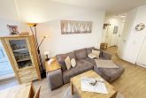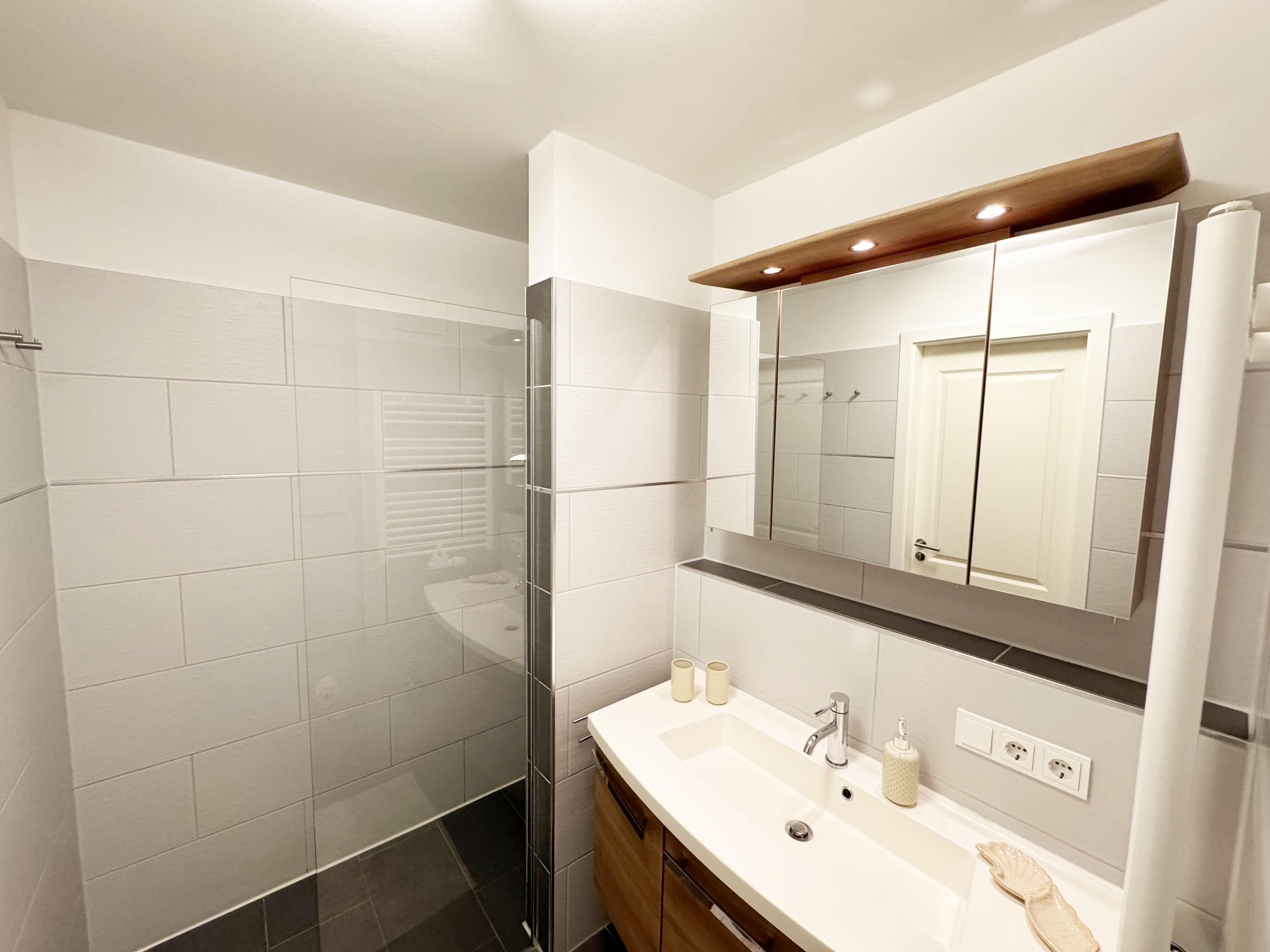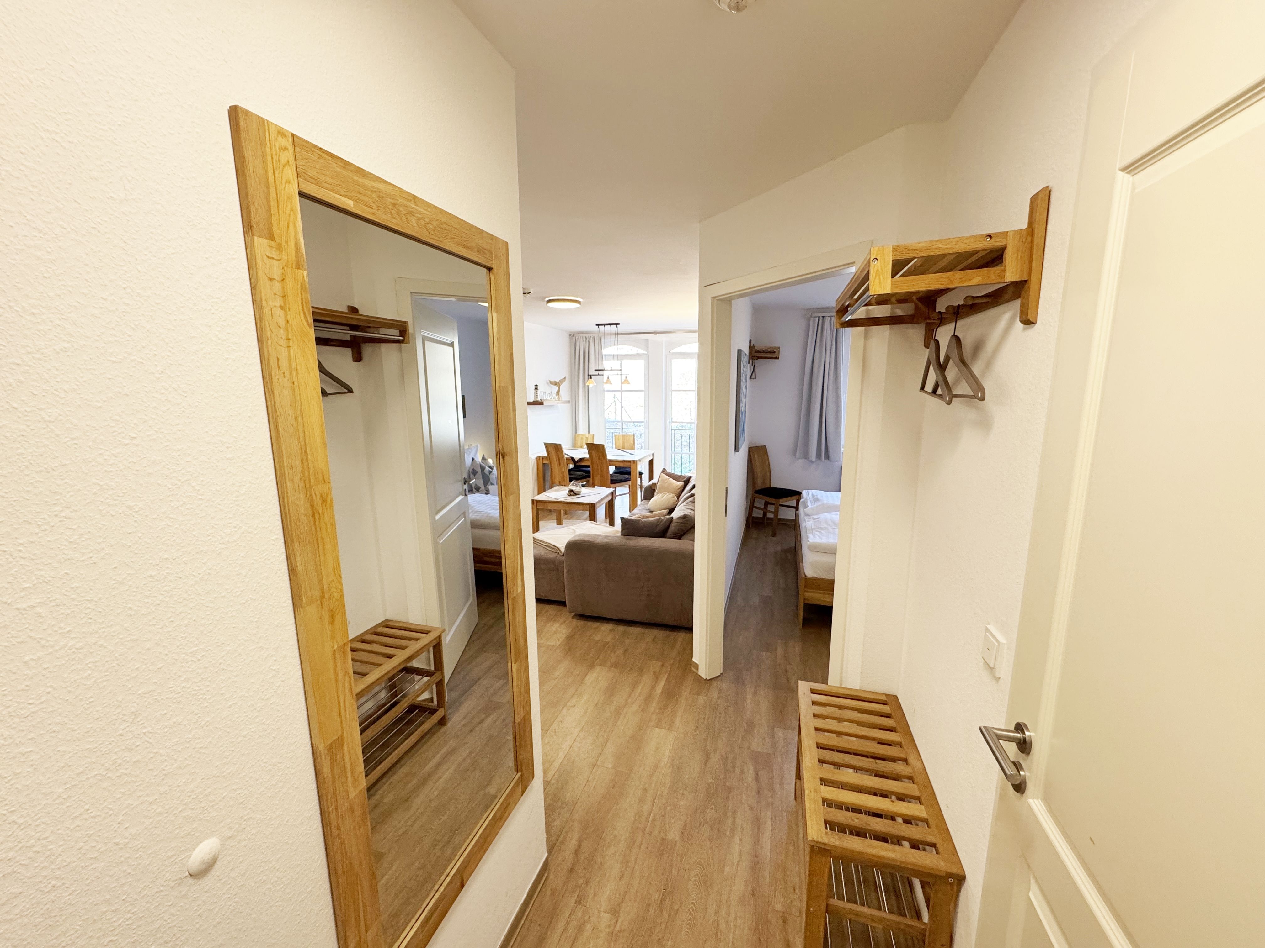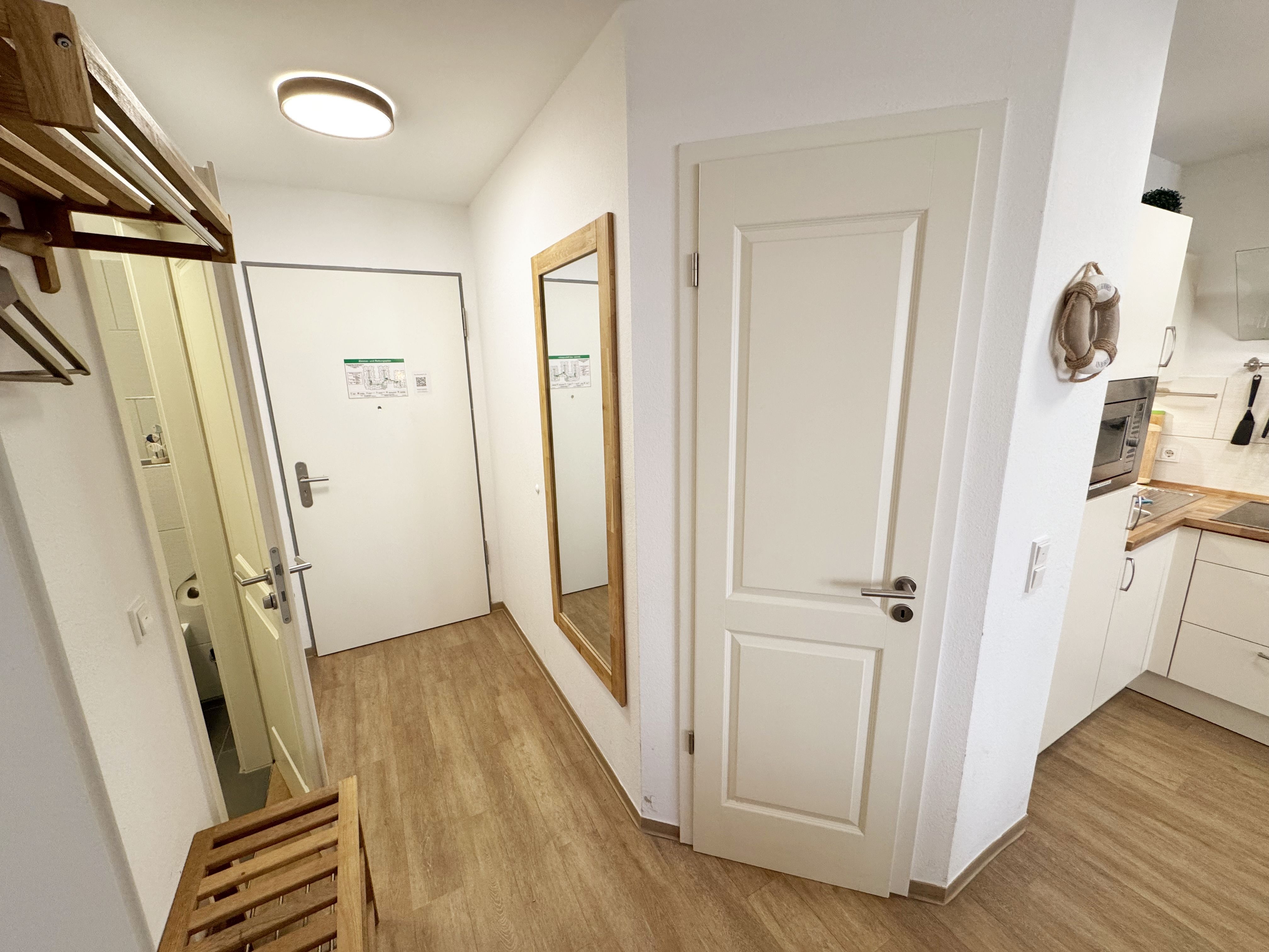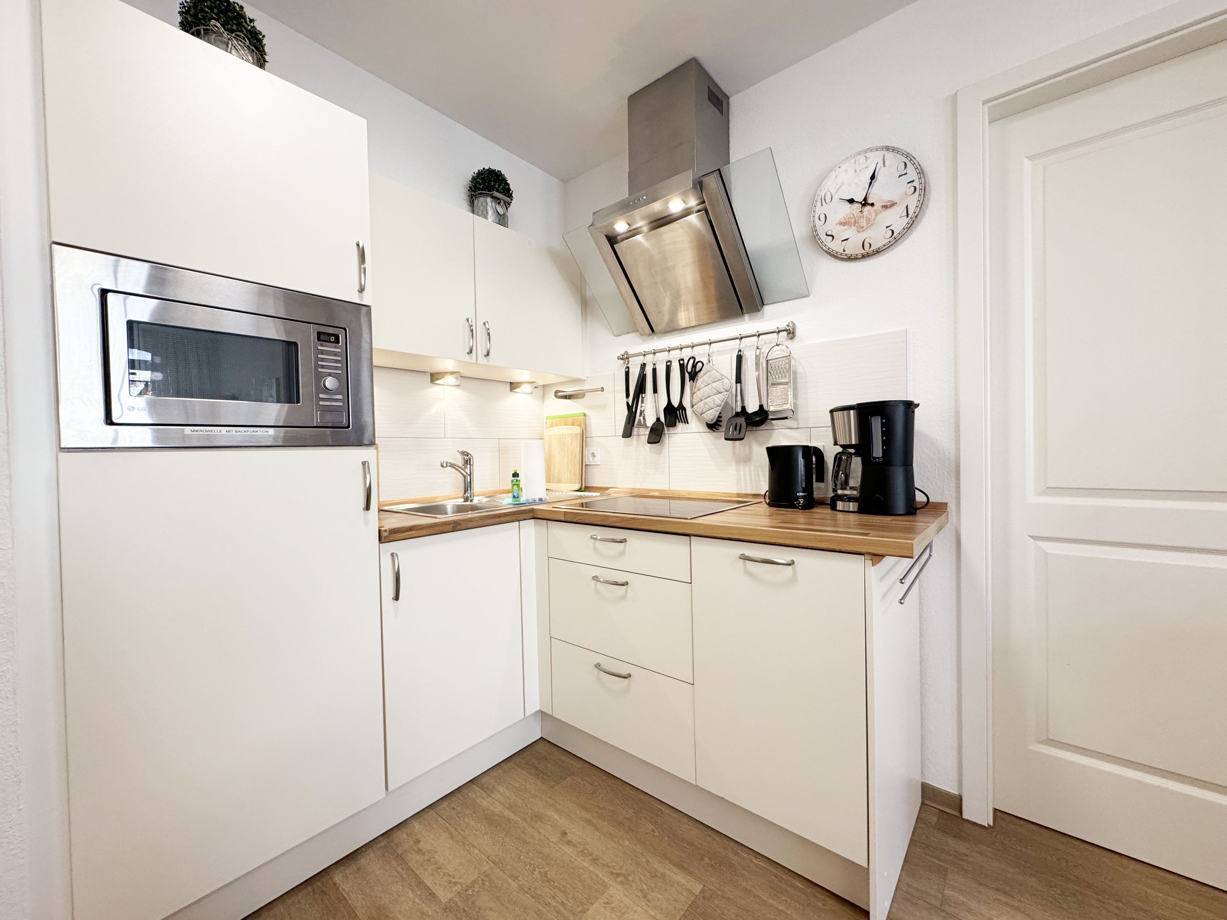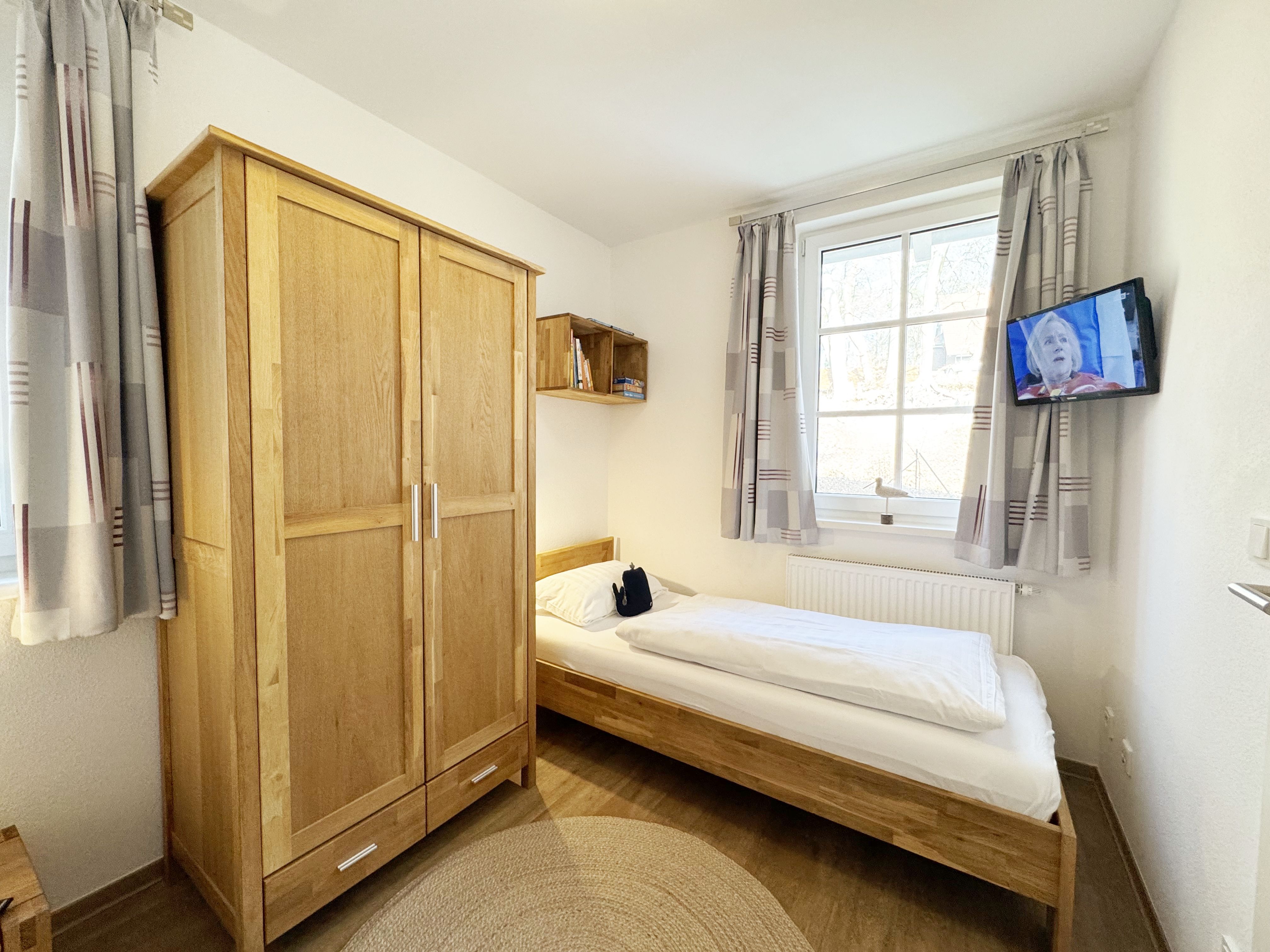 Ihre Nichtraucher/Ferienwohnung ist mit viel Liebe zum Detail ausgestattet und eingerichtet worden. Sie wohnen in einer ca. 50 qm Dreizimmerwohnung, die für 2 bis 4 Personen ausgelegt ist. Ein Kleinkind bis 3 Jahre kann zusätzlich im mitgebrachten bzw. dazu gebuchten Kinderreisebett untergebracht werden. Die Wohnung A 1.23 befindet sich in der 1. Etage und ist per Fahrstuhl bequem zu erreichen. In der Wohnung finden Sie einen kombinierten Wohn-/Koch- und Essbereich. Die integrierte moderne Küchenzeile lässt mit einer eingebauten Mikrowelle mit Grillfunktion, Ceran-Kochfeld, Dunstabzugshaube, Geschirrspüler, Kühlschrank mit Eisfach, Kaffeemaschine und anderen praktischen Helfern keine kulinarischen Wünsche offen. Der offene Wohnbereich ist geschmackvoll mit Massivholzmöbeln, Leder-Ecksofa, Stehlampe und einer Vitrine eingerichtet. Abgerundet wird der Wohnbereich mit einer Musikanlage mit CD und DVD sowie einem Smart-TV. Auch auf einen Internetanschluss (WLAN) müssen Sie im Urlaub nicht verzichten. Dieser ist für Sie inklusive! Direkt vor den großen Balkonfenstern finden Sie einen Esstisch mit 4 Stühlen, der Ihnen genügend Platz bietet. Der Balkon (mit eingeschränktem Meerblick) verfügt über einen Massivholzesstisch und vier Stühle. Begehbar ist der Balkon von dem Wohn-/Essbereich. Das 1. Schlafzimmer ist mit einem Doppelbett (1,80 m x 2,00 m), Nachttischkonsolen und Kleiderschrank ausgestattet. Das 2. Schlafzimmer verfügt über 2 Einzelbetten (0,90 m x 2,00 m), Kleiderschrank und einem 23 Zoll LCD-TV mit integrierten DVD-Player. Verdunkelungsgardinen schützen in der Wohnung vor fremden Blicken von außerhalb. Insektenschutzgitter sorgen zusätzlich für einen ruhigen Schlaf. In der Abstellkammer der Wohnung finden Sie einen Staubsauger, Wäschetrockner für den Balkon und ein wenig Abstellfläche. Das hochwertige Bad ist mit einer ebenerdigen Echtglasdusche, Waschtischkombination mit integriertem Waschbecken, beleuchtetem Spiegelschrank, Kosmetikspiegel, Fön, WC und einem Handtuchheizkörper versehen. Ein eigener PKW-Stellplatz (Nr. 106, Einfahrtshöhe 2,00m) befindet sich in der Tiefgarage des Hauses. 1 Hund (klein bis mittel) kann gegen eine Gebühr mitgebracht werden. Im Keller des Hauses haben Sie die Möglichkeit eine Waschmaschine/Trockner gegen Gebühr zu nutzen. Mit dem Fahrstuhl des Hauses A gelangen sie in das Untergeschoss der Meeresblickanlage, wo Sie ein großzügiger und heller Wellnessbereich erwartet. Hier können sie in einem Pool kleine Bahnen schwimmen, in 2 Saunen Ihren Kreislauf in Schwung bringen, in einem dazugehörigen Ruheraum Ihren Körper wieder beruhigen, in einer Schneckendusche sowie weiteren Duschen das kühle Nass genießen und auf einer Außenterrasse mit Außendusche die frische Luft einatmen. Die Erstausstattung eines Wäschepaketes (komplette Bettwäsche, 1 Duschhandtuch, 2 kleine Handtücher) können Sie bis 14 Tage vor Anreise gegen einen Aufpreis dazu buchen oder durch eigene ergänzen. Ab 2 gebuchten Paketen erhalten Sie einmalig 1 Geschirrhandtuch und 1 Duschvorleger hinzu.