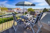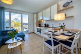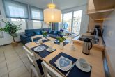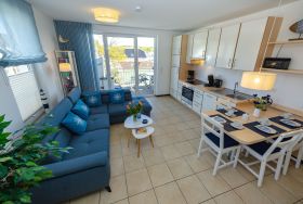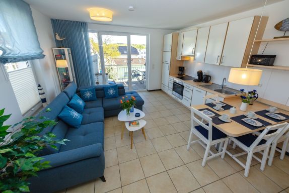 Die offene Küche verfügt über einen 4-Zonen-Ceranherd mit Backofen, einen Kühlschrank mit Gefrierfach, eine Spülmaschine, eine Mikrowelle sowie Kaffeemaschine, Wasserkocher und Toaster. Natürlich sind auch ausreichend Koch- und Essgeschirr und weiteres nützliches Kleininventar vorhanden. Bis zum nächsten Bäcker für die frischen Frühstücksbrötchen sind es nur rund zwei Gehminuten. Speisen können Sie ganz nach Belieben entweder am großen Esstisch im Wohnzimmer oder draußen auf dem Balkon, der zur sonnigen Südost-Seite ausgerichtet ist.