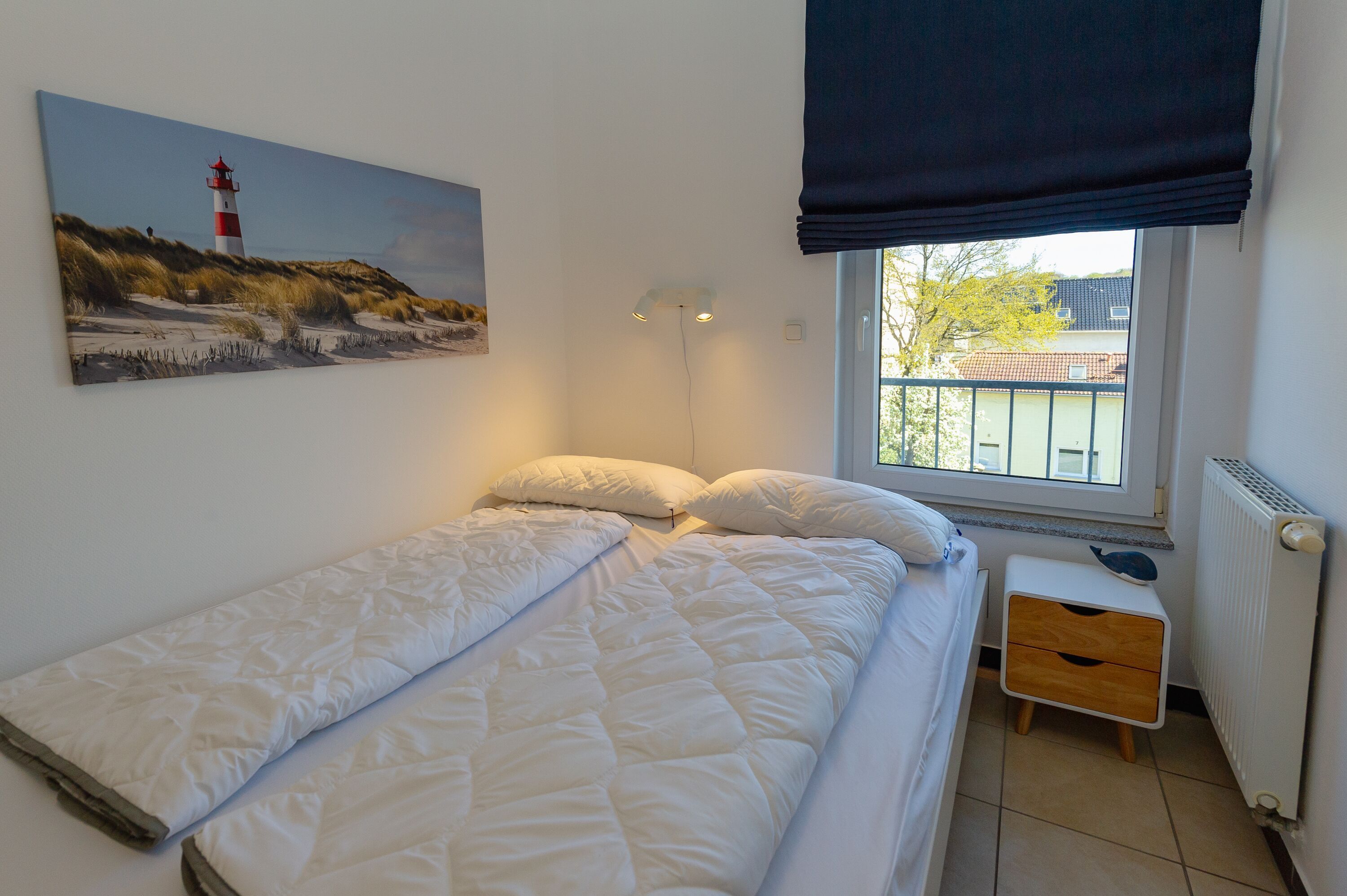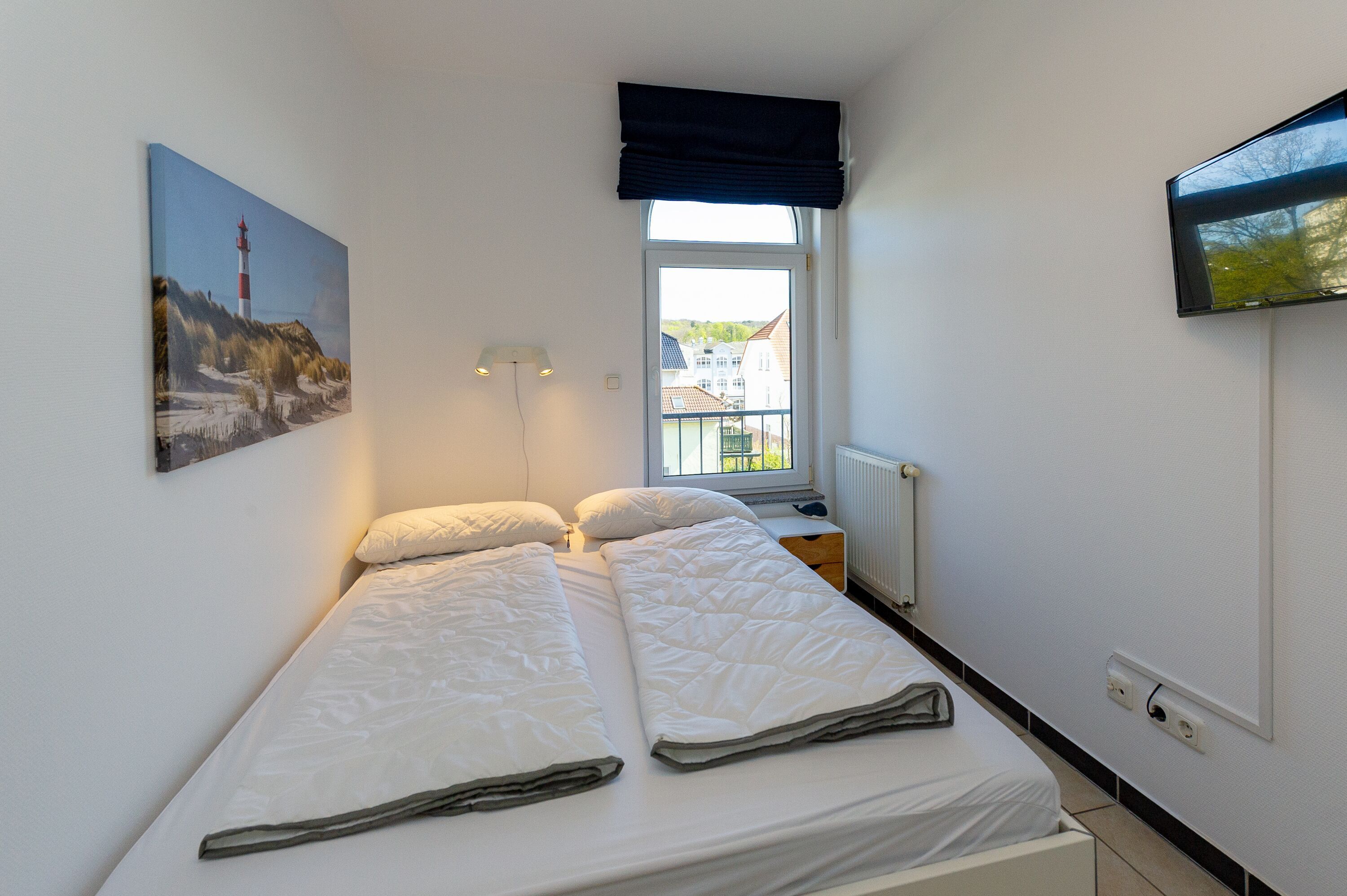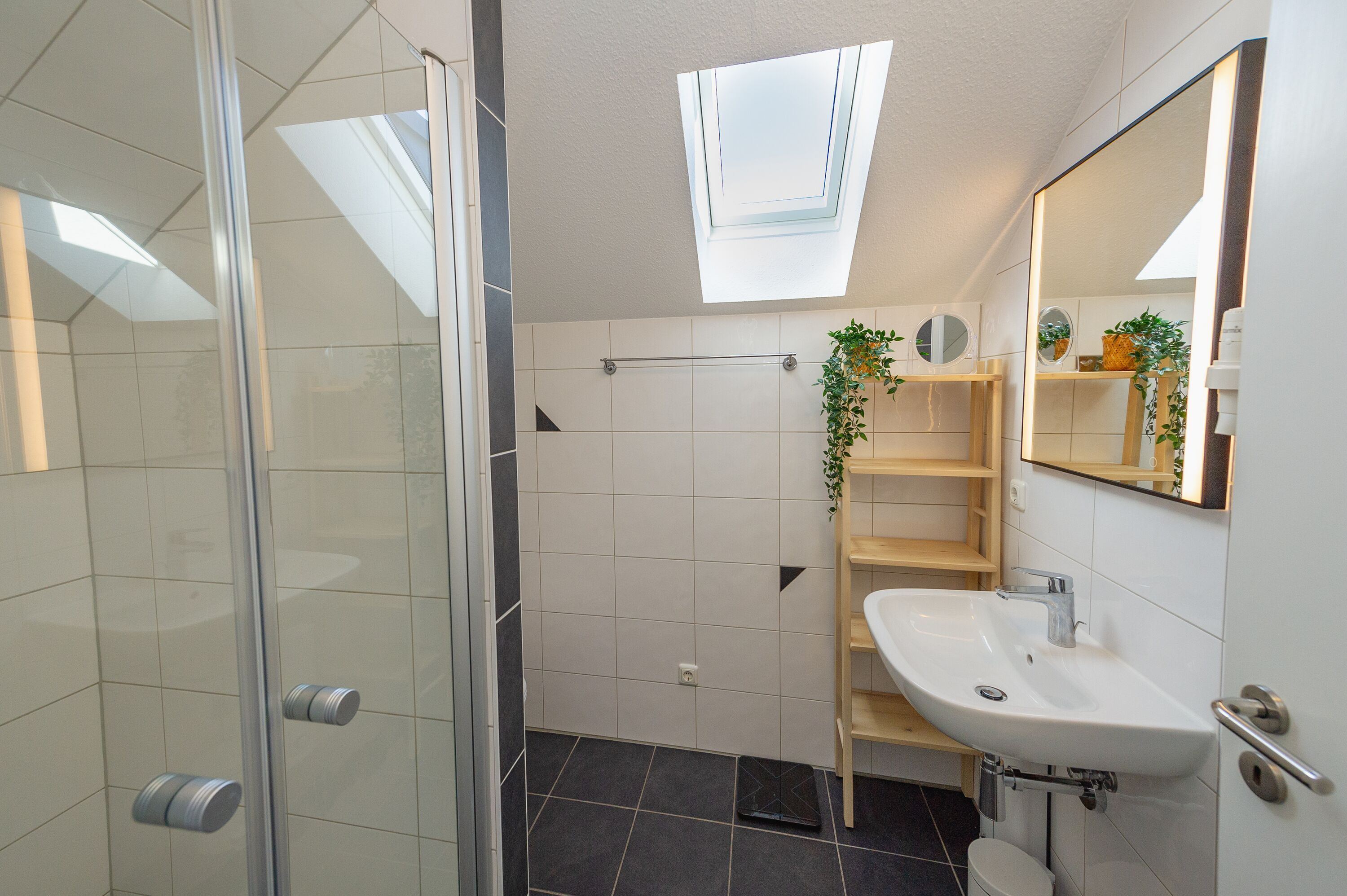Ein paar Treppenstufen höher finden Sie unter leichten Dachschrägen das zweite Schlafzimmer - ebenfalls ausgestattet mit einem Doppelbett, einem Kleiderschrank und Fernseher - sowie das Badezimmer mit Dusche/WC, Waschtisch und Fön.