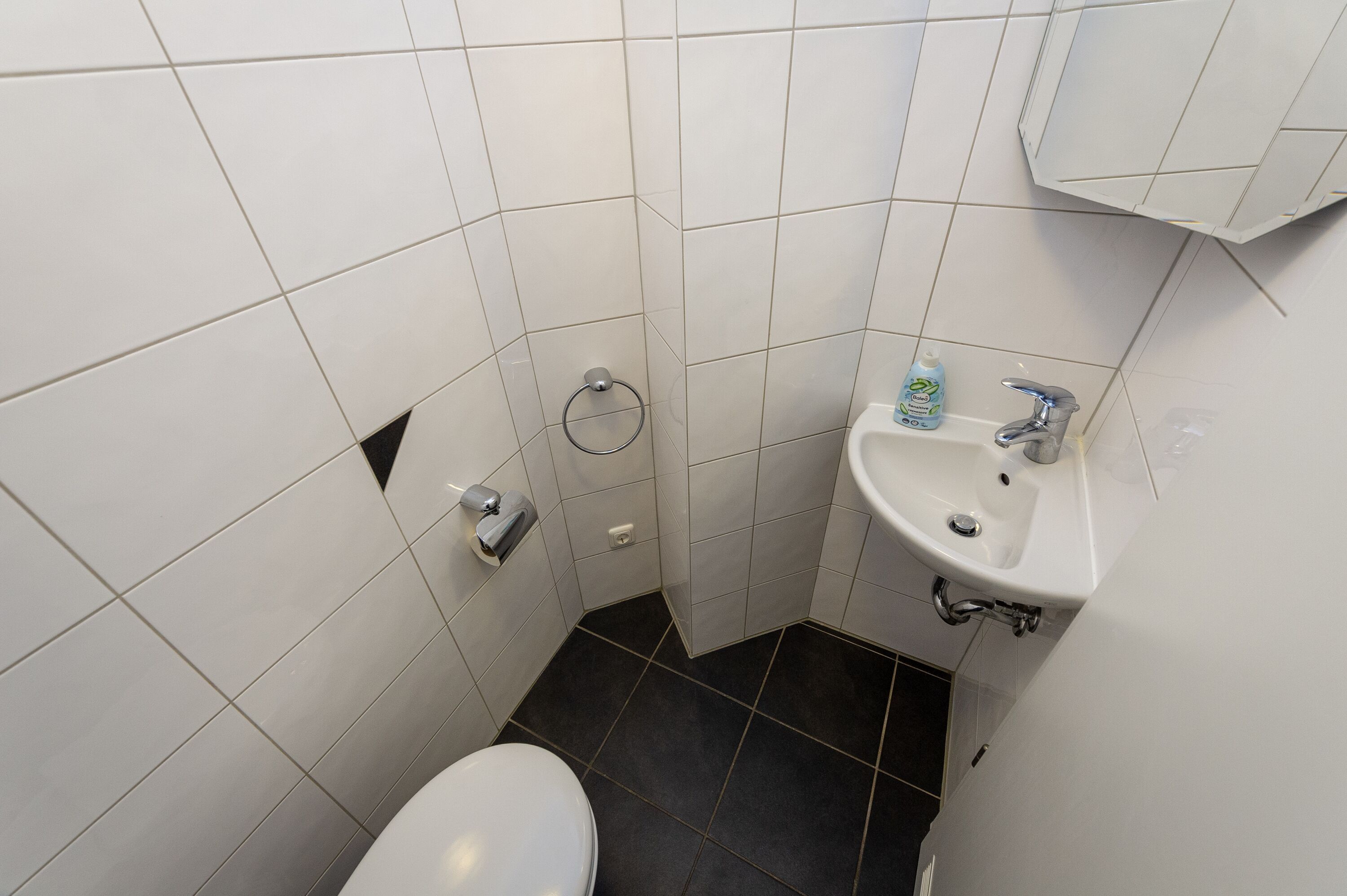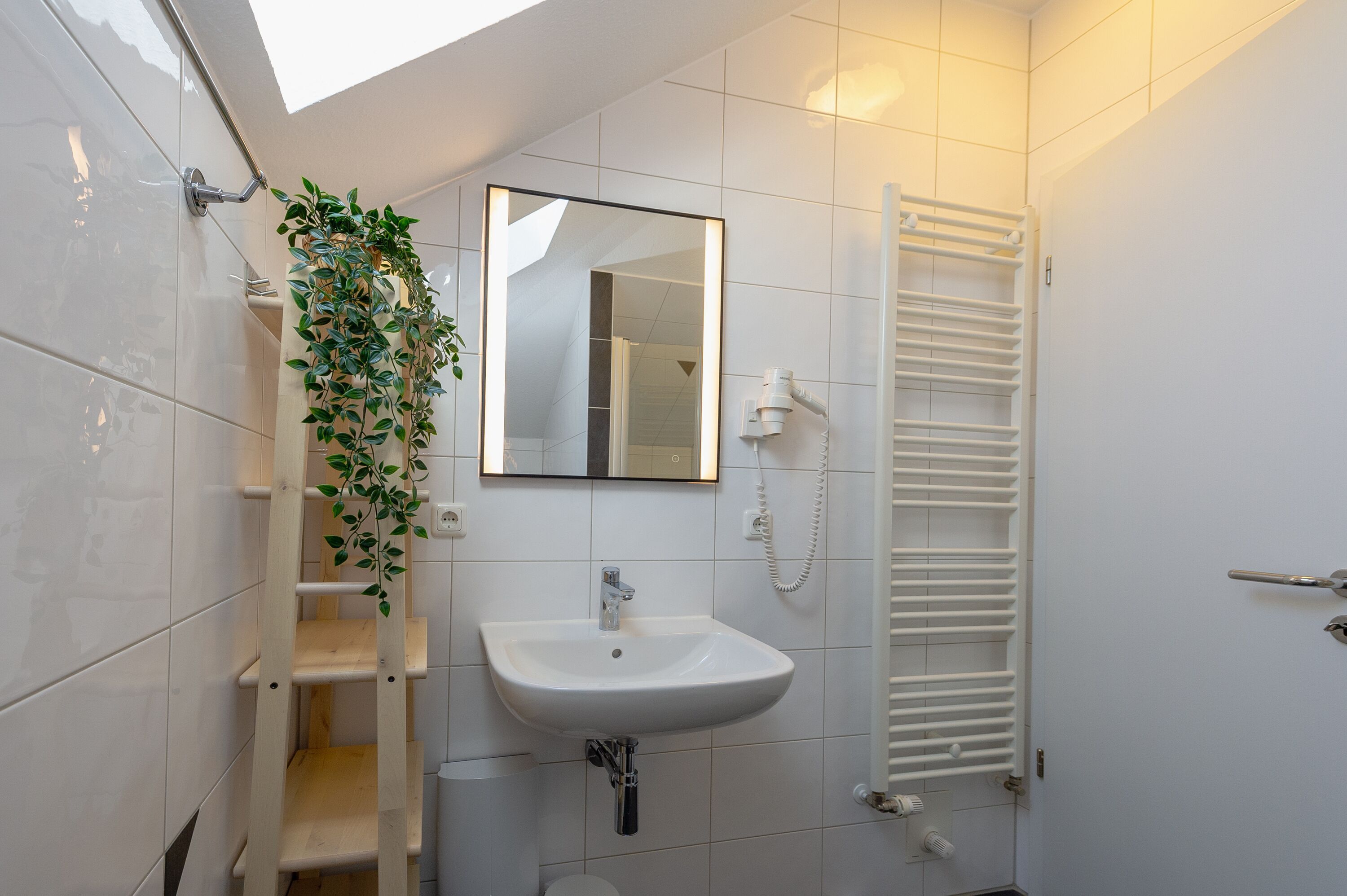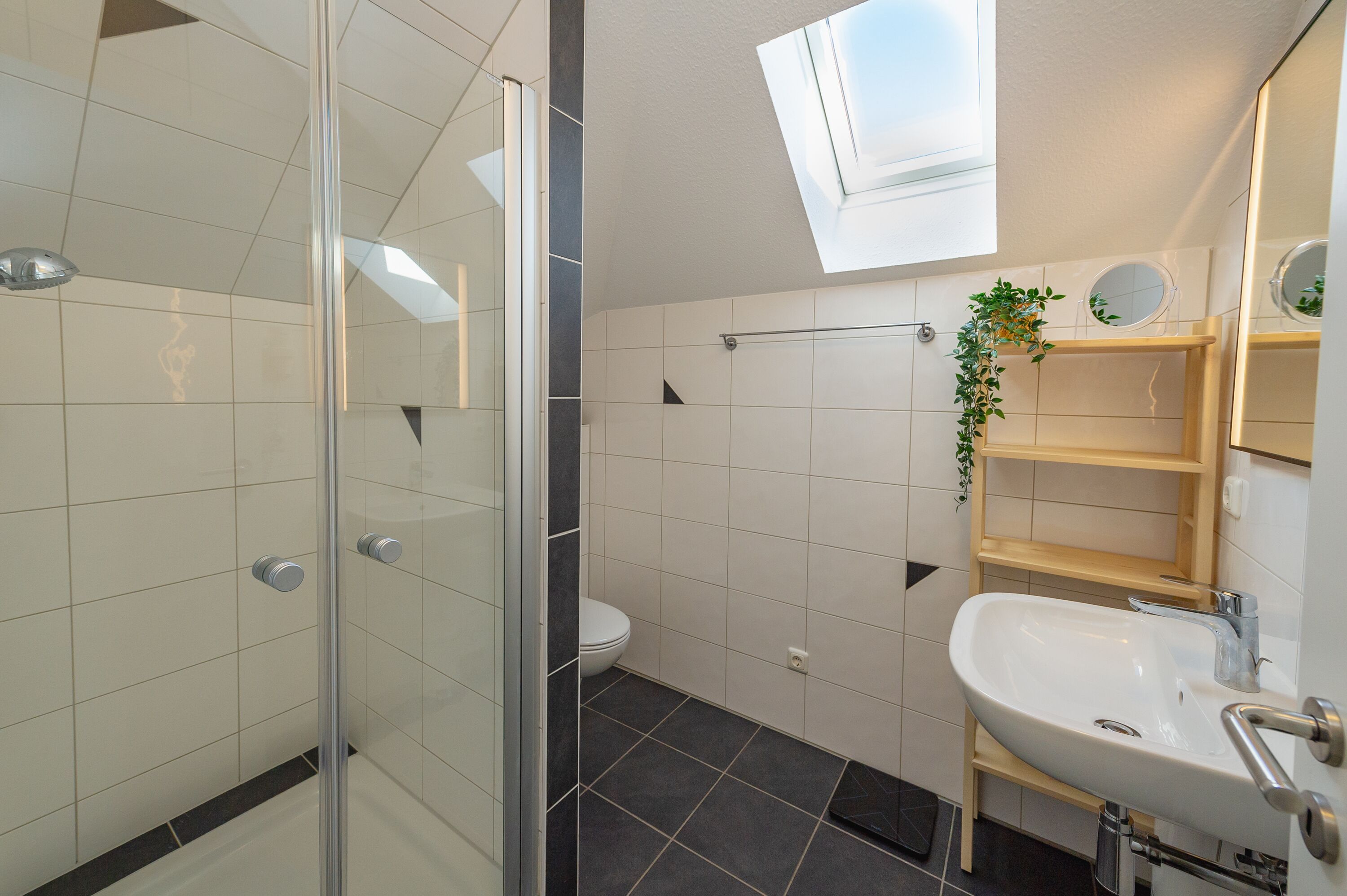 Ein paar Treppenstufen höher finden Sie unter leichten Dachschrägen das zweite Schlafzimmer - ebenfalls ausgestattet mit einem Doppelbett, einem Kleiderschrank und Fernseher - sowie das Badezimmer mit Dusche/WC, Waschtisch und Fön.