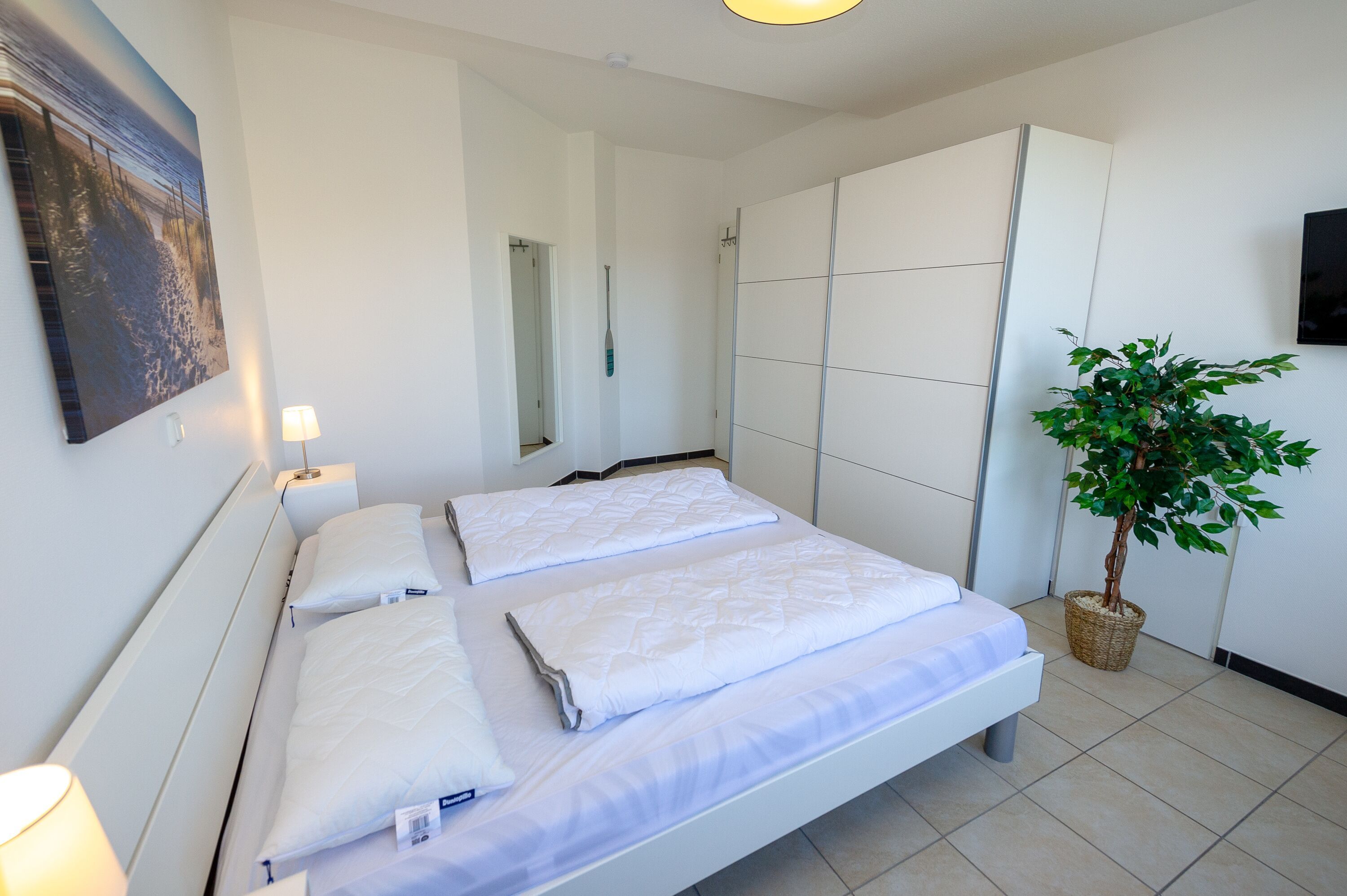 Das Gäste-WC und eines Ihrer beiden Schlafzimmer befinden sich ebenfalls auf dieser Etage. Letzteres ist mit einem komfortablen Doppelbett, einem Kleiderschrank für Ihre Urlaubsgarderobe und einem zusätzlichen Fernsehgerät ausgestattet.