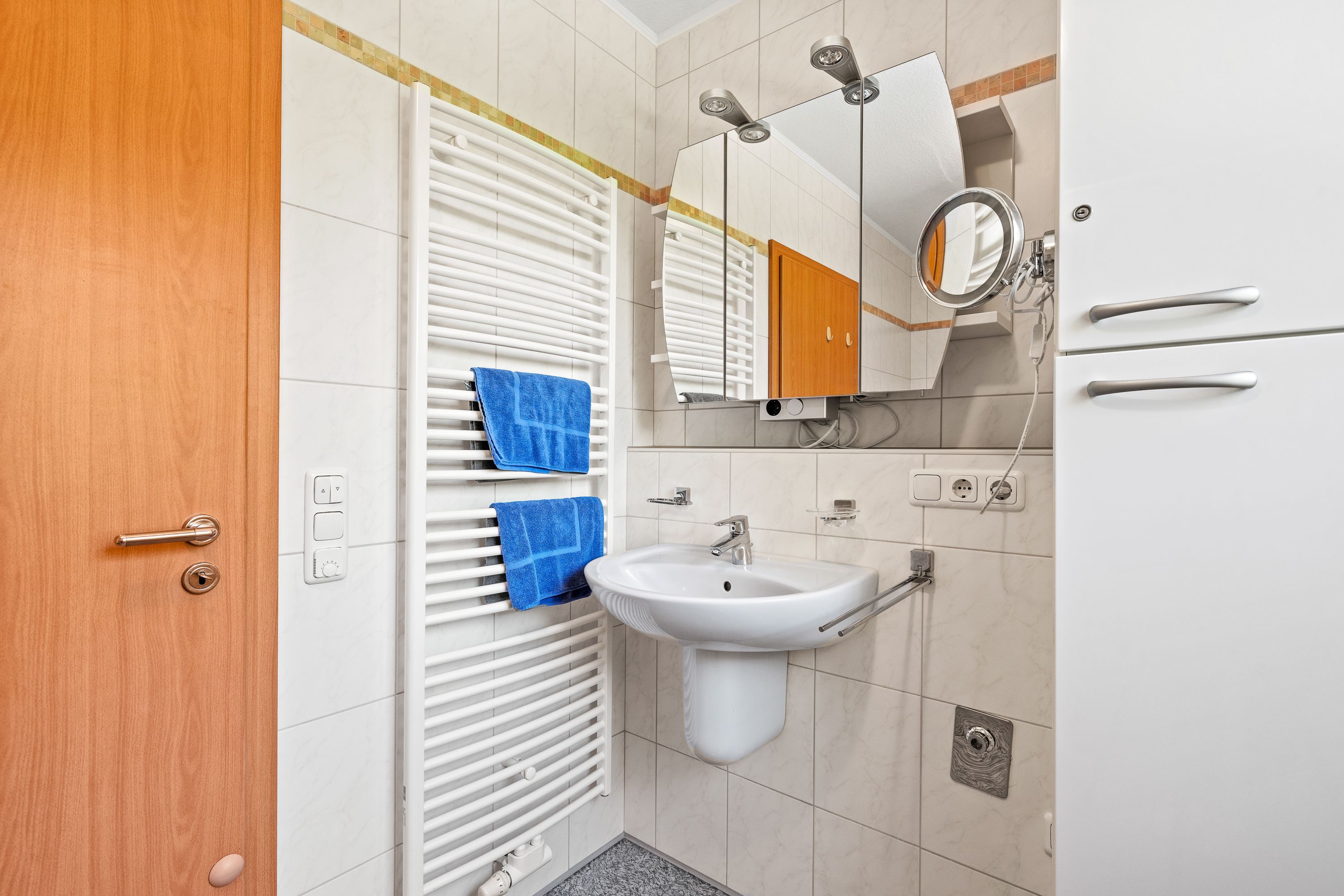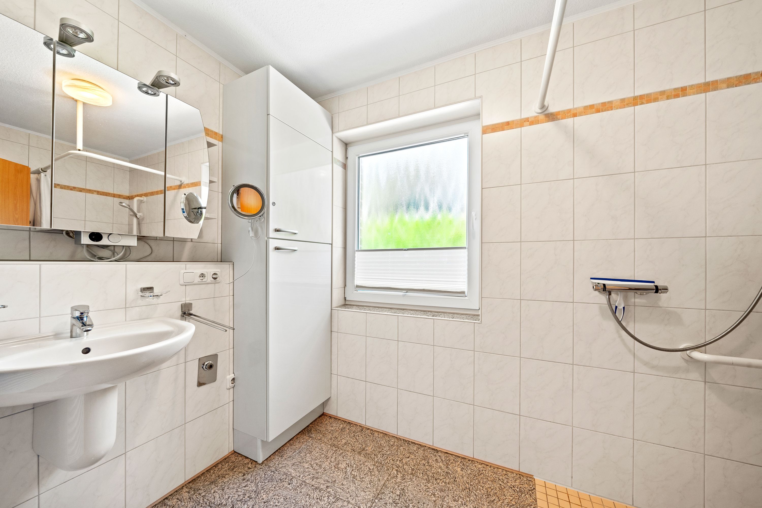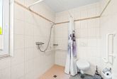 - Badezimmer mit ebenerdiger Dusche, Waschtisch und WC