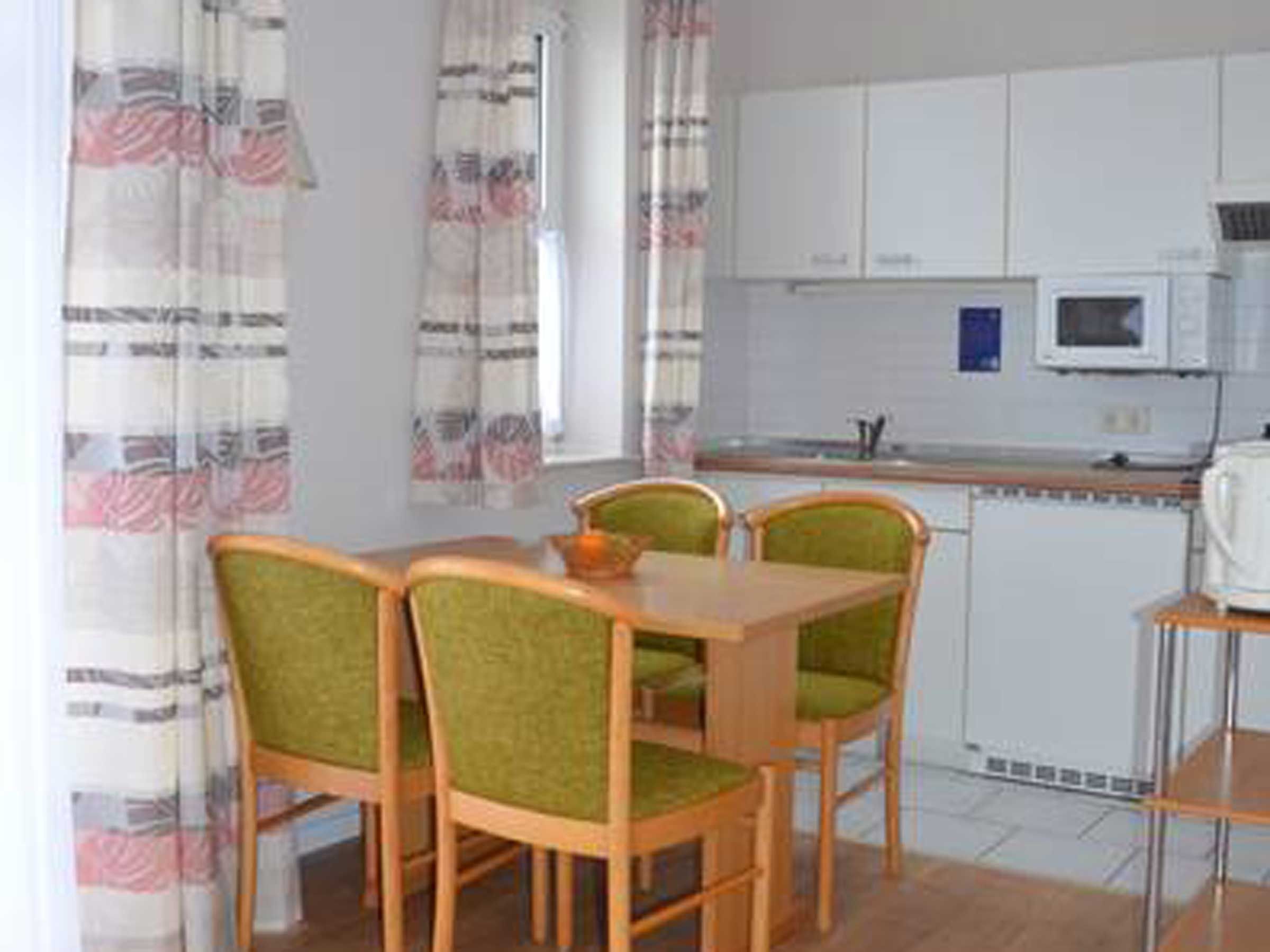 Angrenzend befindet sich der Küchen- und Essbereich mit Esstisch, 4 Stühlen und einer Küchenzeile.