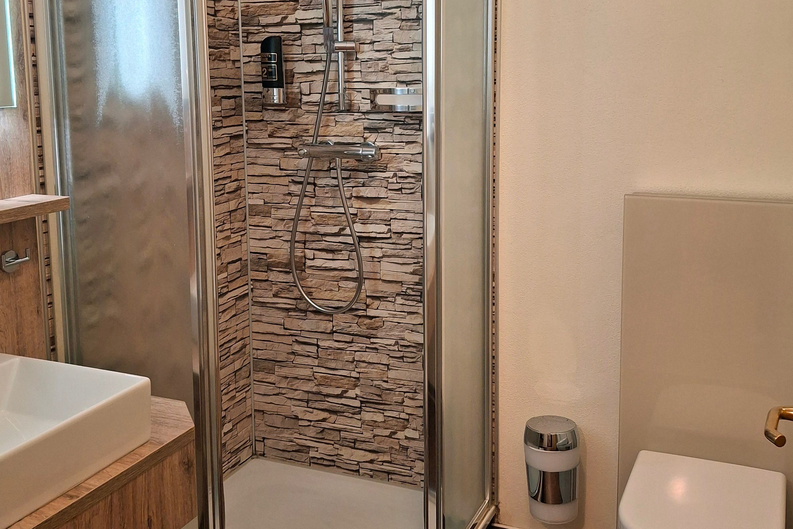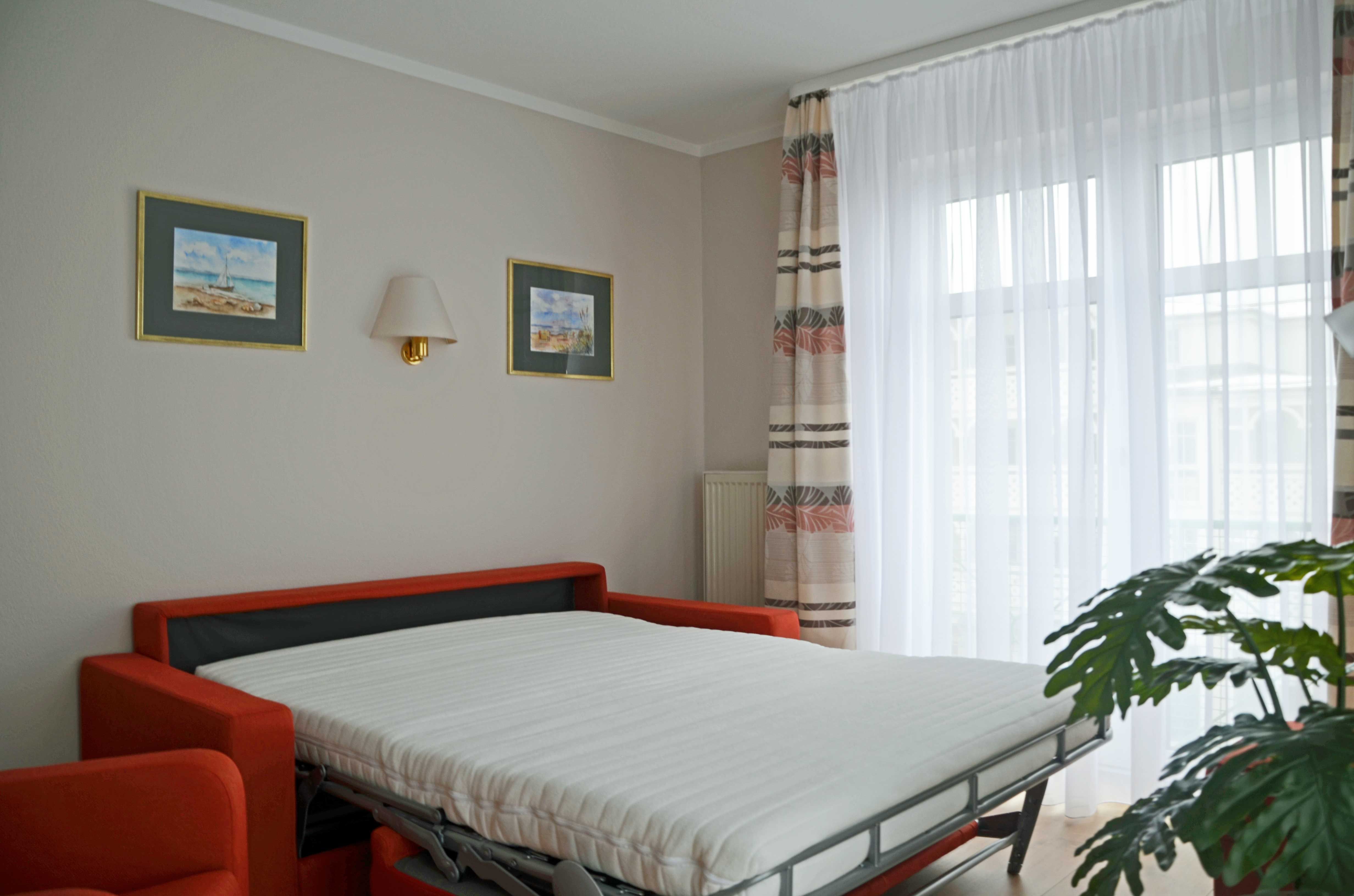 Im Wohn-/Schlafraum können 2 weitere Personen auf unserer neuen, bequemen Doppelbettcouch schlafen.