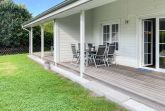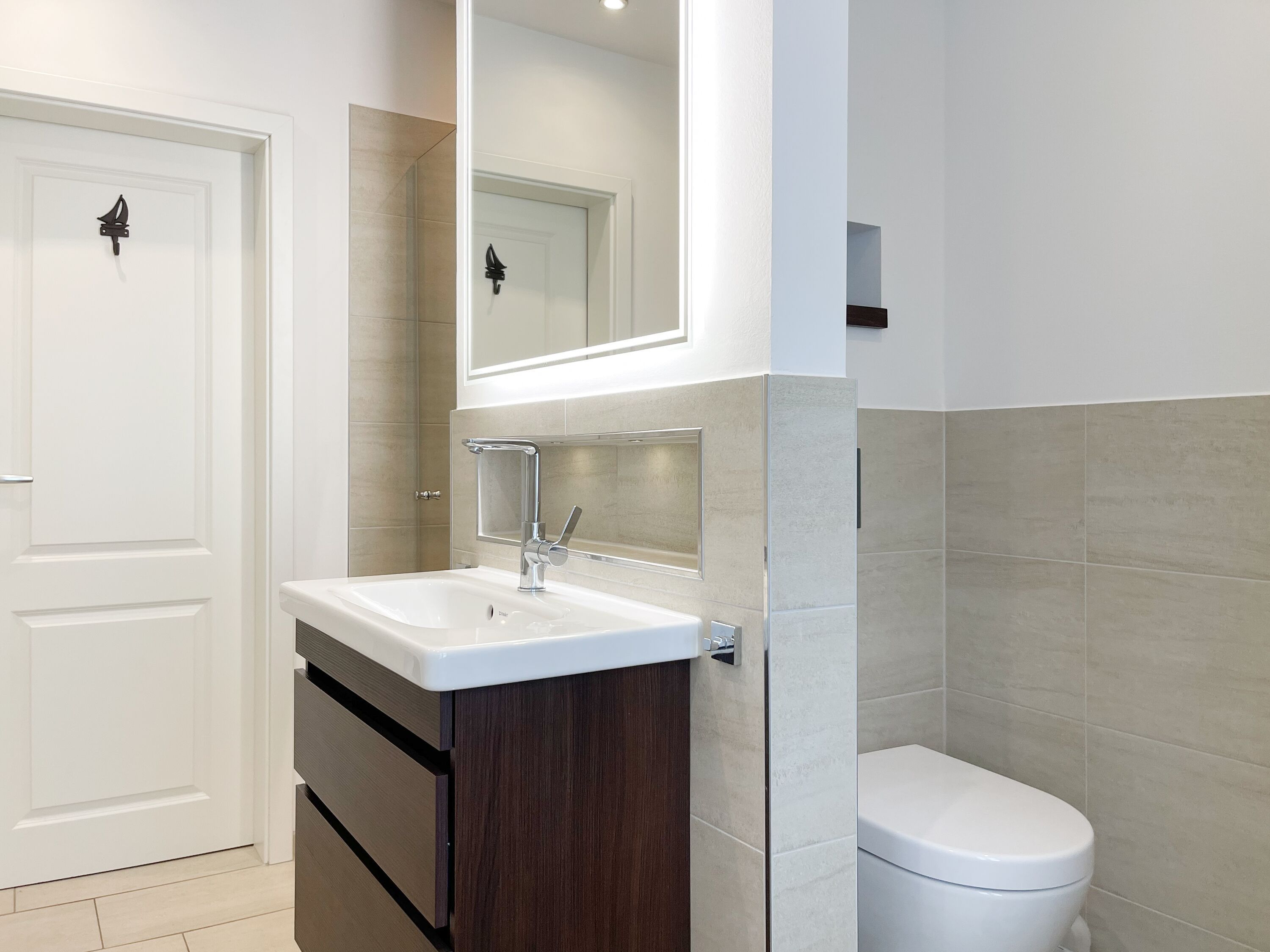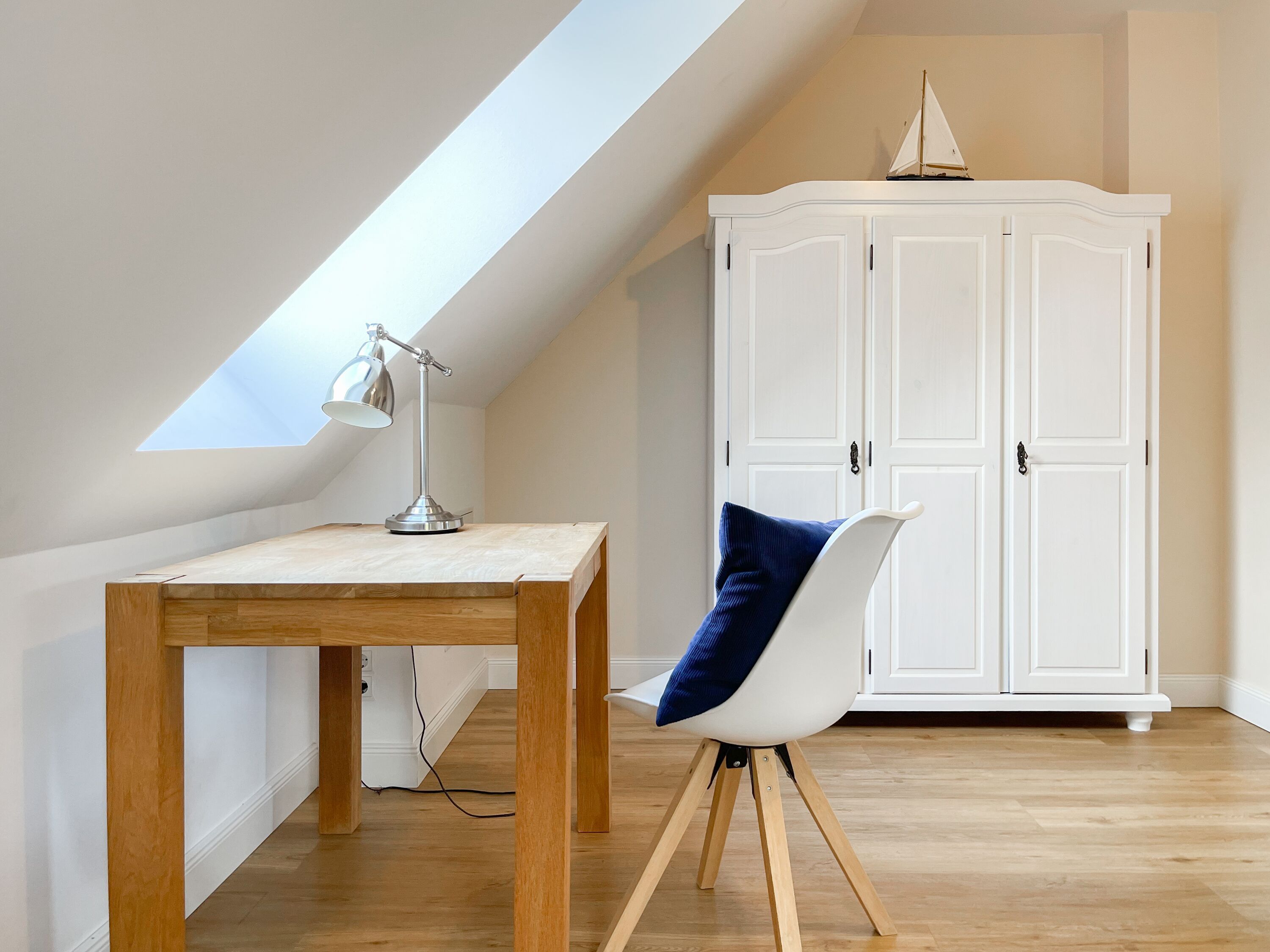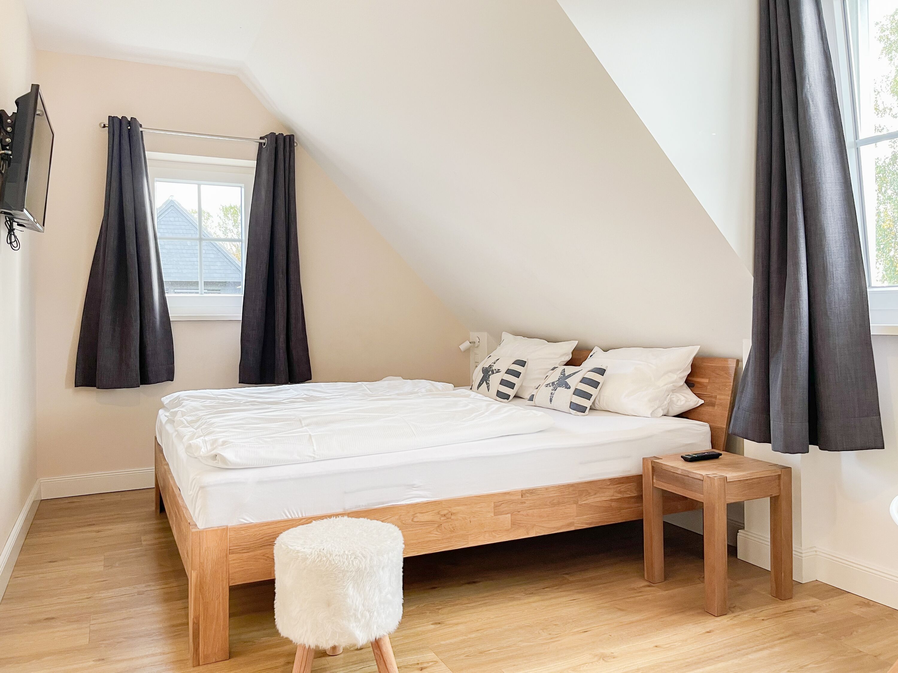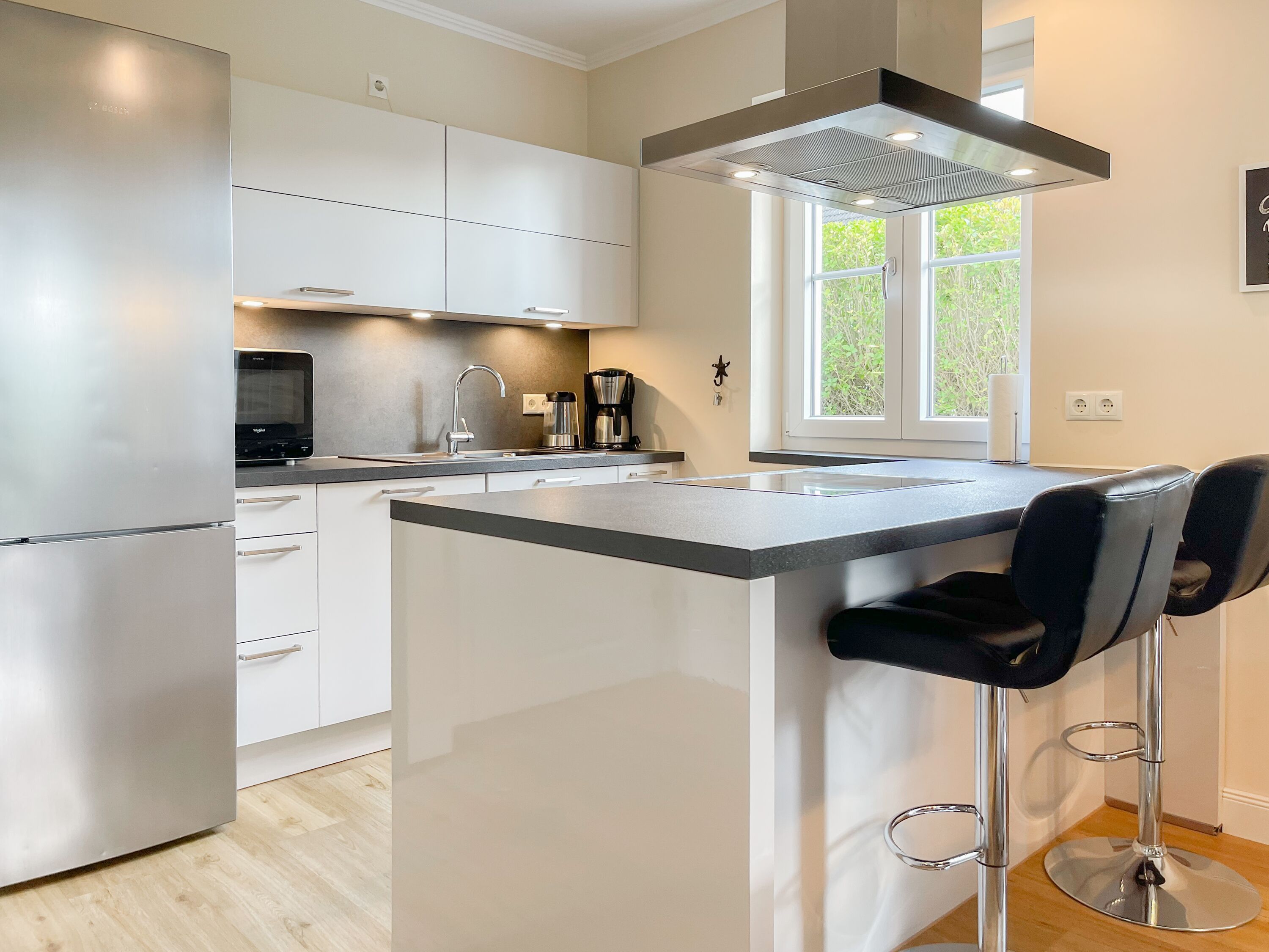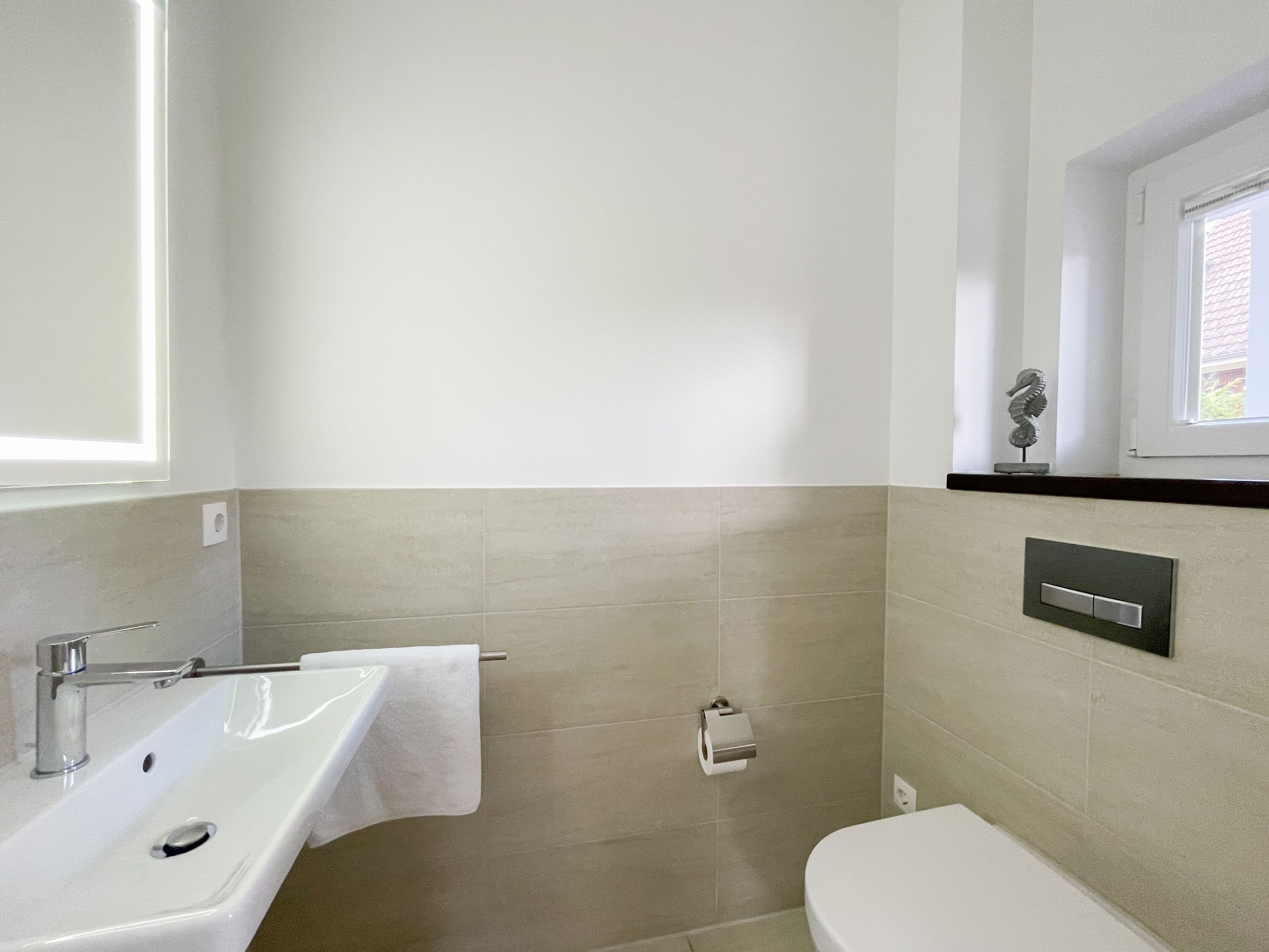 Es erwartet Sie ein wunderschönes Doppelhaus im Hampton Style. Sonnige Räumlichkeiten und die hochwertige Ausstattung sorgen für hohen Wohnstandard in einem schönen Ambiente. Mit 3 Schlafzimmern, einem modernen Bad mit Dusche und Badewanne sowie einem zusätzlichen Gäste WC, bietet das Haus auf  75 qm Wohnfläche ausreichend Raum für 5 Personen, um einen erholsamen Ostseeurlaub ganz nah am Strand zu verbringen. Im Erdgeschoss erwartet Sie ein gemütlich eingerichteter Wohnbereich mit Sofa, TV und Kaminofen, ein anschließender Essbereich sowie eine offene Einbauküche in bester Ausstattung zum gemeinsamen Kochen. Die vorgelagerte überdachte Veranda in Südausrichtung mit Garten ist ein herrlicher Platz zum Entspannen oder für Outdoor Aktivitäten. Ein Schlafzimmer, ausgestattet mit einem Einzelbett (90x200) und einer Kommode  sowie ein Gäste WC, sind ebenfalls im Erdgeschoss untergebracht. Im Obergeschoss gibt es zwei separate Schlafzimmer, eines ist mit einem Doppelbett (180x200), einem Kleiderschrank und einem weiteren  TV ausgestattet. Das andere ist mit 2 Einzelbetten (90x200), einem Kleiderschrank und einem Schreibtisch für das Homeoffice eingerichtet. Das hochwertige Bad mit Badewanne, Dusche und integrierter Waschmaschine, ist modern und lichtdurchflutet. Die Fenster der Schlafzimmer lassen sich abdunkeln (keine Blackout Verdunkelung). WLAN steht selbstverständlich zur Verfügung.