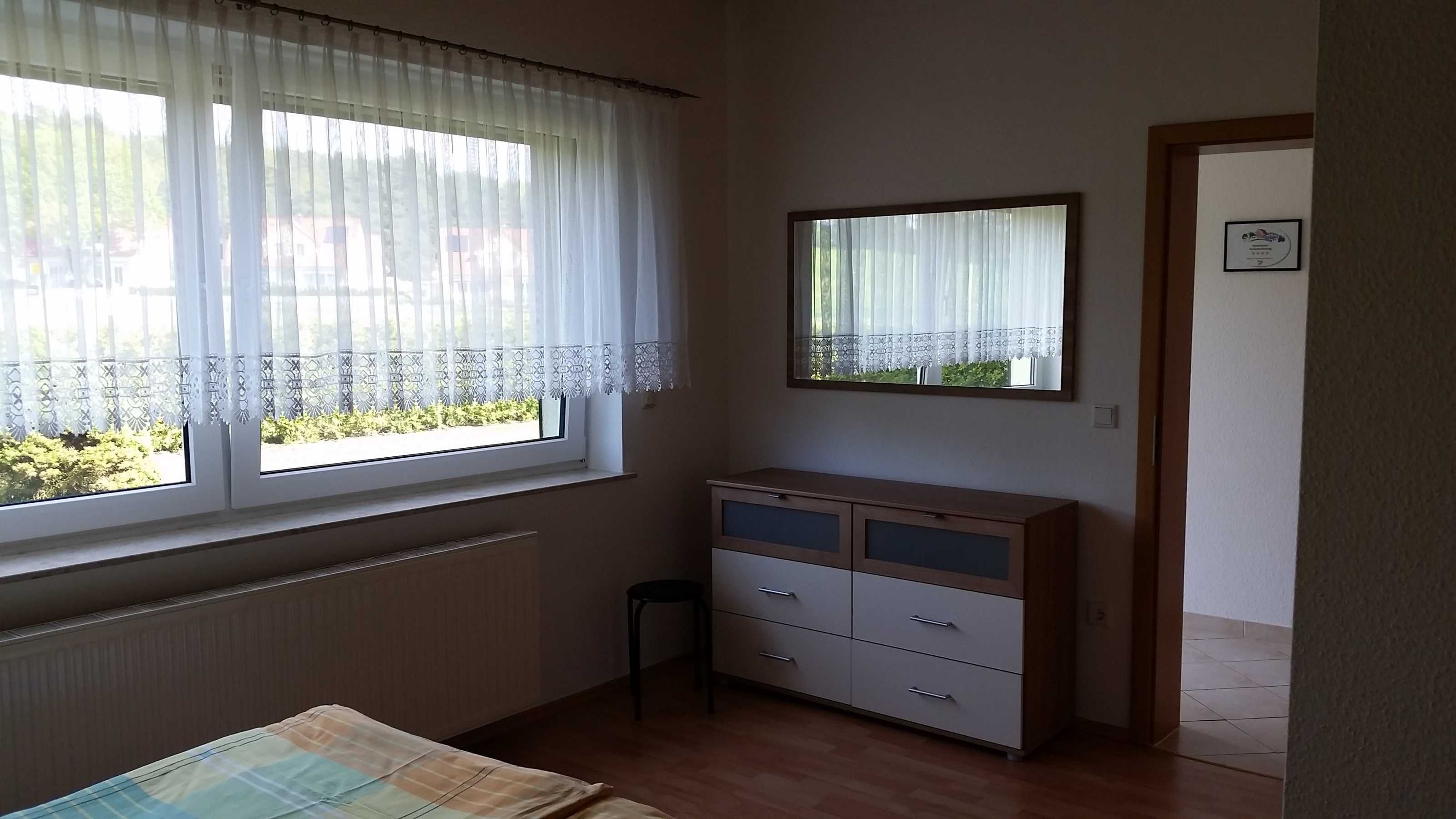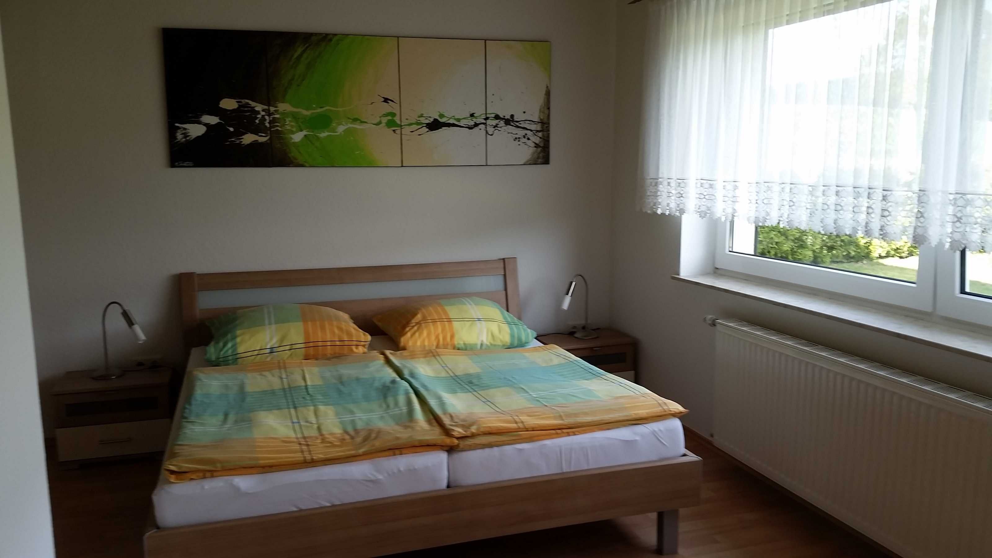 Das Schlafzimmer hat ein Doppelbett, Kommode und Kleiderschrank. Das Bad, Dusch und WC. Außenrollos und Insektenschutzgitter