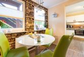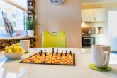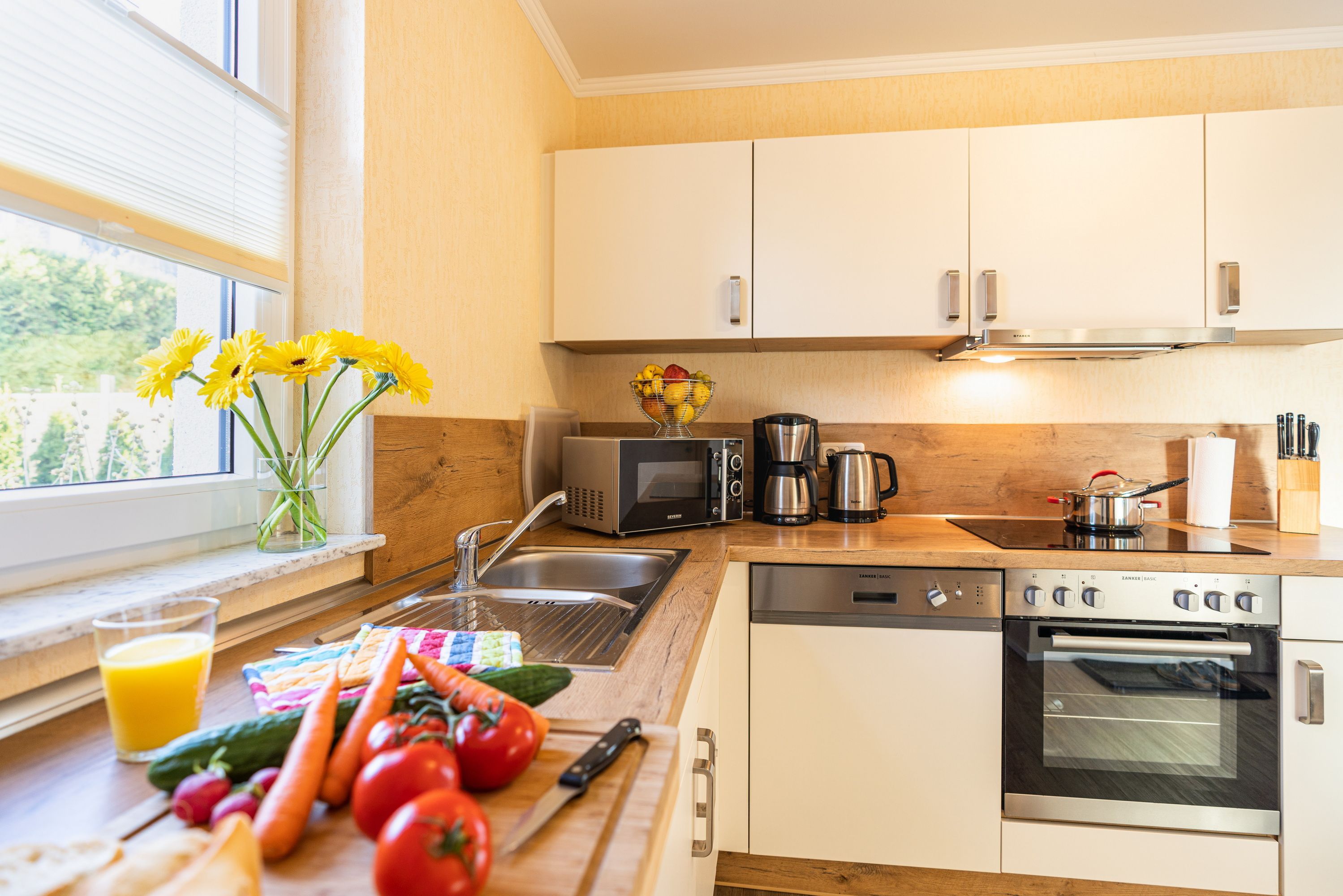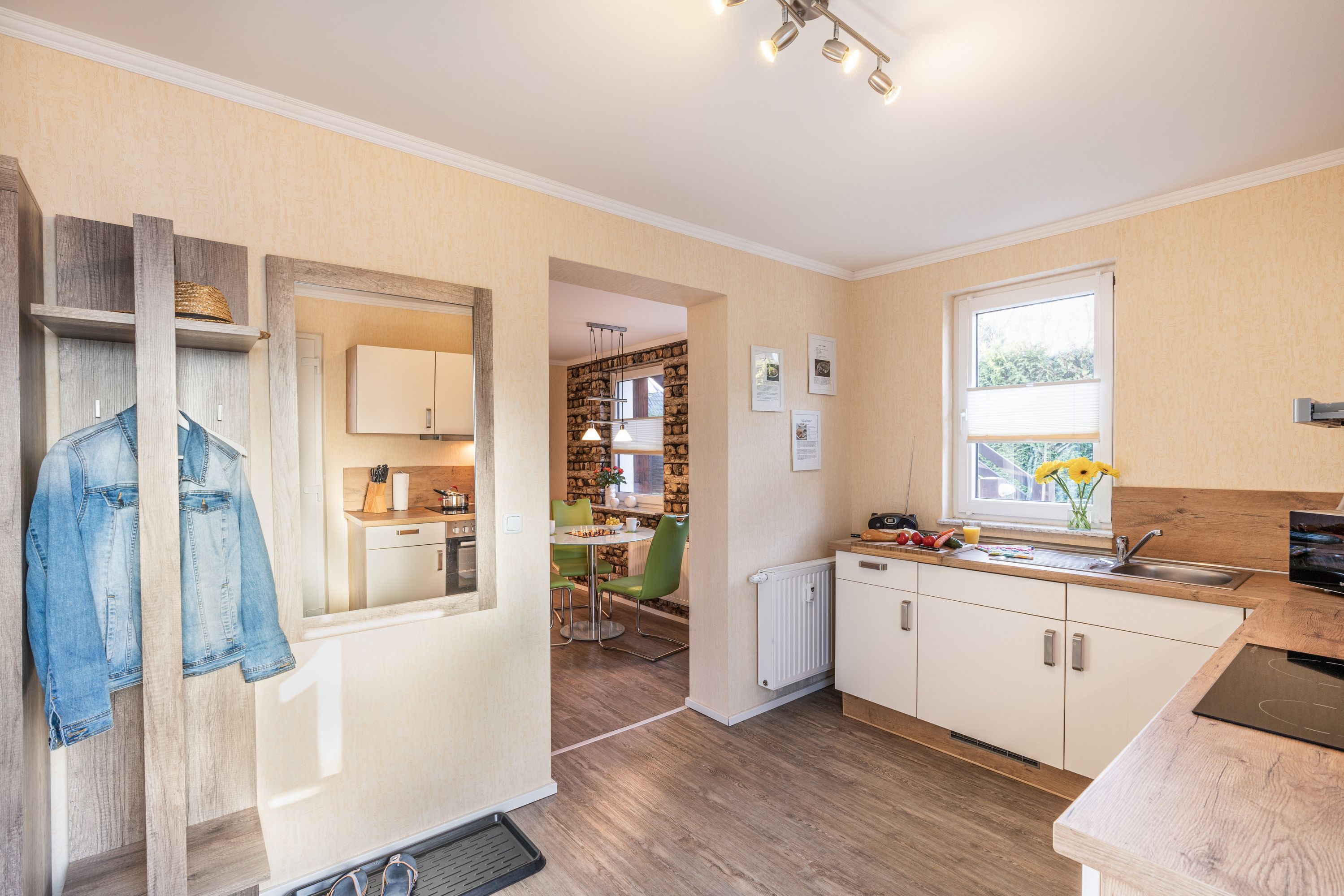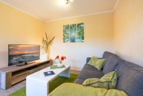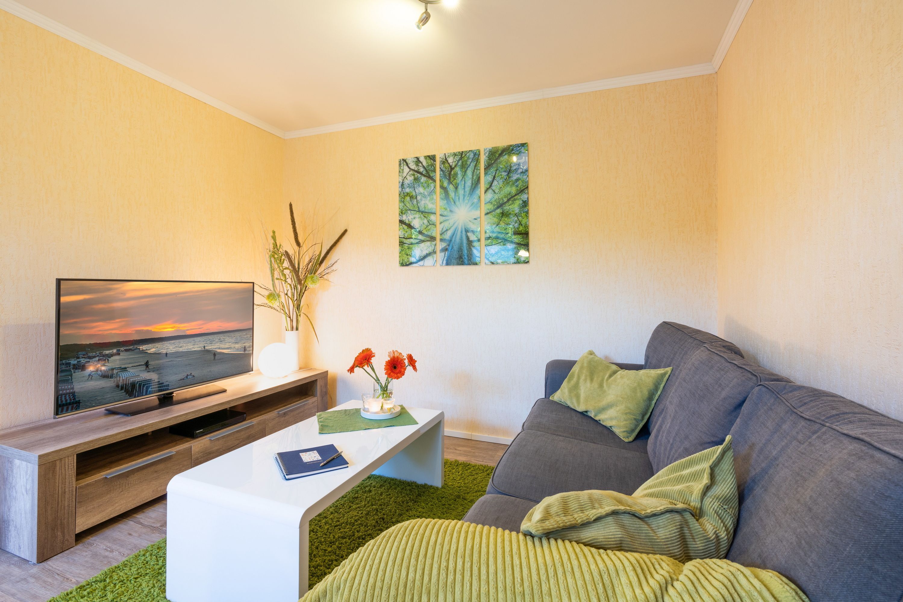 Der Wohnraum ist in hellen Farben gehalten. Sofa und FlatTV sowie ein Esstisch für zwei Personen laden zum Erholen, Entspannen und Schlemmen ein. Die separate Küche ist mit allem (Backofen, Kühlschrank mit Gefrierfach, Geschirrspüler, Mikrowelle, Wasserkocher, Toaster, Kaffeemaschine) ausgestattet, was Sie für die Zubereitung Ihrer Lieblingsspeisen benötigen.