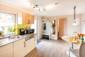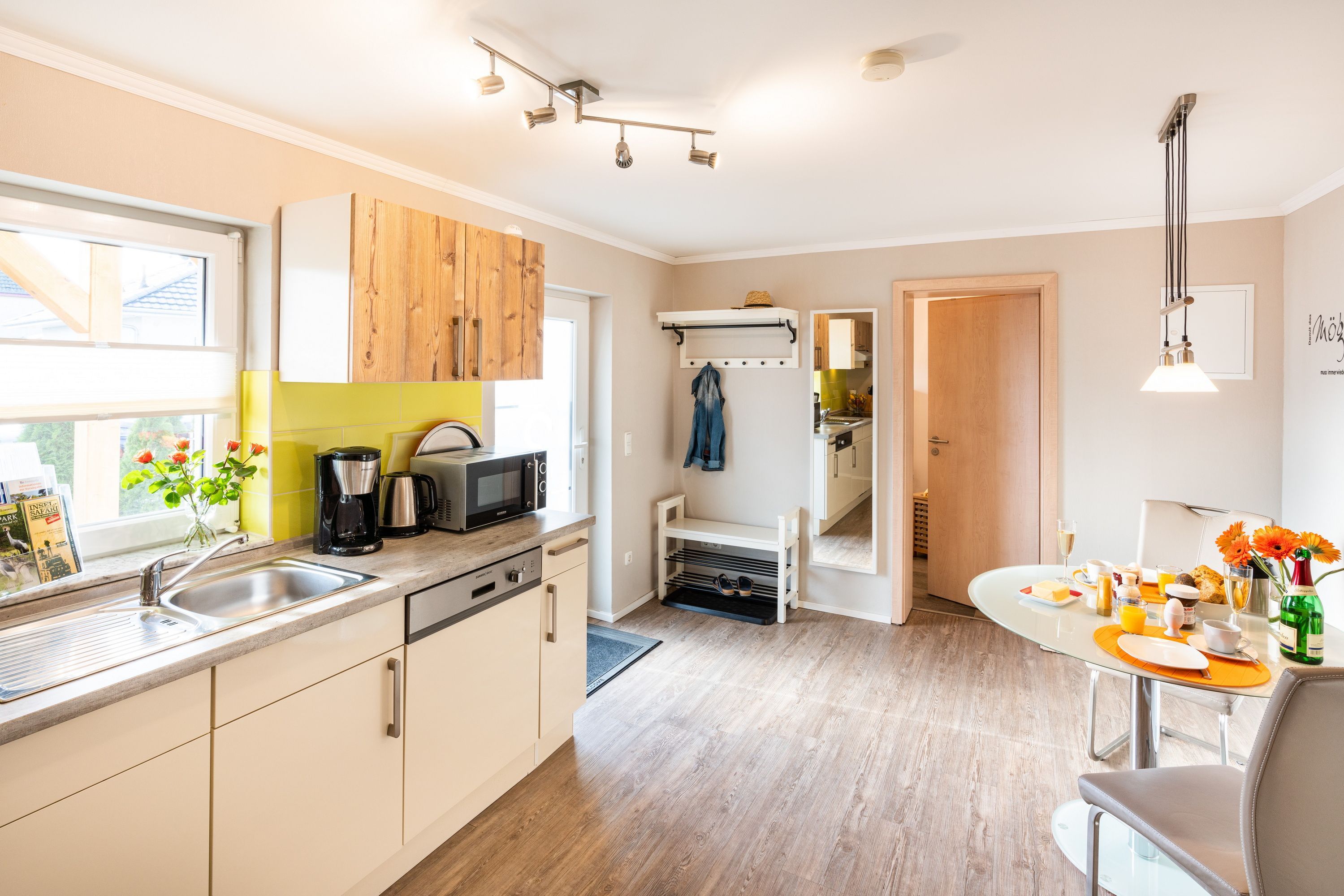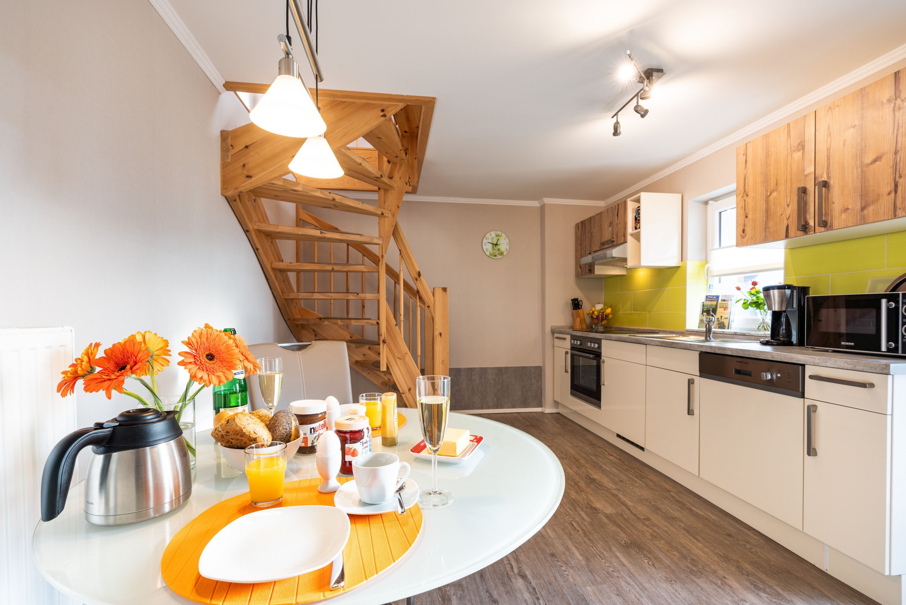 Im Erdgeschoss verfügt das Appartement über eine vollausgestatte Küchenzeile mit Ceranfeld, Backofen, Kühlschrank mit Gefrierfach, Geschirrspüler, Mikrowelle, Wasserkocher, Toaster, Kaffeemaschine und einen Essplatz für 2 Personen. Das Badezimmer, welches sich ebenfalls im Erdgeschoss befindet, ist mit Dusche, WC und einem Haartrockner ausgestattet.