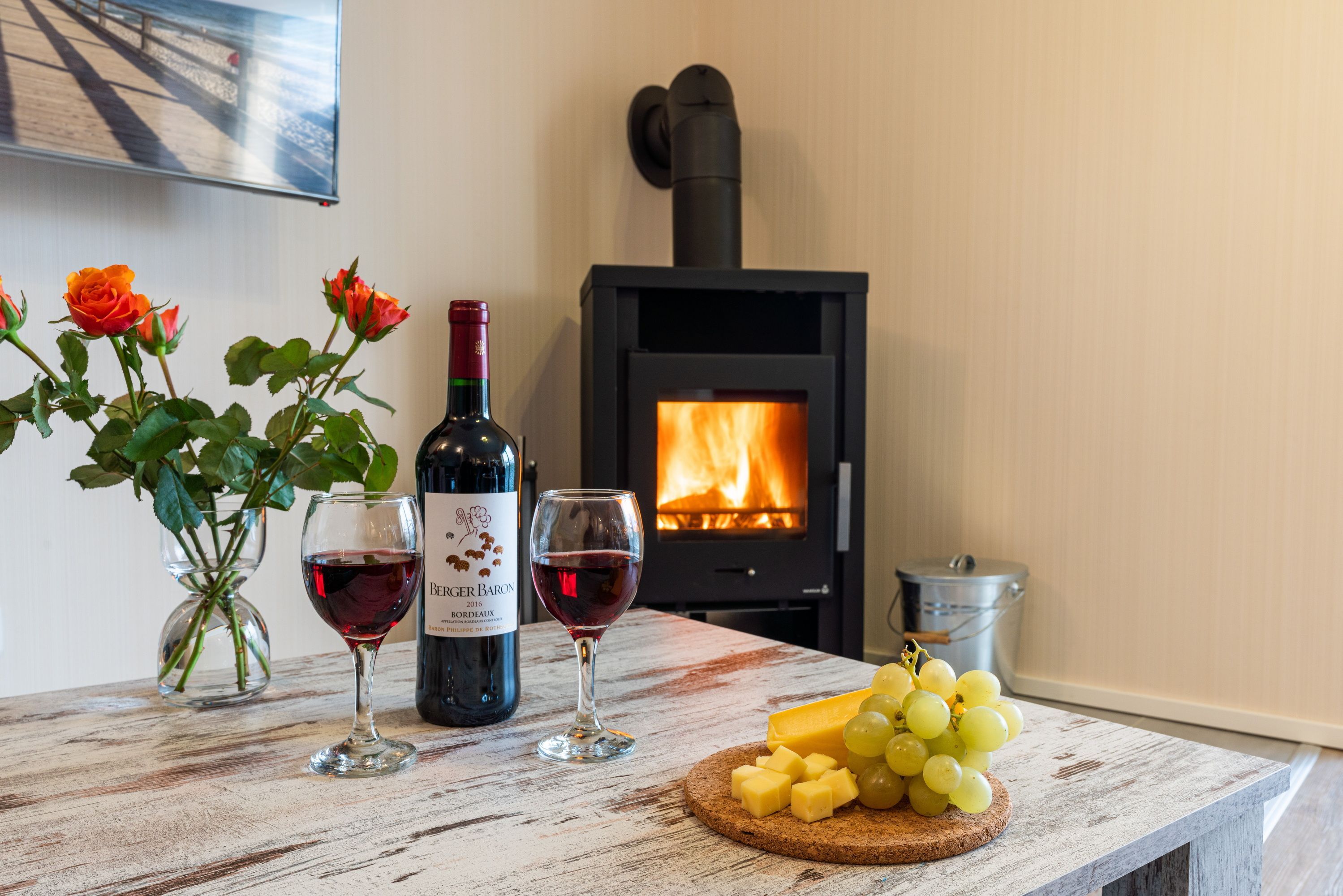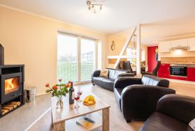 Im großzügigen Wohnbereich erwarten Sie eine bequeme Sofalandschaft: FlatTV und ein DVD-Player stehen für die unterhaltsamen Stunden bereit. Für die romantischen Momente im Urlaub sorgt der im Wohnbereich integrierte Kamin. Die Küchenzeile mit Essecke für 4 Personen lässt keine Wünsche offen: Kühlschrank mit Gefrierfach, Ceran-Kochfeld, Backofen, Mikrowelle, Geschirrspülmaschine, Kaffeemaschine, Toaster und Wasserkocher, u.v.m.