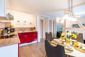 Bis zu vier Personen und ein Kleinkind im Alter von bis zu 3 Jahren verbringen auf 60 Quadratmetern ihren wohlverdienten Urlaub im Obergeschoss des Ferienhauses „Usedomer Flaschenpost“ im Appartement Nr. 5.