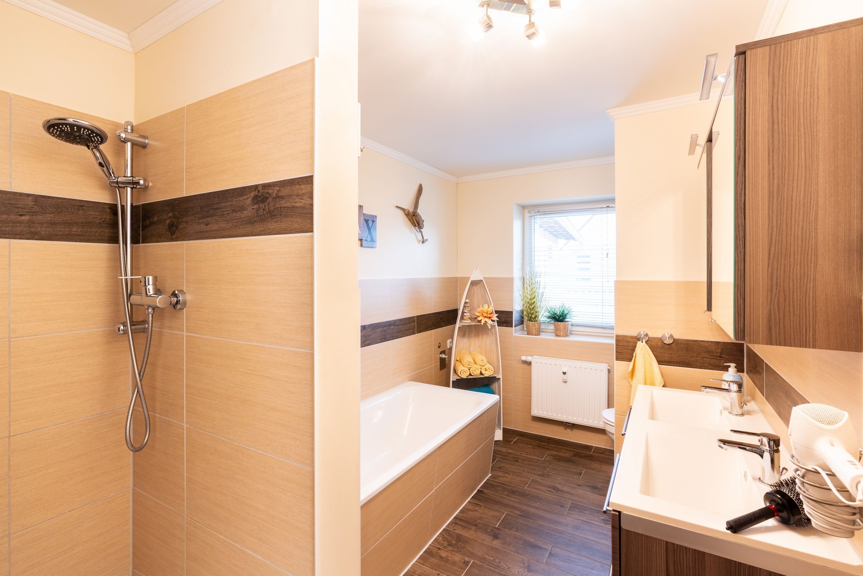 Damit Sie Ihre wohlverdiente Urlaubszeit bereits am Anreisetag in vollen Zügen genießen können, haben wir das Bett für Sie und das für Ihre lieben Mitreisenden bereits bezogen und ein Duschtuch sowie ein kleines Handtuch bereitgelegt. Das Badezimmer mit Dusche und Badewanne sowie einem Doppelwaschtisch und einem Haartrockner runden den Urlaubskomfort dieses Appartements ab.