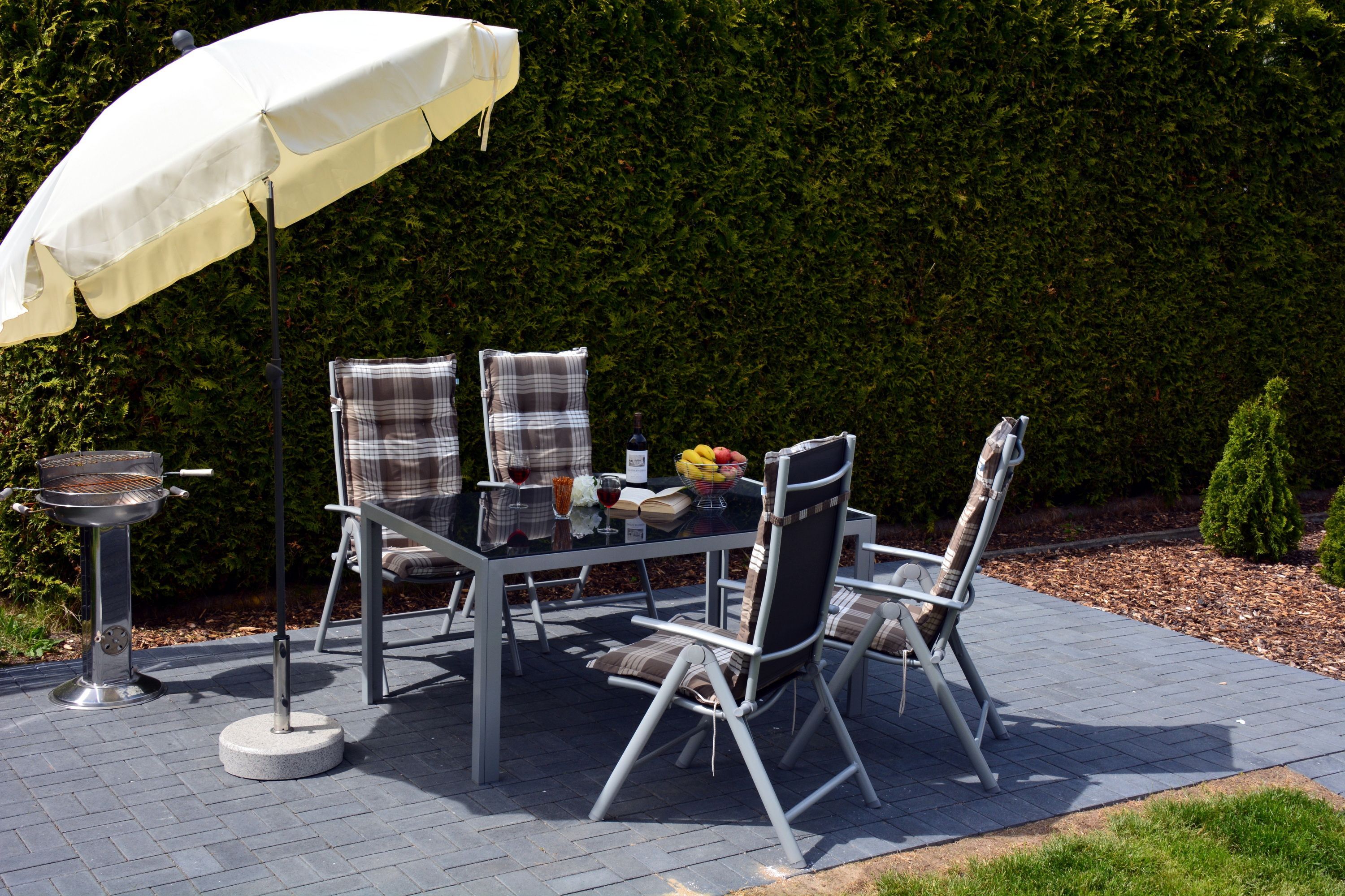 Auf dem Grundstück lädt eine gemütliche Sitzecke im Grünen mit Südwestausrichtung mit eigenem Grill zum Ausklingen des erlebnisreichen Urlaubstages bei einem sommerlichen Abendbrot ein.